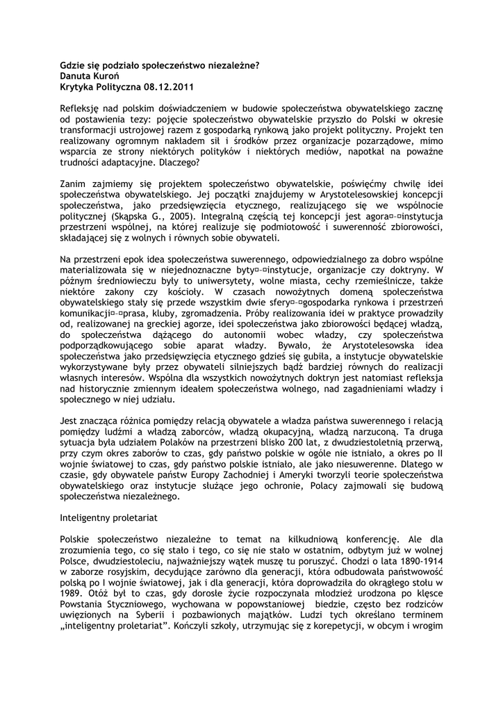 Gdzie się podziało społeczeństwo niezależne? Danuta Kuroń Krytyka Polityczna 08.12.2011 Refleksję nad polskim doświadczeniem w budowie społeczeństwa obywatelskiego zacznę od postawienia tezy: pojęcie społeczeństwo obywatelskie przyszło do Polski w okresie transformacji ustrojowej razem z gospodarką rynkową jako projekt polityczny. Projekt ten realizowany ogromnym nakładem sił i środków przez organizacje pozarządowe, mimo wsparcia ze strony niektórych polityków i niektórych mediów, napotkał na poważne trudności adaptacyjne. Dlaczego? Zanim zajmiemy się projektem społeczeństwo obywatelskie, poświęćmy chwilę idei społeczeństwa obywatelskiego. Jej początki znajdujemy w Arystotelesowskiej koncepcji społeczeństwa, jako przedsięwzięcia etycznego, realizującego się we wspólnocie politycznej (Skąpska G., 2005). Integralną częścią tej koncepcji jest agora – instytucja przestrzeni wspólnej, na której realizuje się podmiotowość i suwerenność zbiorowości, składającej się z wolnych i równych sobie obywateli. Na przestrzeni epok idea społeczeństwa suwerennego, odpowiedzialnego za dobro wspólne materializowała się w niejednoznaczne byty – instytucje, organizacje czy doktryny. W późnym średniowieczu były to uniwersytety, wolne miasta, cechy rzemieślnicze, także niektóre zakony czy kościoły. W czasach nowożytnych domeną społeczeństwa obywatelskiego stały się przede wszystkim dwie sfery – gospodarka rynkowa i przestrzeń komunikacji – prasa, kluby, zgromadzenia. Próby realizowania idei w praktyce prowadziły od, realizowanej na greckiej agorze, idei społeczeństwa jako zbiorowości będącej władzą, do społeczeństwa dążącego do autonomii wobec władzy, czy społeczeństwa podporządkowującego sobie aparat władzy. Bywało, że Arystotelesowska idea społeczeństwa jako przedsięwzięcia etycznego gdzieś się gubiła, a instytucje obywatelskie wykorzystywane były przez obywateli silniejszych bądź bardziej równych do realizacji własnych interesów. Wspólna dla wszystkich nowożytnych doktryn jest natomiast refleksja nad historycznie zmiennym ideałem społeczeństwa wolnego, nad zagadnieniami władzy i społecznego w niej udziału. Jest znacząca różnica pomiędzy relacją obywatele a władza państwa suwerennego i relacją pomiędzy ludźmi a władzą zaborców, władzą okupacyjną, władzą narzuconą. Ta druga sytuacja była udziałem Polaków na przestrzeni blisko 200 lat, z dwudziestoletnią przerwą, przy czym okres zaborów to czas, gdy państwo polskie w ogóle nie istniało, a okres po II wojnie światowej to czas, gdy państwo polskie istniało, ale jako niesuwerenne. Dlatego w czasie, gdy obywatele państw Europy Zachodniej i Ameryki tworzyli teorie społeczeństwa obywatelskiego oraz instytucje służące jego ochronie, Polacy zajmowali się budową społeczeństwa niezależnego. Inteligentny proletariat Polskie społeczeństwo niezależne to temat na kilkudniową konferencję. Ale dla zrozumienia tego, co się stało i tego, co się nie stało w ostatnim, odbytym już w wolnej Polsce, dwudziestoleciu, najważniejszy wątek muszę tu poruszyć. Chodzi o lata 1890-1914 w zaborze rosyjskim, decydujące zarówno dla generacji, która odbudowała państwowość polską po I wojnie światowej, jak i dla generacji, która doprowadziła do okrągłego stołu w 1989. Otóż był to czas, gdy dorosłe życie rozpoczynała młodzież urodzona po klęsce Powstania Styczniowego, wychowana w popowstaniowej biedzie, często bez rodziców uwięzionych na Syberii i pozbawionych majątków. Ludzi tych określano terminem „inteligentny proletariat”. Kończyli szkoły, utrzymując się z korepetycji, w obcym i wrogim państwie rosyjskiego cara, bez stałych środków do życia, tworzyli siłami społecznymi polskie niezależne instytucje, przede wszystkim instytucje kultury. Powstał w tym czasie, utrzymujący się z prenumeraty, potężny, generujący publiczną dyskusję ruch wydawniczy wydający czasopisma społeczno-kulturalne i naukowe, działający w prywatnych mieszkaniach i utrzymujący się ze składek społecznych Uniwersytet Latający oraz Towarzystwo Kursów Naukowych prowadzące środkami społecznymi poważny ruch naukowy, ze składek społecznych zbudowano Filharmonię. Powstał ruch samokształceniowy młodzieży szkolnej, ruch społeczno-oświatowy prowadzący szkółki elementarne dla dzieci robotniczych i chłopskich oraz czytelnie ludowe, ruch stowarzyszeniowy. To w tym czasie powstała idea szklanych domów Żeromskiego, która się zmaterializowała w międzywojniu na Żoliborzu w postaci Warszawskiej Spółdzielni Mieszkaniowej i idea Rzeczpospolitej samorządnej, podjęta później przez związek zawodowy „Solidarność”. Ruch ten miał swoją kontynuację w dwudziestoleciu międzywojennym i w niezwykły sposób objawił się w czasie II wojny światowej, gdy powstało, nie mające odpowiednika w innych krajach okupowanej Europy, Polskie Państwo Podziemne, które stworzyło nie tylko struktury polityczne i armię, ale także system oświaty na wszystkich poziomach od szkół powszechnych po uniwersytety, życie kulturalne, potężny ruch wydawniczy, system pomocy społecznej. Do tej tradycji niezależnego społeczeństwa nawiązało środowisko opozycji demokratycznej, które stworzyło w 1976 roku Komitet Obrony Robotników, następnie Komitet Samoobrony Społecznej, potężny drugoobiegowy ruch wydawniczy i niezależną informację, zgrupowało najwybitniejszych intelektualistów w Towarzystwie Kursów Naukowych i Uniwersytecie Latającym. Z tego ruchu wyszli późniejsi przywódcy i doradcy robotniczej „Solidarności”, którzy sprawdzili się w podziemiu i współtworzyli kolejny ruch społeczny, prowadzący nas do okrągłego stołu, wyborów w 1989 roku i odzyskanej niepodległości. Rywalizacja o grant Środowisko zaangażowanej inteligencji, a także związek zaw