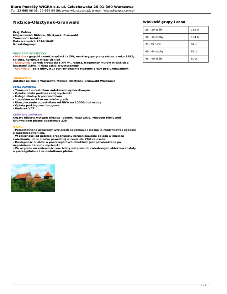 Biuro Podróży WIGRA s.c. ul. Człuchowska 25 01-360 Warszawa Tel. 22 665 06 06, 22 664 94 86, www.wigra.com.pl, e-mail: [email protected] Nidzica-Olsztynek-Grunwald Kraj: Polska Miejscowość: Nidzica, Olsztynek, Grunwald Transport: Autokar Data ważności: 2016-10-02 Nr katalogowy: PROGRAM WYCIECZKI - Nidzica - gotycki zamek krzyżacki z XIV, neoklasycystyczny ratusz z roku 1842; spichrz, kolejowa wieża ciśnień - Olsztynek – zamek krzyżacki z XIV w., ratusz, fragmenty murów miejskich z basztami (XIVw.); Huta szkła artystycznego - Grunwald – pole bitwy z 1410r; zwiedzanie Muzeum Bitwy pod Grunwaldem Wielkość grupy i cena 25 - 29 osób 112 zł 30 - 34 osoby 104 zł 35- 39 osób 94 zł 40 - 44 osoby 86 zł 45 - 49 osób 80 zł TRANSPORT Autokar na trasie Warszawa-Nidzica-Olsztynek-Grunwald-Warszawa CENA ZAWIERA - Transport uczestników autokarem wycieczkowym - Opiekę pilota podczas całej wycieczki - Usługi lokalnych przewodników - 1 opiekun na 15 uczestników gratis - Ubezpieczenie uczestników od NNW na 10000zł od osoby - Opłaty parkingowe i drogowe - Podatek VAT CENA NIE ZAWIERA Koszty biletów wstępu: Nidzica - zamek, Huta szkła, Muzeum Bitwy pod Grunwaldem płatne dodatkowo 22zł UWAGI - Przedstawione programy wycieczek są ramowe i można je modyfikować zgodnie z zapotrzebowaniem, - W zależności od potrzeb proponujemy zorganizowanie obiadu w miejscu zwiedzania lub w drodze powrotnej w cenie ok. 20zł za osobę - Dostępność biletów w poszczególnych obiektach jest potwierdzana po uzgodnieniu terminu wycieczki - Ze względu na zmienność cen, bilety wstępów do zwiedzanych obiektów zostały wyszczególnione i są dodatkowo płatne 1/1 Powered by TCPDF (www.tcpdf.org)
