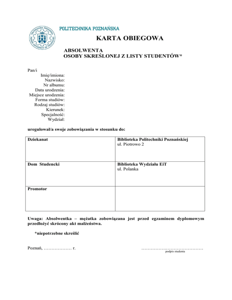 KARTA OBIEGOWA ABSOLWENTA OSOBY SKREŚLONEJ Z LISTY STUDENTÓW* Pan/i Imię/imiona: Nazwisko: Nr albumu: Data urodzenia: Miejsce urodzenia: Forma studiów: Rodzaj studiów: Kierunek: Specjalność: Wydział: uregulował/a swoje zobowiązania w stosunku do: Dziekanat Biblioteka Politechniki Poznańskiej ul. Piotrowo 2 Dom Studencki Biblioteka Wydziału EiT ul. Polanka Promotor Uwaga: Absolwentka – mężatka zobowiązana jest przed egzaminem dyplomowym przedłożyć skrócony akt małżeństwa. *niepotrzebne skreślić Poznań, ……………… r. …………….…………………… podpis studenta