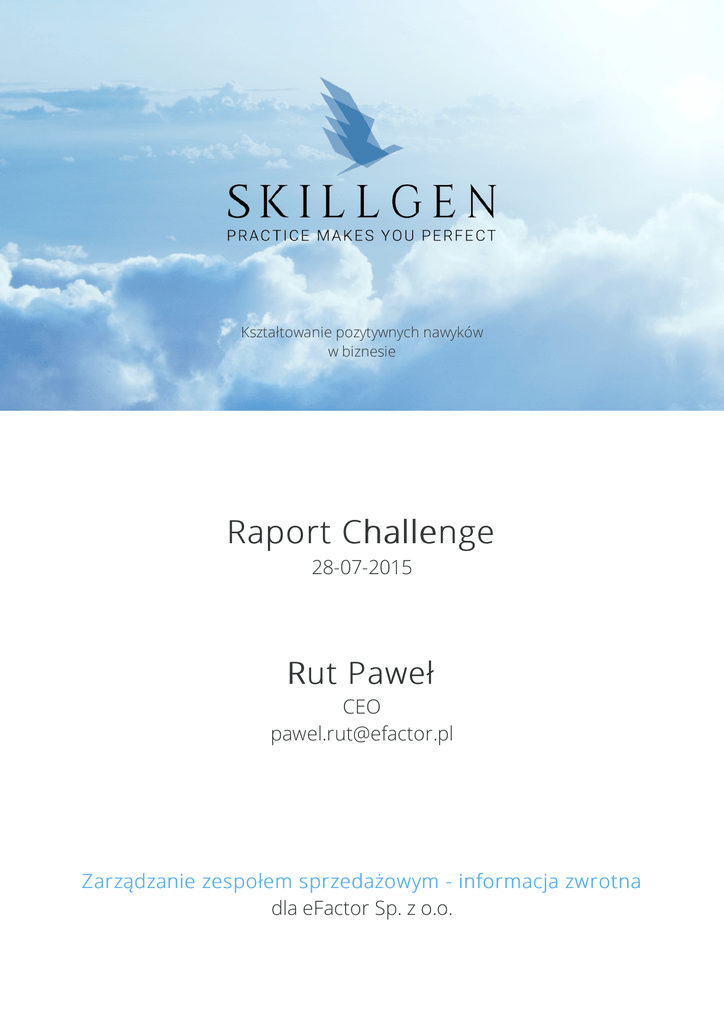 Kształtowanie pozytywnych nawyków w biznesie Raport Challenge 28-07-2015 Rut Paweł CEO [email protected] Zarządzanie zespołem sprzedażowym - informacja zwrotna dla eFactor Sp. z o.o. Raport Challenge Liczba podejść: 5 Liczba parametrów wyzwania: 2 Liczba etapów procesu: 7 Sytuacja problemowa Na Twoją służbową skrzynkę odbiorczą przychodzą dwie wiadomości od niezadowolonych klientów. Okazało się, że jeden z Twoich pracowników popełnił istotne błędy podczas wystawiania faktur. Jesteś zaskoczony, gdy dowiadujesz się, że jest to pomyłka najbardziej doświadczonego sprzedawcy w dziale. Pamiętając o jego licznych sukcesach oraz wysokich wynikach sprzedażowych musisz umiejętnie udzielić mu informacji zwrotnej. Twoim zadaniem będzie przeprowadzenie rozmowy z pracownikiem w optymalny sposób, stosując reguły profesjonalnego feedbacku. Sytuacja w której zostaniesz postawiony to reprezentatywny przykład udzielania informacji zwrotnej. Opanuj dobrze przedstawiony w scenariuszu schemat rozmowy, aby umiejętnie radzić sobie z podobnymi sytuacjami w przyszłości. Cel produktu Celem szkolenia jest przeprowadzenie rozmowy z pracownikiem w optymalny sposób, stosując reguły profesjonalnego feedbacku. Wyzwaniem jest przeprowadzenie rozmowy na tyle sprawnie, by zachować autorytet w oczach podwładnego. Doprowadź spotkanie do końca tak, aby nie zmniejszyć u sprzedawcy motywacji do pracy. skillgen.eu 2z7 Wyniki użytkownika GRATULACJE! ukończyłeś wyzwanie w 5 podejściu z wynikiem: Motywacja do Twój autorytet pracy 90% skillgen.eu 90% 3z7 Wynik podejścia 4 85% Motywacja do pracy 85% Twój autorytet Bezskuteczne działanie Wynik podejścia 3 85% Motywacja do pracy 85% Twój autorytet Bezskuteczne działanie Wynik podejścia 2 40% Motywacja do pracy 15% Twój autorytet Sromotna porażka skillgen.eu 4z7 Wynik podejścia 1 50% Motywacja do pracy 20% Twój autorytet Sromotna porażka skillgen.eu 5z7 Etapy procesu 1. Odpowiednie warunki rozmowy Istotne jest to, w jaki sposób zapraszasz pracownika na rozmowę: czy ustalisz termin spotkania razem z nim, czy narzucisz mu swoją propozycję. W ramach tego kroku znajduje się również powitanie rozmówcy na początku rozmowy. Pamiętaj, aby unikać wszelkich sytuacji, które mogą przeszkodzić w płynnym przeprowadzeniu spotkania. Liczba popełnionych błędów: 6 2. Cel spotkania Na początku rozmowy powiedz pracownikowi w jakiej sprawie go zapraszasz. Zrób to krótko i konkretnie. Unikaj długich wstępów. Liczba popełnionych błędów: 1 3. Pozytywne rozpoczęcie Pierwsza Twoja uwaga jako przełożonego niech będzie pozytywna. Znajdź taki aspekt w pracy Twojego rozmówcy, który zasługuje na pochwałę. Powiedz to krótko i konkretnie. Liczba popełnionych błędów: 3 4. Działania nieakceptowane Komunikujesz pracownikowi te zachowania, których nie akceptujesz w pracy. Mówisz o nich w sposób, który go nie obraża. Twój styl komunikacji pozbawiony jest moralizowania i oskarżania. Liczba popełnionych błędów: 1 skillgen.eu 6z7 5. Możliwość wyjaśnienia Po wypowiedzeniu wszystkich Twoich uwag oddajesz głos pracownikowi. Uważnie wysłuchujesz wtedy wszystkich jego argumentów. Parafrazuj, upewniaj się, że dobrze rozumiesz. Liczba popełnionych błędów: 0 6. Własne oczekiwania Potrafisz zaradzić pojawiającym się problemom w pracy. Wyrażasz krótko i zrozumiale dla pracownika Twoje oczekiwania i zalecenia. Dotyczą one tego jak naprawić szkody, jeśli już jakieś powstały oraz jakie podjąć działania aby w przyszłości nie wystąpił podobny problem. Liczba popełnionych błędów: 0 7. Pozytywne zakończenie Na koniec spotkania podziękuj pracownikowi za rozmowę i dodaj jakąś pozytywną uwagę na jego temat. Nie może to być jakieś ogólne stwierdzenie, ale precyzyjnie dopasowana pochwała dla tego właśnie pracownika. Liczba popełnionych błędów: 0 skillgen.eu 7z7