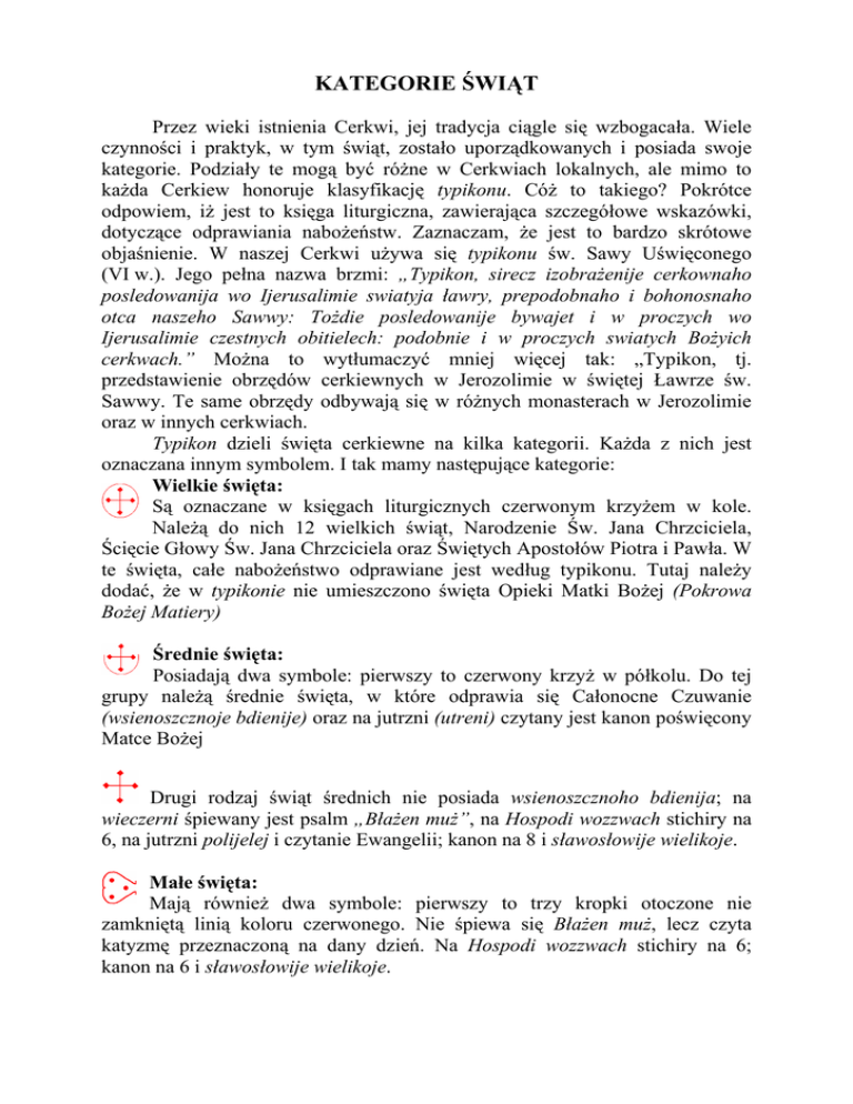 KATEGORIE ŚWIĄT Przez wieki istnienia Cerkwi, jej tradycja ciągle się wzbogacała. Wiele czynności i praktyk, w tym świąt, zostało uporządkowanych i posiada swoje kategorie. Podziały te mogą być różne w Cerkwiach lokalnych, ale mimo to każda Cerkiew honoruje klasyfikację typikonu. Cóż to takiego? Pokrótce odpowiem, iż jest to księga liturgiczna, zawierająca szczegółowe wskazówki, dotyczące odprawiania nabożeństw. Zaznaczam, że jest to bardzo skrótowe objaśnienie. W naszej Cerkwi używa się typikonu św. Sawy Uświęconego (VI w.). Jego pełna nazwa brzmi: „Typikon, sirecz izobrażenije cerkownaho posledowanija wo Ijerusalimie swiatyja ławry, prepodobnaho i bohonosnaho otca naszeho Sawwy: Tożdie posledowanije bywajet i w proczych wo Ijerusalimie czestnych obitielech: podobnie i w proczych swiatych Bożyich cerkwach.” Można to wytłumaczyć mniej więcej tak: „Typikon, tj. przedstawienie obrzędów cerkiewnych w Jerozolimie w świętej Ławrze św. Sawwy. Te same obrzędy odbywają się w różnych monasterach w Jerozolimie oraz w innych cerkwiach. Typikon dzieli święta cerkiewne na kilka kategorii. Każda z nich jest oznaczana innym symbolem. I tak mamy następujące kategorie: Wielkie święta: Są oznaczane w księgach liturgicznych czerwonym krzyżem w kole. Należą do nich 12 wielkich świąt, Narodzenie Św. Jana Chrzciciela, Ścięcie Głowy Św. Jana Chrzciciela oraz Świętych Apostołów Piotra i Pawła. W te święta, całe nabożeństwo odprawiane jest według typikonu. Tutaj należy dodać, że w typikonie nie umieszczono święta Opieki Matki Bożej (Pokrowa Bożej Matiery) Średnie święta: Posiadają dwa symbole: pierwszy to czerwony krzyż w półkolu. Do tej grupy należą średnie święta, w które odprawia się Całonocne Czuwanie (wsienoszcznoje bdienije) oraz na jutrzni (utreni) czytany jest kanon poświęcony Matce Bożej Drugi rodzaj świąt średnich nie posiada wsienoszcznoho bdienija; na wieczerni śpiewany jest psalm „Błażen muż”, na Hospodi wozzwach stichiry na 6, na jutrzni polijelej i czytanie Ewangelii; kanon na 8 i sławosłowije wielikoje. Małe święta: Mają również dwa symbole: pierwszy to trzy kropki otoczone nie zamkniętą linią koloru czerwonego. Nie śpiewa się Błażen muż, lecz czyta katyzmę przeznaczoną na dany dzień. Na Hospodi wozzwach stichiry na 6; kanon na 6 i sławosłowije wielikoje. Drugi symbol jest koloru czarnego. W święta należące do tego grona czytamy stichiry na Hospodi wozzwach na 6, kanon na 6 Są również święta nieposiadające żadnego symbolu. W te dni stichery czytamy na 3, natomiast kanon na 4.