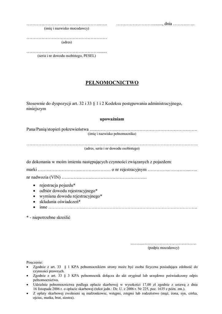 …………………………………………...…. ……………………........., dnia ……….….. (imię i nazwisko mocodawcy) ……………………………………………… (adres) …………………………………………........ (seria i nr dowodu osobistego, PESEL) PEŁNOMOCNICTWO Stosownie do dyspozycji art. 32 i 33 § 1 i 2 Kodeksu postępowania administracyjnego, niniejszym upoważniam Pana/Panią/stopień pokrewieństwa .......…………………………………………………………. (imię i nazwisko pełnomocnika) ……………………………………………………………………………………………………. (adres, seria i nr dowodu osobistego) do dokonania w moim imieniu następujących czynności związanych z pojazdem: marki …………………………………………. o nr rejestracyjnym …………...…………...….. nr nadwozia (VIN) ………………………………………………… rejestracja pojazdu* odbiór dowodu rejestracyjnego* wymiana dowodu rejestracyjnego* składania oświadczeń* inne ………………………………………………………………………………………. * - niepotrzebne skreślić ……...……………………………… (podpis mocodawcy) Pouczenie: Zgodnie z art. 33 § 1 KPA pełnomocnikiem strony może być osoba fizyczna posiadająca zdolność do czynności prawnych. Zgodnie z art. 33 § 3 KPA pełnomocnik dołącza do akt oryginał lub urzędowo poświadczony odpis pełnomocnictwa. Udzielnie pełnomocnictwa podlega opłacie skarbowej w wysokości 17,00 zł zgodnie z ustawą z dnia 16 listopada 2006 r. o opłacie skarbowej (tekst jedn.: Dz. U. z 2006 r. Nr 225, poz. 1635 z późn. zm.). Z opłaty skarbowej zwolnieni są małżonkowie, wstępni, zstępni lub rodzeństwo (mąż, żona, syn, córka, ojciec, matka, brat, siostra).