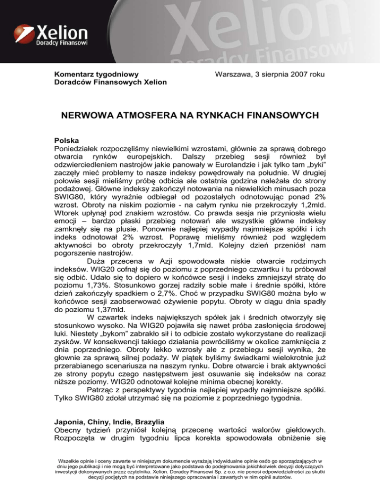 Komentarz tygodniowy Doradców Finansowych Xelion Warszawa, 3 sierpnia 2007 roku NERWOWA ATMOSFERA NA RYNKACH FINANSOWYCH Polska Poniedziałek rozpoczęliśmy niewielkimi wzrostami, głównie za sprawą dobrego otwarcia rynków europejskich. Dalszy przebieg sesji równieŜ był odzwierciedleniem nastrojów jakie panowały w Eurolandzie i jak tylko tam „byki” zaczęły mieć problemy to nasze indeksy powędrowały na południe. W drugiej połowie sesji mieliśmy próbę odbicia ale ostatnia godzina naleŜała do strony podaŜowej. Główne indeksy zakończył notowania na niewielkich minusach poza SWIG80, który wyraźnie odbiegał od pozostałych odnotowując ponad 2% wzrost. Obroty na niskim poziomie - na całym rynku nie przekroczyły 1,2mld. Wtorek upłynął pod znakiem wzrostów. Co prawda sesja nie przyniosła wielu emocji – bardzo płaski przebieg notowań ale wszystkie główne indeksy zamknęły się na plusie. Ponownie najlepiej wypadły najmniejsze spółki i ich indeks odnotował 2% wzrost. Poprawę mieliśmy równieŜ pod względem aktywności bo obroty przekroczyły 1,7mld. Kolejny dzień przeniósł nam pogorszenie nastrojów. DuŜa przecena w Azji spowodowała niskie otwarcie rodzimych indeksów. WIG20 cofnął się do poziomu z poprzedniego czwartku i tu próbował się odbić. Udało się to dopiero w końcówce sesji i indeks zmniejszył stratę do poziomu 1,73%. Stosunkowo gorzej radziły sobie małe i średnie spółki, które dzień zakończyły spadkiem o 2,7%. Choć w przypadku SWIG80 moŜna było w końcówce sesji zaobserwować oŜywienie popytu. Obroty w ciągu dnia spadły do poziomu 1,37mld. W czwartek indeks największych spółek jak i średnich otworzyły się stosunkowo wysoko. Na WIG20 pojawiła się nawet próba zasłonięcia środowej luki. Niestety „bykom” zabrakło sił i to odbicie zostało wykorzystane do realizacji zysków. W konsekwencji takiego działania powróciliśmy w okolice zamknięcia z dnia poprzedniego. Obroty lekko wzrosły ale z przebiegu sesji wynika, Ŝe głownie za sprawą silnej podaŜy. W piątek byliśmy świadkami wielokrotnie juŜ przerabianego scenariusza na naszym rynku. Dobre otwarcie i brak aktywności ze strony popytu czego następstwem jest osuwanie się indeksów na coraz niŜsze poziomy. WIG20 odnotował kolejne minima obecnej korekty. Patrząc z perspektywy tygodnia najlepiej wypadły najmniejsze spółki. Tylko SWIG80 zdołał utrzymać się na poziomie z poprzedniego tygodnia. Japonia, Chiny, Indie, Brazylia Obecny tydzień przyniósł kolejną przecenę wartości walorów giełdowych. Rozpoczęta w drugim tygodniu lipca korekta spowodowała obniŜenie się Wszelkie opinie i oceny zawarte w niniejszym dokumencie wyraŜają indywidualne opinie osób go sporządzających w dniu jego publikacji i nie mogą być interpretowane jako podstawa do podejmowania jakichkolwiek decyzji dotyczących inwestycji dokonywanych przez czytelnika. Xelion. Doradcy Finansowi Sp. z o.o. nie ponosi odpowiedzialności za skutki decyzji podjętych na podstawie niniejszego opracowania i zawartych w nim opinii autorów. indeksu Nikkei225 poniŜej poziomu 17.000 pkt. Poziom yena, który notuje wyraźny wzrost wartości od końca czerwca, znajduje się obecnie w przedziale wahań 119.4/117.7. Taka sytuacja nie sprzyja głównym eksporterom, których zyski w głównej mierze są wynikiem handlu zagranicznego. Spadek notowań wtorkowych w Stanach Zjednoczonych wraz z przeceną surowców spowodowała ponad 2% spadek cen akcji podczas środowej sesji. W ujęciu tygodnia indeks Nikkei225 stracił 1.74%. W końcówce tygodnia dobrze zachowywały się walory spółek z sektora samochodowego jak Mazda, Toyota czy Nissan na pojawiające się informację o wzroście zagranicznego popytu na samochody. Z kolei na giełdzie w Shanghaiu lipiec był bardzo dobry dla inwestorów. Po cenowych fluktuacjach akcji w maju i czerwcu, indeks SCI notował od początku lipca odreagowanie i wzrost cen poszczególnych walorów giełdowych. Od poziomu 3.600 pkt w pierwszym tygodniu lipca indeks wzrósł dynamicznie do pułapu ponad 4.500 pkt ustanawiając 3 sierpnia nowe rekordy na giełdzie. Pomogły w tym szczególnie spółki z sektora bankowego jak Huaxia Bank, Bank of China, China Minsheng Banking Corp. czy Industrial and Commercial Bank of China, które zyskiwały od 2 do 8%. W ujęciu całego bieŜącego tygodnia indeks SCI zyskał ponad 5%. Giełda w Bombaju jest dobrym przykładem, Ŝe ceny walorów giełdowych nie są skorelowane dodatnio w regionie Azji. Kiedy w okresie maja i czerwca obserwowaliśmy zmienność cen akcji w Chinach i częściowo w Japonii, to inwestorzy na giełdzie w Indiach przeŜywali zdecydowanie lepsze nastroje. Niestety światowa korekta dotknęła równieŜ i giełdę w Bombaju, która notuje gorsze wyniki począwszy od ostatniego tygodnia lipca. Na przełomie lipca i sierpnia w trakcie ostatnich pięciu sesji giełdowych największych 30 spółek skupione w koszyku indeksu BSE30 straciło zaledwie 0.5% w skutek głównie blisko 4% przeceny w środę. Ostatnio dobre wyniki notowały spółki z sektora bankowego, surowcowego i technologicznego, które przyczyniły się do przekroczenia pod koniec lipca nowego rekordu indeksu BSE30 na poziomie 15.000 pkt. Europa Zachodnia W minionym tygodniu na rynkach Eurolandu byliśmy świadkami nieco lepszych nastrojów, mimo to niepewność inwestorów była obecna na wszystkich parkietach. Główne zachodnioeuropejskie indeksy w ujęciu tygodniowym lekko wzrosły, (jak np. frankfurcki DAX i londyński FTSE), lub lekko spadły (jak np. paryski CAC40). Sytuacja była determinowana wieściami zza oceanu oraz pojawiającymi się wynikami kwartalnymi spółek. Początek tygodnia to lekkie wzrosty pomimo znacznej przeceny amerykańskich indeksów na piątkowym zamknięciu. Dobrze zachowywała się branŜa chemiczna i wydobywcza, gorzej wypadł sektor finansowy, nadal z powodu sytuacji na amerykań