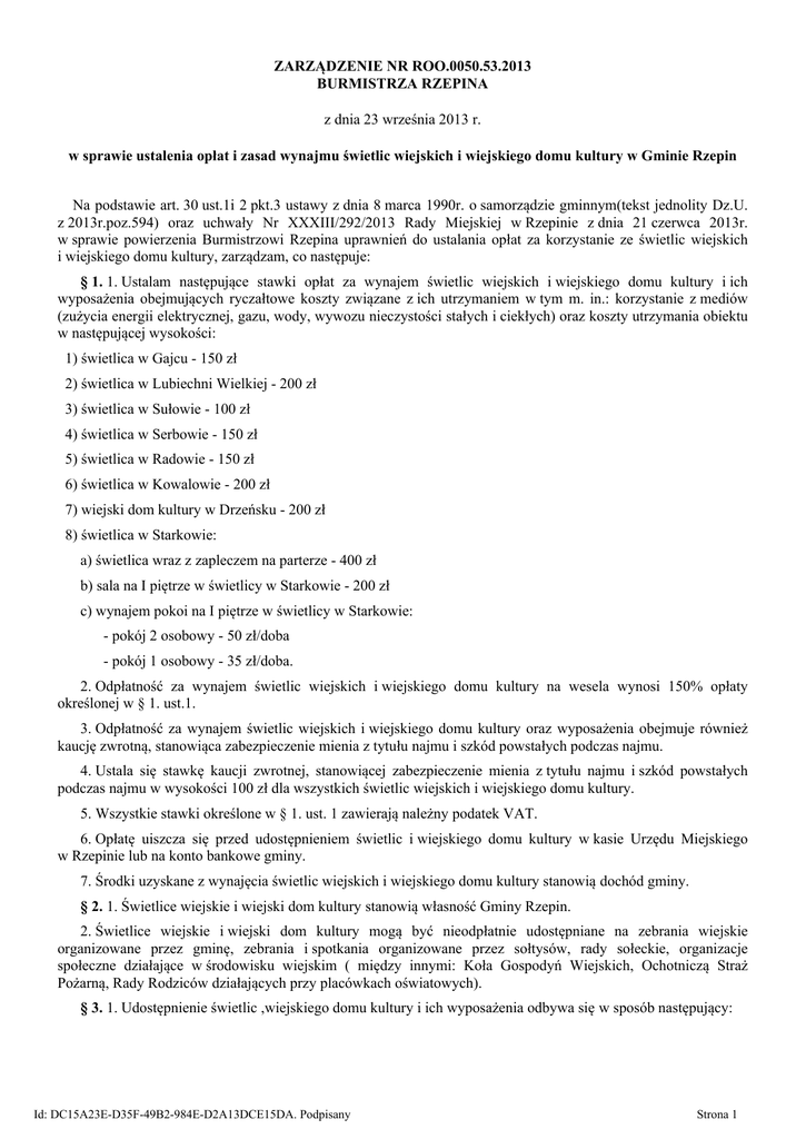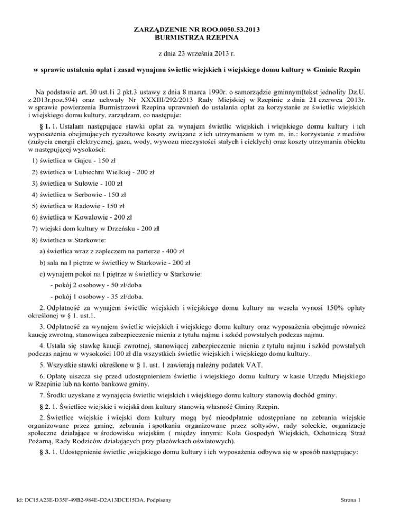 ZARZĄDZENIE NR ROO.0050.53.2013 BURMISTRZA RZEPINA z dnia 23 września 2013 r. w sprawie ustalenia opłat i zasad wynajmu świetlic wiejskich i wiejskiego domu kultury w Gminie Rzepin Na podstawie art. 30 ust.1i 2 pkt.3 ustawy z dnia 8 marca 1990r. o samorządzie gminnym(tekst jednolity Dz.U. z 2013r.poz.594) oraz uchwały Nr XXXIII/292/2013 Rady Miejskiej w Rzepinie z dnia 21 czerwca 2013r. w sprawie powierzenia Burmistrzowi Rzepina uprawnień do ustalania opłat za korzystanie ze świetlic wiejskich i wiejskiego domu kultury, zarządzam, co następuje: § 1. 1. Ustalam następujące stawki opłat za wynajem świetlic wiejskich i wiejskiego domu kultury i ich wyposażenia obejmujących ryczałtowe koszty związane z ich utrzymaniem w tym m. in.: korzystanie z mediów (zużycia energii elektrycznej, gazu, wody, wywozu nieczystości stałych i ciekłych) oraz koszty utrzymania obiektu w następującej wysokości: 1) świetlica w Gajcu - 150 zł 2) świetlica w Lubiechni Wielkiej - 200 zł 3) świetlica w Sułowie - 100 zł 4) świetlica w Serbowie - 150 zł 5) świetlica w Radowie - 150 zł 6) świetlica w Kowalowie - 200 zł 7) wiejski dom kultury w Drzeńsku - 200 zł 8) świetlica w Starkowie: a) świetlica wraz z zapleczem na parterze - 400 zł b) sala na I piętrze w świetlicy w Starkowie - 200 zł c) wynajem pokoi na I piętrze w świetlicy w Starkowie: - pokój 2 osobowy - 50 zł/doba - pokój 1 osobowy - 35 zł/doba. 2. Odpłatność za wynajem świetlic wiejskich i wiejskiego domu kultury na wesela wynosi 150% opłaty określonej w § 1. ust.1. 3. Odpłatność za wynajem świetlic wiejskich i wiejskiego domu kultury oraz wyposażenia obejmuje również kaucję zwrotną, stanowiąca zabezpieczenie mienia z tytułu najmu i szkód powstałych podczas najmu. 4. Ustala się stawkę kaucji zwrotnej, stanowiącej zabezpieczenie mienia z tytułu najmu i szkód powstałych podczas najmu w wysokości 100 zł dla wszystkich świetlic wiejskich i wiejskiego domu kultury. 5. Wszystkie stawki określone w § 1. ust. 1 zawierają należny podatek VAT. 6. Opłatę uiszcza się przed udostępnieniem świetlic i wiejskiego domu kultury w kasie Urzędu Miejskiego w Rzepinie lub na konto bankowe gminy. 7. Środki uzyskane z wynajęcia świetlic wiejskich i wiejskiego domu kultury stanowią dochód gminy. § 2. 1. Świetlice wiejskie i wiejski dom kultury stanowią własność Gminy Rzepin. 2. Świetlice wiejskie i wiejski dom kultury mogą być nieodpłatnie udostępniane na zebrania wiejskie organizowane przez gminę, zebrania i spotkania organizowane przez sołtysów, rady sołeckie, organizacje społeczne działające w środowisku wiejskim ( między innymi: Koła Gospodyń Wiejskich, Ochotniczą Straż Pożarną, Rady Rodziców działających przy placówkach oświatowych). § 3. 1. Udostępnienie świetlic ,wiejskiego domu kultury i ich wyposażenia odbywa się w sposób następujący: Id: DC15A23E-D35F-49B2-984E-D2A13DCE15DA. Podpisany Strona 1 1) osoba ubiegająca się o wynajem rezerwuje świetlicę składając wniosek do Burmistrza ,wg wzoru stanowiącego załącznik nr 1 do niniejszego zarządzenia; 2) sołtys lub osoba przez niego upoważniona (opiekun świetlicy) potwierdza termin rezerwacji na wniosku, który jest składany do urzędu celem sporządzenia umowy; 3) przed przyjęciem świetlicy najemca wpłaca opłatę zgodnie ze stawkami wynikającymi z § 1.ust.1 i kaucję zgodnie z § 1.ust.7 na rachunek gminy lub w kasie urzędu, a dowód wpłaty dołącza do wniosku i przedkłada opiekunowi świetlicy do wglądu; 4) opiekun świetlicy przed przekazaniem świetlicy sprawdza, czy umowa została zawarta i czy uregulowano należności, a następnie w obecności najemcy sporządza protokół zdawczo-odbiorczy świetlicy i wraz z kluczami przekazuje najemcy; 5) kwota kaucji podlega zwrotowi tylko wtedy, gdy opiekun świetlicy w protokole zdawczo-odbiorczym stwierdzi, że przedmiot umowy jest w stanie jaki istniał w dniu jego przekazania najemcy; 6) w przypadku , gdy szkody wynikłe z winy najemcy przewyższą wartość kaucji, najemca zobowiązany jest je pokryć do 100% rzeczywistej wartości. 2. W sprawach bieżących w zakresie wynajmu świetlicy, najemca powinien kontaktować się z opiekunem świetlicy. § 4. Wykonanie zarządzenia powierza się Zastępcy Burmistrza. § 5. Zarządzenie wchodzi w życie z dniem podjęcia. Burmistrz Rzepina Andrzej Skałuba Id: DC15A23E-D35F-49B2-984E-D2A13DCE15DA. Podpisany Strona 2 Załącznik Nr 1 do Zarządzenia Nr ROO.0050.53.2013 Burmistrza Rzepina z dnia 23 września 2013 r. Załącznik nr 1 do Zarządzenia nr ........................................................ /2013 Burmistrza Rzepina z dnia Rzepin, dnia....................................... (imię i nazwisko/nazwa wnioskodawcy .......................................................... (adres: miejscowość, ulica, nr domu ......................................................... (nr telefonu) Burmistrz Rzepina ul.Plac Ratuszowy 1 69-110 Rzepin WNIOSEK Proszę o wynajem świetlicy wiejskiej/wiejskiego domu kultury w ................................................. z wyposażeniem/bez wyposażenia: od dnia ......................... do dnia ......................... od godz. ........................ do godz. ...................... Proszę o wynajęcie pokoju 1 osobowego/2 osobowego w ilości ................ w celu zorganizowania .................................................................................................................. przyjęcie weselne, chrzciny, komunia, stypa inne- wskazać jakie / kurs, szkolenie itp./ Jednocześnie oświadczam, że zapoznałem/am się z Regulaminem korzystania ze świetlic wiejskich i wiejskiego domu kultury w gminie Rzepin oraz Zarządzeniem Burmistrza Rzepina w sprawie ustalenia opłat za wynajem świetlic wiejskich i wiejskiego domu kultury w Gminie Rzepin i zobowiązuję się do ich przestrzegania. Osoba odpowiedzialna za utrzymanie por