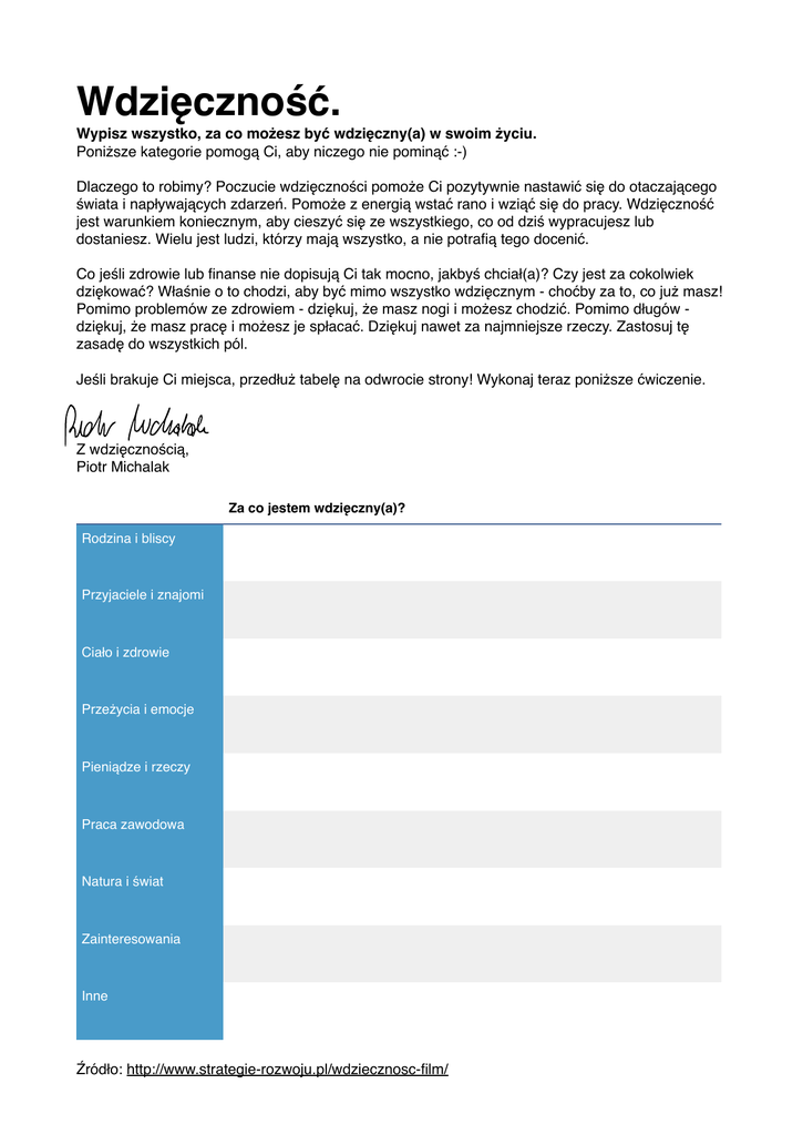Wdzięczność. Wypisz wszystko, za co możesz być wdzięczny(a) w swoim życiu. Poniższe kategorie pomogą Ci, aby niczego nie pominąć :-) Dlaczego to robimy? Poczucie wdzięczności pomoże Ci pozytywnie nastawić się do otaczającego świata i napływających zdarzeń. Pomoże z energią wstać rano i wziąć się do pracy. Wdzięczność jest warunkiem koniecznym, aby cieszyć się ze wszystkiego, co od dziś wypracujesz lub dostaniesz. Wielu jest ludzi, którzy mają wszystko, a nie potrafią tego docenić. Co jeśli zdrowie lub finanse nie dopisują Ci tak mocno, jakbyś chciał(a)? Czy jest za cokolwiek dziękować? Właśnie o to chodzi, aby być mimo wszystko wdzięcznym - choćby za to, co już masz! Pomimo problemów ze zdrowiem - dziękuj, że masz nogi i możesz chodzić. Pomimo długów dziękuj, że masz pracę i możesz je spłacać. Dziękuj nawet za najmniejsze rzeczy. Zastosuj tę zasadę do wszystkich pól. Jeśli brakuje Ci miejsca, przedłuż tabelę na odwrocie strony! Wykonaj teraz poniższe ćwiczenie. Z wdzięcznością, Piotr Michalak Za co jestem wdzięczny(a)? Rodzina i bliscy Przyjaciele i znajomi Ciało i zdrowie Przeżycia i emocje Pieniądze i rzeczy Praca zawodowa Natura i świat Zainteresowania Inne Źródło: http://www.strategie-rozwoju.pl/wdziecznosc-film/