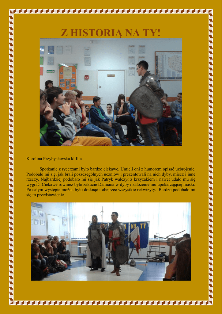 Z HISTORIĄ NA TY! Karolina Przybysławska kl II a Spotkanie z rycerzami było bardzo ciekawe. Umieli oni z humorem opisać uzbrojenie. Podobało mi się, jak brali poszczególnych uczniów i prezentowali na nich dyby, miecz i inne rzeczy. Najbardziej podobało mi się jak Patryk walczył z krzyżakiem i nawet udało mu się wygrać. Ciekawe również było zakucie Damiana w dyby i założenie mu upokarzającej maski. Po całym występie można było dotknąć i obejrzeć wszystkie rekwizyty. Bardzo podobało mi się to przedstawienie. Jakub Banul kl II a Według mnie lekcja historii była bardzo ciekawa. Panowie prowadzili zajęcia w humorystyczny sposób. Na początku pokazali nam uzbrojenie średniowiecznego rycerza i zademonstrowali sposób używania broni. Zbroja rycerza ważyła 70-80 kg. Najciekawszy był nadziak, który służył do zrzucania rycerza z konia i potrafił przebić każdy pancerz. Następnie prowadzący zaprosili na środek Damiana i zakuli go w dyby. Pod koniec spotkania 4 chłopaków próbowało podnieść 11 kg miecz. Niestety żadnemu z nich nie udało się tego zrobić. Na samym końcu Patryk walczył z krzyżakiem. Zbyt mocno zamachnął się mieczem i niechcący rozciął mu palec. Patryk Koziatek kl II a Spektakl był bardzo ciekawy, dowiedziałem się z niego dużo interesujących rzeczy. Szkoda tylko, że krzyżak nie reagował na moje krzyki. Najfajniejsze było to, że panowie pozwalali dotknąć tych zabytkowych narzędzi walki. Najciekawszy był koniec kiedy to podczas walki prawie odciąłem krzyżakowi palec... Ogólnie całe przedstawienie było bardzo ciekawe. Martyna Kołakowska II A Rycerz w swojej zbroi nie mógł wstać. Zbroja rycerza miała około 80-90 kg. Była bardzo ciężka. Na zajęciach pokazano nam również miecz, który był dość ciężki, ważył 11 kg. Nie wszyscy potrafili go podnieść. Rycerz walczył o damę, kobiecie nie wypadało walczyć. Rycerz obiecywał kobiecie obronę jej ślicznej twarzy. Jedną z kar były dyby, zakutemu nie wolno mu było jeść ani pić. Stał tam czasami nawet kilka tygodni. Ten kto dał mu pokarm lub picie też otrzymał karę . Za wykroczenia była też kara noszenia świńskiego ryja. Była to bardzo upokarzająca i bolesna kara. Nie dało się tego zdjąć. Milena Samsel II a Ciekawym punktem spotkania była walka naszego kolegi z klasy o swoją damę. Walka była zabawna, jednak jak się okazało także niebezpieczna. Panowie bardzo ciekawie opowiadali o karach wymierzanych w tamtym czasie, m.in. dyby, świński ryj. Ciężka była zbroja rycerza, która ważyła od 75 kg nawet do 100 kg. Rycerz, który upadł z konia na polu bitwy nie mógł się podnieść. Gdy rycerz umierał często chowano z nim jego konia. Ciężkim mieczem nie do udźwignięcia przez naszych kolegów okazał się miecz ważący aż 11 kg. Julia Królicka II a Spotkanie z rycerzami było bardzo interesujące. Zaprezentowali nam broń i dokładnie ją opisali. Najbardziej podobało mi się to, że prezentowali to z humorem. Pokazali nam również, jak karano przestępców. Podobało mi się, jak dali nam do ręki miecze, hełmy i różne przedmioty. Po całym przedstawieniu mieliśmy okazję zobaczyć, a także wziąć do ręki zbroję, broń lub dyby. Przedstawili nam również pojedynek. Walka rozpoczęła się dlatego, iż rycerz krzyżacki obraził wybrankę rycerza. Wygrał rycerz, lecz krzyżakowi darował życie. Krzyżak miał ciężko podnieść się z ziemi, gdyż jego zbroja ważyła 70-80 kg. Inne mogły nawet osiągnąć do 100kg. Była ta niezwykle ciekawa lekcja historii.