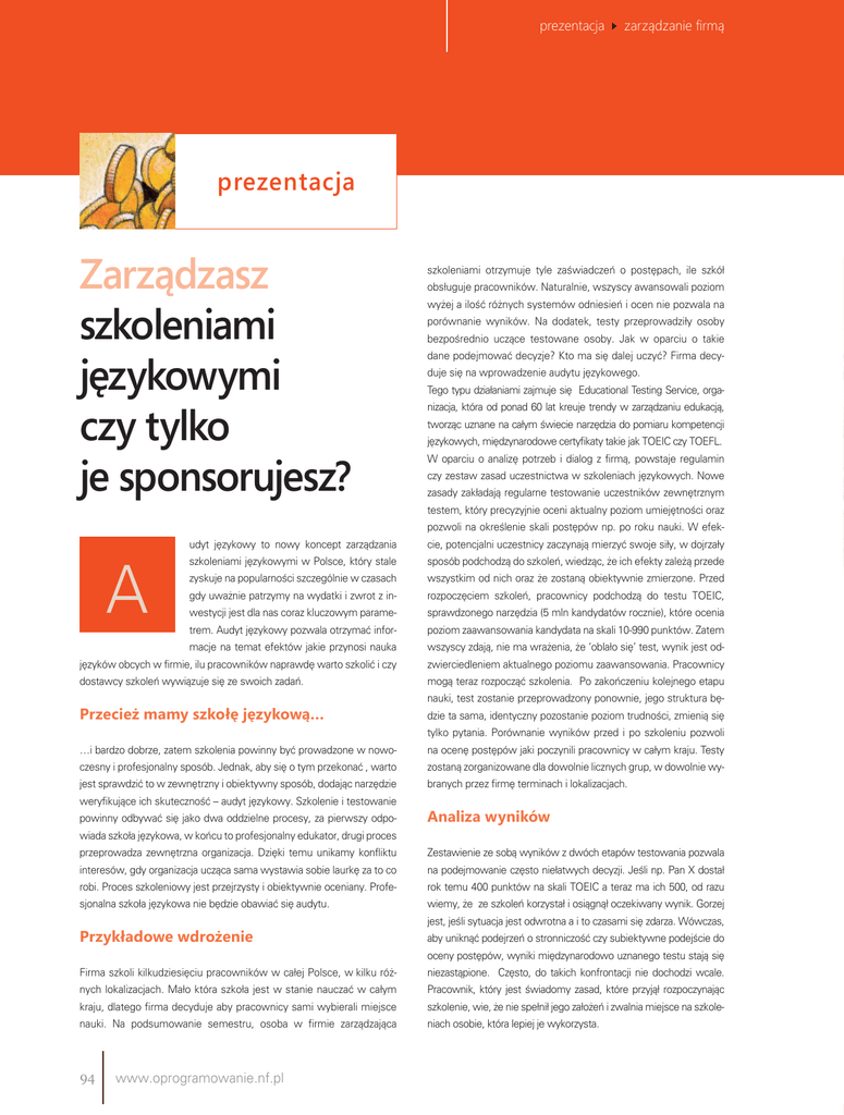 prezentacja zarządzanie firmą prezentacja Zarządzasz szkoleniami językowymi czy tylko je sponsorujesz? szkoleniami otrzymuje tyle zaświadczeń o postępach, ile szkół obsługuje pracowników. Naturalnie, wszyscy awansowali poziom wyżej a ilość różnych systemów odniesień i ocen nie pozwala na porównanie wyników. Na dodatek, testy przeprowadziły osoby bezpośrednio uczące testowane osoby. Jak w oparciu o takie dane podejmować decyzje? Kto ma się dalej uczyć? Firma decyduje się na wprowadzenie audytu językowego. Tego typu działaniami zajmuje się Educational Testing Service, organizacja, która od ponad 60 lat kreuje trendy w zarządzaniu edukacją, tworząc uznane na całym świecie narzędzia do pomiaru kompetencji językowych, międzynarodowe certyfikaty takie jak TOEIC czy TOEFL. W oparciu o analizę potrzeb i dialog z firmą, powstaje regulamin czy zestaw zasad uczestnictwa w szkoleniach językowych. Nowe zasady zakładają regularne testowanie uczestników zewnętrznym testem, który precyzyjnie oceni aktualny poziom umiejętności oraz pozwoli na określenie skali postępów np. po roku nauki. W efek- udyt językowy to nowy koncept zarządzania A cie, potencjalni uczestnicy zaczynają mierzyć swoje siły, w dojrzały szkoleniami językowymi w Polsce, który stale sposób podchodzą do szkoleń, wiedząc, że ich efekty zależą przede zyskuje na popularności szczególnie w czasach wszystkim od nich oraz że zostaną obiektywnie zmierzone. Przed gdy uważnie patrzymy na wydatki i zwrot z in- rozpoczęciem szkoleń, pracownicy podchodzą do testu TOEIC, westycji jest dla nas coraz kluczowym parame- sprawdzonego narzędzia (5 mln kandydatów rocznie), które ocenia trem. Audyt językowy pozwala otrzymać infor- poziom zaawansowania kandydata na skali 10-990 punktów. Zatem macje na temat efektów jakie przynosi nauka wszyscy zdają, nie ma wrażenia, że ‘oblało się’ test, wynik jest od- języków obcych w firmie, ilu pracowników naprawdę warto szkolić i czy zwierciedleniem aktualnego poziomu zaawansowania. Pracownicy dostawcy szkoleń wywiązuje się ze swoich zadań. mogą teraz rozpocząć szkolenia. Po zakończeniu kolejnego etapu Przecież mamy szkołę językową… nauki, test zostanie przeprowadzony ponownie, jego struktura będzie ta sama, identyczny pozostanie poziom trudności, zmienią się tylko pytania. Porównanie wyników przed i po szkoleniu pozwoli …i bardzo dobrze, zatem szkolenia powinny być prowadzone w nowo- na ocenę postępów jaki poczynili pracownicy w całym kraju. Testy czesny i profesjonalny sposób. Jednak, aby się o tym przekonać , warto zostaną zorganizowane dla dowolnie licznych grup, w dowolnie wy- jest sprawdzić to w zewnętrzny i obiektywny sposób, dodając narzędzie branych przez firmę terminach i lokalizacjach. weryfikujące ich skuteczność – audyt językowy. Szkolenie i testowanie powinny odbywać się jako dwa oddzielne procesy, za pierwszy odpo- Analiza wyników wiada szkoła językowa, w końcu to profesjonalny edukator, drugi proces przeprowadza zewnętrzna organizacja. Dzięki temu unikamy konfliktu Zestawienie ze sobą wyników z dwóch etapów testowania pozwala interesów, gdy organizacja ucząca sama wystawia sobie laurkę za to co na podejmowanie często niełatwych decyzji. Jeśli np. Pan X dostał robi. Proces szkoleniowy jest przejrzysty i obiektywnie oceniany. Profe- rok temu 400 punktów na skali TOEIC a teraz ma ich 500, od razu sjonalna szkoła językowa nie będzie obawiać się audytu. Przykładowe wdrożenie wiemy, że ze szkoleń korzystał i osiągnął oczekiwany wynik. Gorzej jest, jeśli sytuacja jest odwrotna a i to czasami się zdarza. Wówczas, aby uniknąć podejrzeń o stronniczość czy subiektywne podejście do oceny postępów, wyniki międzynarodowo uznanego testu stają się Firma szkoli kilkudziesięciu pracowników w całej Polsce, w kilku róż- niezastąpione. Często, do takich konfrontacji nie dochodzi wcale. nych lokalizacjach. Mało która szkoła jest w stanie nauczać w całym Pracownik, który jest świadomy zasad, które przyjął rozpoczynając kraju, dlatego firma decyduje aby pracownicy sami wybierali miejsce szkolenie, wie, że nie spełnił jego założeń i zwalnia miejsce na szkole- nauki. Na podsumowanie semestru, osoba w firmie zarządzająca niach osobie, która lepiej je wykorzysta. 94 www.oprogramowanie.nf.pl prezentacja Motywacja i frekwencja zarządzanie firmą modyfikację systemu szkoleń np. z 2 go- nie pracowników, którzy niechętnie reagują dzin 2 razy w tygodniu na 1 godzinę 1 raz na testy, że audyt językowy przyłapie ich na Bezpośrednim przełożeniem wprowadzenia au- w tygodniu celem podtrzymania aktualne- tym co robią dobrze. Tak właśnie skonstru- dytu językowego jest znaczący wzrost frekwen- go poziomu. Przynosi to oszczędności dla owany jest test TOEIC. Liczy się przede cji na zajęciach. Opierając się na przykładzie budżetu szkoleniowego i pozwala pracow- wszystkim to co pracownik już wie i jak radzi Leroy Merlin Polska, przed wprowadzeniem nikom dalej korzystać z języka i rozwijać sobie z językiem obcym w praktyce. audytu, frekwencja wynosiła średnio 50%, po go na zajęciach. Ponadto, testowanie ‘na wprowadzeniu audytu i zmianie dostawcy szko- wejściu’ pozwala też ustalić, czy poziom leń, wzrosła do 93%. Z grupy szkolonych osób, pracownika nie jest zbyt niski aby w nie- 84% zrealizowało założone cele. go zainwestować. Nie zawsze mamy czas Do i od kiedy uczyć? Narzędzia do skutecznego zarządzania szko- i budżet szkolić pracownika od podstaw. Testy to tylko część projektu Karol Granoszewski Dyrektor oddziału Educational Testing Service (ETS Global BV) w Polsce. Absolwent anglistyki UW, posiada wieloletnie doświadczenie w zakresie metodyki nauczania języka angielskiego. Prowadził szkolenia business English dla kadry zarządzającej kluczowych polskich przedsiębiorstw. We wspó