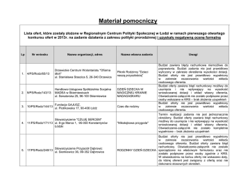 Materiał pomocniczy Lista ofert, które zostały złożone w Regionalnym Centrum Polityki Społecznej w Łodzi w ramach pierwszego otwartego konkursu ofert w 2013r. na zadanie działania z zakresu polityki prorodzinnej i uzyskały negatywną ocenę formalną Lp Nr wniosku Nazwa organizacji, adres Nazwa własna zadania 1. 4/PS/Rodz/65/13 Drzewickie Centrum Wolontariatu "Ofiarna dłoń" ul. Stanisława Staszica 5, 26-340 Drzewica Piknik Rodzinny "Dzieci naszą przyszłością" 2. 9/PS/Rodz/143/13 Handlowo-Usługowa Spółdzielnia Socjalna MADEA w Skierniewicach ul. Senatorska 25, 96-100 Skierniewice DZIEŃ DZIECKA W MAGICZNEJ KRAINIE MADAGASKARU 3. 10/PS/Rodz/144/13 Fundacja GAJUSZ, ul. Piotrkowska 17, 90-406 Łódź Czas dla rodziny Stowarzyszenie "CZUJĘ SERCEM" 4. 11/PS/Rodz/171/13 ul. 8-go Marca 1, 95-050 Konstantynów Łódzki 5. 17/PS/Rodz/248/13 Stowarzyszenie Przyjaciół Dąbrowic ul. Sienkiewicz 36, 99-352 Dąbrowice "Mikołajkowa przygoda" Uwagi Budżet zawiera błędy rachunkowe niemożliwe do poprawienia. Budżet zadania nie jest prawidłowo wyliczony w zakresie określenia wysokości dotacji. Budżet oferty nie jest prawidłowo wypełniony w zakresie oszacowania wartości wkładu osobowego oferenta. Budżet oferty zawiera błąd rachunkowy możliwy do usunięcia i nie wpływający na wysokość wnioskowanej dotacji i wkład własny oferenta, Oświadczenie-załącznik nie zostało podpisane przez osoby wskazane w KRS – brak złożenia uzupełnień Budżet oferty nie jest prawidłowo wypełniony w zakresie oszacowania wartości wkładu osobowego oferenta. Termin realizacji zadania nie jest jednoznacznie określony. Budżet oferty zawiera błąd rachunkowy możliwy do usunięcia i nie wpływający na wysokość wnioskowanej dotacji i wkład własny oferenta. Oświadczenie-załącznik nie zostało kompletnie wypełnione – brak złożenia uzupełnień Budżet oferty nie jest prawidłowo wypełniony w zakresie oszacowania wartości wkładu osobowego oferenta. Budżet oferty zawiera błąd rachunkowy. Oświadczenie-załącznik nie zostało RODZINNY DZIEŃ DZIECKA sporządzone na właściwym formularzu oraz nie zostało podpisane przez osoby zgodnie z KRS. W oświadczeniu na końcu oferty nie wskazano daty, do której oferent jest związany z ofertą oraz nie dokonano stosownych skreśleń. Organizacja Dnia Matki w rodzinach z dysfunkcją słuchu Budżet zadania nie mieści się w przedziale określonym w ogłoszeniu o konkursie w zakresie limitu wysokości wkładu własnego oferenta i wysokości dotacji o którą oferent występuje. Budżet oferty zawiera błąd rachunkowy. Akademicki Klub Sportowy Wyższej Szkoły 7. 21/PS/Rodz/252/13 Sportowej im. Kazimierza Górskiego w Łodzi ul. Milionowa 12, 93-193 Łódź "GWIAZDKA 2013 dla uczestników Akademii Zdrowia i Sportu Trzeciego Wieku" Kserokopia zaświadczeniu z Urzędu Miasta w Łodzi jest niekompletna i nie jest poświadczona za zgodność z oryginałem na każdej ze stron. Stowarzyszenie Rodziców i Opiekunów Dzieci Niepełnosprawnych "WSPÓLNA 8. 24/PS/Rodz/255/13 TROSKA" ul. Jagiellońska 28, 96-100 Skierniewice "Integracja pod hasłem zdrowia" Oferta została wypełniona na nie odpowiednim wzorze oferty. Nazwa rodzaju zadania wskazana w ofercie nie jest jednoznaczna. Oświadczeniezałącznik zostało złożone na niewłaściwym druku 6. 19/PS/Rodz/250/13 Polski Związek Głuchych Oddział Łódzki ul. Nawrot 94/96, 90-040 Łódź Fundacja "AKTYWNE CENTRUM EDUKACJI Macierzyństwo, Ojcostwo ale 9. 30/PS/Rodz/261/13 UNIWERSYTETOTWARTY DLA KAŻDEGO" jakie? ul. Targowa 12c/24, 97-500 Radomsko 10. 32/PS/Rodz/263/13 Stowarzyszenie ANTY-RAMA ul. Piotrkowska 46, 90-265 Łódź "Imprezy okolicznościowe: Dzień Dziecka i Święto Rodziny" Stowarzyszenie Na Rzecz Dzieci Niepełnosprawnych "Dary Losu" przy Specjalnym Ośrodku Szkolno11. 34/PS/Rodz/265/13 Wychowawczym w Sieradzu ul. Krakowskie Przedmieście 58 lok. 58, 98200 Sieradz Rodzinne spotkanie integracyjne "Powitanie Lata na sportowo" Stowarzyszenie Pomocy Osobom 12. 39/PS/Rodz/270/13 Niepełnosprawnym "WSPÓLNE GNIAZDO" ul. Podgórna 2/14 lok.13, 93-278 Łódź w zakresie: organizacji imprez sprzyjających integracji rodzin (II Piknik Integracyjny 2013) Polskie Stowarzyszenie na Rzecz Osób z 13. 40/PS/Rodz/271/13 Upośledzeniem Umysłowym Koło w Łodzi ul. Karolewska 70/76, 94-023 Łódź Spotkanie wigilijno świąteczne Oświadczenie-załącznik nie zostało kompletnie wypełnione. W oświadczeniu na końcu oferty nie wskazano daty, do której oferent jest związany z ofertą oraz nie dokonano stosownych skreśleń. Termin realizacji zadania nie jest jednoznacznie określony, Budżet zadania jest nieprawidłowo wypełniony w zakresie limitu obsługi administracyjnej zadania. Budżet projektu zawiera błędy rachunkowe. Niewłaściwa data na kserokopii KRS przy poświadczeniu za zgodność z oryginałem. Termin realizacji zadania nie jest precyzyjnie określony, Brak oświadczenia - załącznika oraz brak statutu organizacji. Oferta nie została podpisana przez upoważnione osoby zgodnie z KRS – brak złożenia uzupełnień Budżet oferty nie jest prawidłowo wypełniony w zakresie oszacowania wartości wkładu osobowego oferenta. Budżet oferty zawiera błędy rachunkowe, Brak poświadczenia za zgodność z oryginałem na każdej stronie KRS. Oświadczenie - załącznik został dostarczony jako ksero a nie oryginał – brak złożenia uzupełnień Budżet oferty nie jest prawidłowo wypełniony w zakresie oszacowania wartości wkładu osobowego oferenta. 14. 45/PS/Rodz/300/13 Stowarzyszenie Niecodzienni ul. Łagiewnicka 79 lok. 8, 91-855 Łódź Fundacja Waldiego - Serce Na Dłoni 15. 51/PS/Rodz/306/13 ul. Częstochowska 60, 93-121 Łódź Budżet zadania jest nieprawidłowo wypełniony w zakresie limitu obsługi administracyjnej zadania. Brak możliwości stwierdzenia czy KRS i statut "Wakacje, rodzina i ja" Konkurs fotograficzny dla organizacji zostały poświadczon