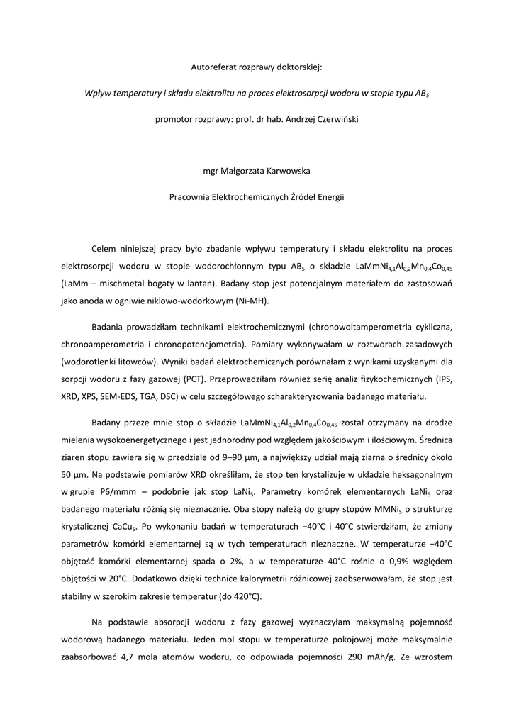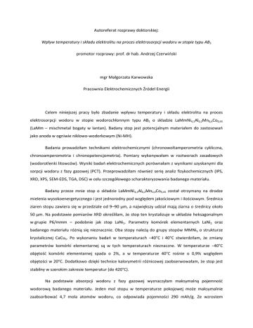 Autoreferat rozprawy doktorskiej: Wpływ temperatury i składu elektrolitu na proces elektrosorpcji wodoru w stopie typu AB5 promotor rozprawy: prof. dr hab. Andrzej Czerwiński mgr Małgorzata Karwowska Pracownia Elektrochemicznych Źródeł Energii Celem niniejszej pracy było zbadanie wpływu temperatury i składu elektrolitu na proces elektrosorpcji wodoru w stopie wodorochłonnym typu AB5 o składzie LaMmNi4,1Al0,2Mn0,4Co0,45 (LaMm – mischmetal bogaty w lantan). Badany stop jest potencjalnym materiałem do zastosowań jako anoda w ogniwie niklowo-wodorkowym (Ni-MH). Badania prowadziłam technikami elektrochemicznymi (chronowoltamperometria cykliczna, chronoamperometria i chronopotencjometria). Pomiary wykonywałam w roztworach zasadowych (wodorotlenki litowców). Wyniki badań elektrochemicznych porównałam z wynikami uzyskanymi dla sorpcji wodoru z fazy gazowej (PCT). Przeprowadziłam również serię analiz fizykochemicznych (IPS, XRD, XPS, SEM-EDS, TGA, DSC) w celu szczegółowego scharakteryzowania badanego materiału. Badany przeze mnie stop o składzie LaMmNi4,1Al0,2Mn0,4Co0,45 został otrzymany na drodze mielenia wysokoenergetycznego i jest jednorodny pod względem jakościowym i ilościowym. Średnica ziaren stopu zawiera się w przedziale od 9–90 μm, a największy udział mają ziarna o średnicy około 50 μm. Na podstawie pomiarów XRD określiłam, że stop ten krystalizuje w układzie heksagonalnym w grupie P6/mmm – podobnie jak stop LaNi5. Parametry komórek elementarnych LaNi5 oraz badanego materiału różnią się nieznacznie. Oba stopy należą do grupy stopów MMNi5 o strukturze krystalicznej CaCu5. Po wykonaniu badań w temperaturach −40°C i 40°C stwierdziłam, że zmiany parametrów komórki elementarnej są w tych temperaturach nieznaczne. W temperaturze −40°C objętość komórki elementarnej spada o 2%, a w temperaturze 40°C rośnie o 0,9% względem objętości w 20°C. Dodatkowo dzięki technice kalorymetrii różnicowej zaobserwowałam, że stop jest stabilny w szerokim zakresie temperatur (do 420°C). Na podstawie absorpcji wodoru z fazy gazowej wyznaczyłam maksymalną pojemność wodorową badanego materiału. Jeden mol stopu w temperaturze pokojowej może maksymalnie zaabsorbować 4,7 mola atomów wodoru, co odpowiada pojemności 290 mAh/g. Ze wzrostem temperatury pojemność stopu maleje do H/M = 4,2 (w temperaturze 150°C). Na podstawie krzywych absorpcji wodoru wyznaczyłam parametry termodynamiczne tworzenia fazy wodorkowej w badanym materiale: ΔH0 = −33,52 kJ/molH2; ΔS0 = −161,26 J/(molH2·K); ΔG0 = 14,56 kJ/molH2. Uzyskane wartości są zbliżone do publikowanych dla analogicznych układów. Dodatnia wartość entalpii swobodnej Gibbsa świadczy o niestabilności termodynamicznej wodorku w warunkach standardowych. Mimo to desorpcja wodoru z badanego materiału jest utrudniona ze względu na kinetykę tego procesu. Z badań PCT oraz IPS wynika również, że sorpcja gazowego wodoru w stopie LaMmNi4,1Al0,2Mn0,4Co0,45 powoduje znaczne zmiany w morfologii ziaren stopu. Pod wpływem absorpcji i desorpcji ziarna ulegają rozkruszaniu, w wyniku czego praktycznie zanika frakcja ziaren o średnicy powyżej 50 μm. Aby ocenić przydatność stopu wodorochłonnego do zastosowań w ogniwach Ni-MH, należy zbadać parametry takie jak pojemność elektrochemiczna i współczynnik dyfuzji wodoru w tym stopie. Podczas swojej pracy zaobserwowałam, że parametry te zależą od szeregu czynników, m.in. temperatury, rodzaju elektrolitu i jego stężenia, wartości prądu ładowania i rozładowania oraz procesu aktywacji materiału wodorochłonnego przed pomiarami. Elektrody pracujące przygotowywałam w nowatorski sposób – przez wprasowanie stopu w matrycę złotą. Pozwalało to uzyskać elektrodę o ograniczonej objętości (LVE – Limited Volume Electrode). Wykazałam, że tak przygotowana elektroda zachowuje się jak zbiór mikroelektrod, co umożliwia pełniejszą analizę badanego procesu dyfuzji wodoru. Dodatkowo taka konstrukcja elektrody zapewnia jej trwałość mechaniczną bez stosowania dodatkowych substancji wiążących (np. proszek niklowy), które mogą wpływać na uzyskiwane wyniki badań materiałów wodorochłonnych. Analizując wyniki dla elektrod o różnych masach, stwierdziłam, że w elektrodzie przygotowanej przez wprasowanie proszku w złotą matrycę ziarna zachowują swoją odrębność. Pojemność elektrody oraz współczynnik dyfuzji wodoru nie zależą od masy elektrody. Proponowany przeze mnie sposób badań jest użytecznym narzędziem do badania elektrod z materiałów proszkowych. Za pomocą technik elektrochemicznych (CA i CP) wyznaczyłam współczynniki dyfuzji wodoru w badanym stopie wodorochłonnym. Wykazałam, że współczynnik dyfuzji wodoru (DH) maleje nieliniowo ze wzrostem stopnia nasycenia elektrody wodorem (SOC) i zależy od składu elektrolitu. W temperaturze pokojowej najwyższe wartości DH przyjmuje dla wodoru absorbowanego z roztworu KOH. Współczynniki dyfuzji w temperaturze pokojowej rosną w elektrolitach w kierunku LiOH < NaOH < KOH, a później maleją w kierunku KOH > CsOH > RbOH. Wpływ jonów litowców na proces dyfuzji biegnący w ziarnie stopu można tłumaczyć silnym oddziaływaniem jonów litowców z zaabsorbowanym wodorem. Prawdopodobne jest również wnikanie litowców do warstwy powierzchniowej elektrody, co modyfikowałoby znacznie właściwości stopu. Analiza XPS częściowo potwierdziła ten postulat. Wykazałam też, że wartości współczynnika dyfuzji wodoru rosną ze wzrostem temperatury, co świadczy o tym, że proces dyfuzji wodoru jest aktywowany termicznie. Silny wpływ jonów litowców przejawia się w zmianach energii aktywacji procesu dyfuzji wodoru. Zgodnie z uzyskanymi przeze mnie wynikami wartość energii aktywacji zależy od SOC, co jest wynikiem obsadzania różnych luk międzywęzłowych w kolejnych stadiach nasycenia elektrody wodorem. Dla SOC 