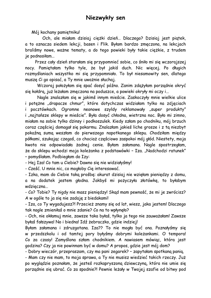 Niezwykły sen Mój kochany pamiętniku! Och, ale miałam dzisiaj ciężki dzień… Dlaczego? Dzisiaj jest piątek, a to oznacza siedem lekcji, basen i Flik. Byłam bardzo zmęczona, na lekcjach braliśmy nowe, ważne tematy, a do tego powieki były takie ciężkie, z trudem je podnosiłam… Przez cały dzień starałam się przypomnieć sobie, co śniło mi się wczorajszej nocy. Pamiętałam tylko tyle, że był jakiś duch. Nic więcej. Po długich rozmyślaniach wszystko mi się przypomniało. To był niesamowity sen, dlatego muszę Ci go opisać, a Ty mnie uważnie słuchaj. Wczoraj położyłam się spać dosyć późno. Zanim zdążyłam porządnie okryć się kołdrą, już leżałam zmęczona na poduszce, a powieki okryły mi oczy i… Nagle znalazłam się w jakimś innym mieście. Zaskoczyły mnie wielkie ulice i potężne „drapacze chmur”, które dotychczas widziałam tylko na zdjęciach i pocztówkach. Ogromne neonowe szyldy reklamowały „super produkty” i „najtańsze sklepy w mieście”. Była dosyć chłodna, wietrzna noc. Było mi zimno, miałam na sobie tylko dżinsy i podkoszulek. Kiedy szłam po chodniku, mój brzuch coraz częściej domagał się pokarmu. Znalazłam jakieś liche grosze i z tą niezbyt pokaźną sumą weszłam do pierwszego napotkanego sklepu. Chodziłam między półkami, szukając czegoś, co chociaż częściowo zaspokoi mój głód. Niestety, moja kwota nie odpowiadała żadnej cenie. Byłam załamana. Nagle spostrzegłam, że do sklepu wchodzi moja koleżanka z podstawówki – Iza. „Nadchodzi ratunek” – pomyślałam. Podbiegłam do Izy: - Hej Iza! Co tam u Ciebie? Dawno się nie widziałyśmy! - Cześć. U mnie nic, co mogłoby Cię interesować. - Izka, mam do Ciebie taką prośbę: akurat dzisiaj nie wzięłam pieniędzy z domu, a na dodatek jestem głodna. Jakbyś mi pożyczyła złotówkę, to byłabym wdzięczna… - Co? Tobie? Ty nigdy nie masz pieniędzy! Skąd mam pewność, że mi je zwrócisz? A w ogóle to ja się nie zadaję z biedakami! - Iza, co Ty wygadujesz?! Przecież znamy się od lat, wiesz, jaka jestem! Dlaczego tak nagle zmieniłaś o mnie zdanie? Co na to wpłynęło? - Och, nie okłamuj mnie, zawsze taka byłaś, tylko ja tego nie zauważałam! Zawsze byłaś fałszywa! No i biedna! Idź żebraczko, gdzie indziej! Byłam załamana i zdruzgotana. Iza?? To nie mogła być ona. Poznałyśmy się w przedszkolu i od tamtej pory byłyśmy dobrymi koleżankami. O tempora! Co za czasy! Zamyślona szłam chodnikiem. A nawiasem mówiąc, która jest godzina? Czy ja nie powinnam być w domu? A propos, gdzie jest mój dom? - Dobry wieczór, przepraszam, czy ma pani zegarek? – zapytałam spotkaną panią. - Mam czy nie mam, to moja sprawa, a Ty nie musisz wiedzieć takich rzeczy. Już po wyglądzie poznałam, że jesteś rozkapryszoną dziewczyną, która nie umie się porządnie się ubrać. Co za spodnie?! Pewnie leżały w Twojej szafie od bitwy pod Grunwaldem. A ta bluzka… Niebieski kolor nie jest już modny, ale widać ty na to nie zważasz. Odejdź stąd dziewucho, i niech Cię więcej nie widzę! – odrzekła zirytowana pani i odeszła w druga stronę. O co chodzi? To jakaś gra? Może Prima Aprilis? Raczej nie, jest typowy zimowy wieczór. Dlaczego ta pani potępia mnie za moje ubranie? Przecież „nie szata zdobi człowieka, a serce”. A, szczerze mówiąc, ta kobieta miała śmieszny kapelusz. Jak można w takim czymś chodzić? Ja bym się wstydziła.” Brrr… Jak zimno! Gdzie mogę się schować? Czy jest tu jakakolwiek osoba, która o mnie myśli? Która martwi się, gdzie jestem i czy nie jest mi chłodno? Z tego zamyślenia wytrąciła mnie jakaś kobieta w długim, ciemnym płaszczu i kapturze. Pytała, czy nie mam złotówki, bo chce kupić dziecku bułkę. Była to jakaś cyganka – tak mi się wydawało. - Nie – odpowiedziałam bez chwili zastanowienia. - Na pewno? Kasieńka jest bardzo głodna… - Raczej nie. – odpowiedziałam z brakiem zainteresowania. Nagle poczułam dziwne gorąco, szczególnie na prawej nodze w okolicy kieszeni dżinsów. Włożyłam tam rękę i … Gorące! Co to? Ach, to moje grosze. Dlaczego tak parzą? - A co znajduje się w twojej prawej kieszeni? – zapytała kobieta innym, nieco znajomym głosem – czy warto oszukiwać Olu? Prawda jest czasami straszna, ale mimo wszystko jest prawdą i nie psuje naszego serca tak jak kłamstwo. Kobieta zdjęła swój ciemny płaszcz i ujrzałam panią Monikę! Tak, to z pewnością była nasza polonistka. Poznałam ją. Ten sam głos, te same włosy, identyczny uśmiech. Była ubrana w długą, biała suknię okrytą białym płaszczem. Jej postać była półprzezroczysta. Przez jej ciało widziałam ludzi idących chodnikiem. Unosiła się niewysoko w powietrzu, tak, że krawędzią sukni muskała ziemię. Cała jej osoba jaśniała dziwnym światłem, które dawało dużo ciepła. - Proszę pani, ja nie chciałam, to znaczy… Czy wie pani, o co w tym chodzi? Dlaczego ludzie są dla mnie tacy niemili? Gdzie jest moja rodzina? Jak daleko stąd jest do Sandomierza? Czy może mi pani to wszystko logicznie wytłumaczyć? - Spokojnie i powoli, Olu. Rozumiem twoje zdenerwowanie, ale zachowaj cierpliwość. - Ale jak? Proszę pani, to wszystko jakaś dziwna gra! Pewnie zaraz wszyscy wyskoczą z okrzykiem „ Prima Aprilis” i wszystko dobrze się skończy, prawda? - Nie , to nie jest żadna gra. Przyszłam Tu do ciebie z pewna misja. Czy pamiętasz o czym rozmawialiśmy na ostatniej lekcji? - Proszę pani, jeżeli zamierza mnie pani pytać, to ja poproszę od razu nieprzygotowanie. Mogę odpowiadać jutro. - Widzę, ze sama muszę odpowiedzieć na to pytanie. Od tygodnia omawiamy lekturę pt. ”Opowieść wigilijna”, pamiętasz? - Tak proszę pani, trzy duchy, Marley, Scrooge… - Dokładnie, a zatrzymajmy się teraz na dłużej przy tym bohaterze. Czy pamiętasz, jaki był? - Tak, Scrooge był samotny, egoistyczny, op