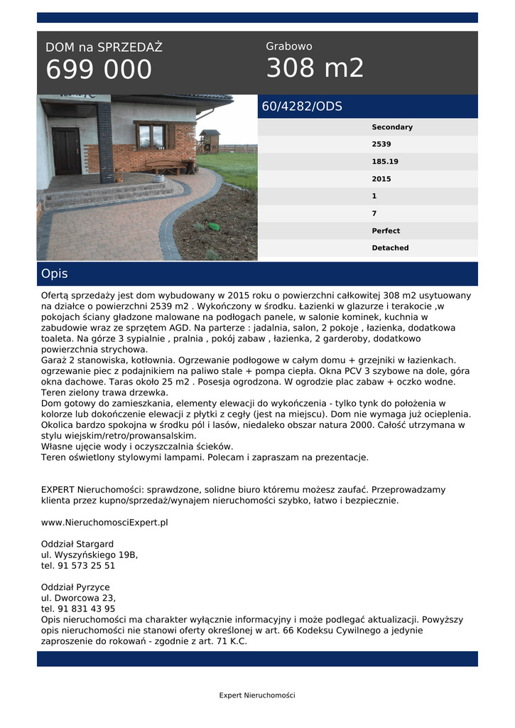 DOM na SPRZEDAŻ 699 000 Grabowo 308 m2 60/4282/ODS Secondary 2539 185.19 2015 1 7 Perfect Detached Opis Ofertą sprzedaży jest dom wybudowany w 2015 roku o powierzchni całkowitej 308 m2 usytuowany na działce o powierzchni 2539 m2 . Wykończony w środku. Łazienki w glazurze i terakocie ,w pokojach ściany gładzone malowane na podłogach panele, w salonie kominek, kuchnia w zabudowie wraz ze sprzętem AGD. Na parterze : jadalnia, salon, 2 pokoje , łazienka, dodatkowa toaleta. Na górze 3 sypialnie , pralnia , pokój zabaw , łazienka, 2 garderoby, dodatkowo powierzchnia strychowa. Garaż 2 stanowiska, kotłownia. Ogrzewanie podłogowe w całym domu + grzejniki w łazienkach. ogrzewanie piec z podajnikiem na paliwo stale + pompa ciepła. Okna PCV 3 szybowe na dole, góra okna dachowe. Taras około 25 m2 . Posesja ogrodzona. W ogrodzie plac zabaw + oczko wodne. Teren zielony trawa drzewka. Dom gotowy do zamieszkania, elementy elewacji do wykończenia - tylko tynk do położenia w kolorze lub dokończenie elewacji z płytki z cegły (jest na miejscu). Dom nie wymaga już ocieplenia. Okolica bardzo spokojna w środku pól i lasów, niedaleko obszar natura 2000. Całość utrzymana w stylu wiejskim/retro/prowansalskim. Własne ujęcie wody i oczyszczalnia ścieków. Teren oświetlony stylowymi lampami. Polecam i zapraszam na prezentacje. EXPERT Nieruchomości: sprawdzone, solidne biuro któremu możesz zaufać. Przeprowadzamy klienta przez kupno/sprzedaż/wynajem nieruchomości szybko, łatwo i bezpiecznie. www.NieruchomosciExpert.pl Oddział Stargard ul. Wyszyńskiego 19B, tel. 91 573 25 51 Oddział Pyrzyce ul. Dworcowa 23, tel. 91 831 43 95 Opis nieruchomości ma charakter wyłącznie informacyjny i może podlegać aktualizacji. Powyższy opis nieruchomości nie stanowi oferty określonej w art. 66 Kodeksu Cywilnego a jedynie zaproszenie do rokowań - zgodnie z art. 71 K.C. Expert Nieruchomości Anna Jarząbek tel. 793057111 email: [email protected] Expert Nieruchomości Powered by TCPDF (www.tcpdf.org)