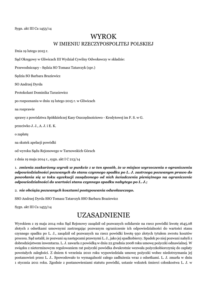 Sygn. akt III Ca 1453/14 WYROK W IMIENIU RZECZYPOSPOLITEJ POLSKIEJ Dnia 19 lutego 2015 r. Sąd Okręgowy w Gliwicach III Wydział Cywilny Odwoławczy w składzie: Przewodniczący - Sędzia SO Tomasz Tatarczyk (spr.) Sędzia SO Barbara Braziewicz SO Andrzej Dyrda Protokolant Dominika Tarasiewicz po rozpoznaniu w dniu 19 lutego 2015 r. w Gliwicach na rozprawie sprawy z powództwa Spółdzielczej Kasy Oszczędnościowo - Kredytowej im F. S. w G. przeciwko J. J., A. J. i E. K. o zapłatę na skutek apelacji powódki od wyroku Sądu Rejonowego w Tarnowskich Górach z dnia 19 maja 2014 r., sygn. akt I C 213/14 1. zmienia zaskarżony wyrok w punkcie 1 w ten sposób, że w miejsce wyrzeczenia o ograniczeniu odpowiedzialności pozwanych do stanu czynnego spadku po L. J. zastrzega pozwanym prawo do powołania się w toku egzekucji zasądzonego od nich świadczenia pieniężnego na ograniczenie odpowiedzialności do wartości stanu czynnego spadku nabytego po L. J.; 2. nie obciąża pozwanych kosztami postępowania odwoławczego. SSO Andrzej Dyrda SSO Tomasz Tatarczyk SSO Barbara Braziewicz Sygn. akt III Ca 1453/14 UZASADNIENIE Wyrokiem z 19 maja 2014 roku Sąd Rejonowy zasądził od pozwanych solidarnie na rzecz powódki kwotę 1645,08 złotych z odsetkami umownymi zastrzegając pozwanym ograniczenie ich odpowiedzialności do wartości stanu czynnego spadku po L. J., zasądził od pozwanych na rzecz powódki kwotę 930 złotych tytułem zwrotu kosztów procesu. Sąd ustalił, że pozwani są następcami prawnymi L. J., jako jej spadkobiercy. Spadek po niej pozwani nabyli z dobrodziejstwem inwentarza. L. J. zawarła z powódką w dniu 22 grudnia 2008 roku umowę pożyczki odnawialnej. W związku z nieterminowym regulowaniem rat pożyczki powódka dwukrotnie wezwała pożyczkobiorczynię do zapłaty powstałych zaległości. Z dniem 6 września 2010 roku wypowiedziała umowę pożyczki wobec niedotrzymania jej postanowień przez L. J.. Spowodowało to wymagalność całego zadłużenia wraz z odsetkami. L. J. zmarła w dniu 1 stycznia 2011 roku. Zgodnie z postanowieniami statutu powódki, ustanie wskutek śmierci członkostwa L. J. w spółdzielczej kasie spowodowało powstanie obowiązku spłaty pożyczki wraz z odsetkami. Na dochodzoną pozwem kwotę składa się niespłacony kapitał z tytułu pożyczki i odsetki karne. Za niezasadny uznał Sąd zarzut przedawnienia podniesiony przez pozwanych. Stwierdził, że odpowiedzialność pozwanych wobec powódki wynika z postanowień umowy pożyczki zawartej z powódką przez ich poprzedniczkę prawną oraz z przepisów kodeksu cywilnego. Przywołał regulację art. 922 § 1 k.c., zgodnie z którą prawa i obowiązki majątkowe zmarłego przechodzą z chwilą jego śmierci na spadkobierców. Wskazał, że jako spadkobiercy L. J. pozwani odpowiadają za jej dług względem powódki. Ponieważ pozwani przyjęli spadek z dobrodziejstwem inwentarza, ich odpowiedzialność stosownie do art. 1031 § 2 k.c. jest ograniczona do wartości stanu czynnego spadku. Wskazał art. 319 k.p.c. jako podstawę ograniczenia w sentencji wyroku zakresu odpowiedzialności pozwanych za dług spadkowy do wartości stanu czynnego spadku. O kosztach procesu rozstrzygnął po myśli art. 98 k.p.c. W apelacji powódka zaskarżyła wyrok w punkcie 1 w zakresie orzeczenia ograniczającego odpowiedzialność pozwanych do wartości stanu czynnego spadku, zarzuciła naruszenie art. 319 k.p.c. przez niewłaściwe zastosowanie polegające na ograniczeniu odpowiedzialności pozwanych za dług spadkowy. W oparciu o ten zarzut domagała się zmiany wyroku poprzez zastrzeżenie pozwanym prawa powołania się na ograniczenie odpowiedzialności do wartości stanu czynnego spadku w miejsce orzeczenia ograniczającego odpowiedzialność pozwanych do wartości stanu czynnego spadku, stwierdzenia oczywistego naruszenia art. 319 k.p.c., zasądzenia od pozwanych solidarnie na jej rzecz kosztów postępowania. Pozwani wnieśli o oddalenie apelacji i zasądzenie od powódki solidarnie na ich rzecz kosztów postępowania apelacyjnego. Sąd Okręgowy zważył, co następuje: Pozwani zostali zobowiązani do zapłaty powódce należności stwierdzonej zaskarżonym wyrokiem z tytułu ich odpowiedzialności za długi spadkowe L. J.. Ponieważ spadek po L. J. pozwani przyjęli z dobrodziejstwem inwentarza, ponoszą odpowiedzialność za długi spadkowe tylko do wartości ustalonego w inwentarzu stanu czynnego spadku ( art. 1031 § 2 k.c. ). W przypadkach, w których pozwany ponosi odpowiedzialność z określonych przedmiotów majątkowych albo do wysokości ich wartości przepis art. 319 k.p.c. przewiduje zastrzeżenie pozwanemu przez sąd w wyroku uwzględniającym powództwo prawa do powołania się w toku postępowania egzekucyjnego na ograniczenie odpowiedzialności. Przepis ten pozostaje w związku z art. 837 k.p.c., z którego wynika, że w postępowaniu egzekucyjnym dłużnik może powoływać się na ograniczenie odpowiedzialności tylko wówczas, gdy ograniczenie to zostało zastrzeżone w tytule wykonawczym. Wyjątkowo zastrzeżenie takie nie jest jednak konieczne, jeżeli świadczenie zostało zasądzone od nabywcy majątku, od zarządcy ustanowionego przez sąd, kuratora spadku lub wykonawcy testamentu z powierzonego im majątku albo od Skarbu Państwa jako spadkobiercy. Uwzględniając roszczenie dochodzone przez powódkę od pozwanych jako spadkobierców pożyczkobiorczyni zasadnie przeto zastosował Sąd Rejonowy w sprawie przepis art. 319 k.p.c. Wyrzeczenie, jakie wobec zastosowania tego przepisu zamieścił w wyroku sformułował jednak w sposób wadliwy, mianowicie nie odpowiadający literalnie brzmieniu art. 319 k.p.c. Sformułowanie zamieszczone w zaskarżonym wyroku w rezultacie zastosowania art. 319 k.p.c. wymagało zatem korekty. Dlatego Sąd Odwoławczy orzekł jak w punkcie 1 wyroku na podstawie art. 386 § 1 k.p.c. Wbrew twierdzeniom apelacji nie zachodziły podstawy do stwierdzenia 