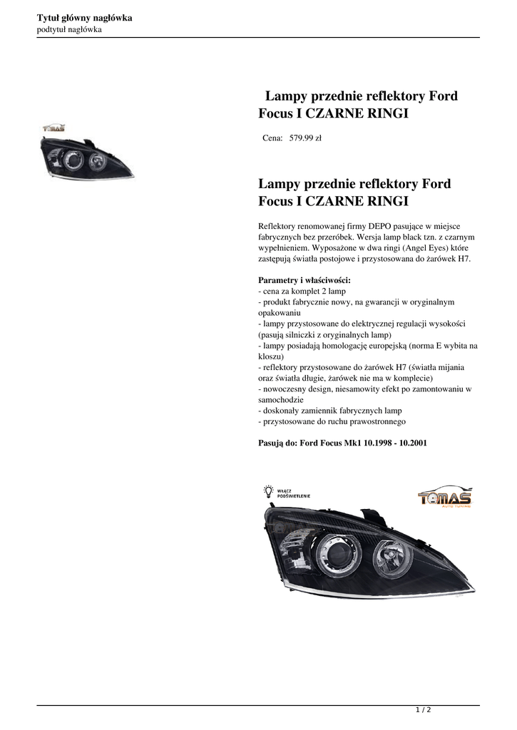 Tytuł główny nagłówka podtytuł nagłówka Lampy przednie reflektory Ford Focus I CZARNE RINGI Cena: 579.99 zł Lampy przednie reflektory Ford Focus I CZARNE RINGI Reflektory renomowanej firmy DEPO pasujące w miejsce fabrycznych bez przeróbek. Wersja lamp black tzn. z czarnym wypełnieniem. Wyposażone w dwa ringi (Angel Eyes) które zastępują światła postojowe i przystosowana do żarówek H7. Parametry i właściwości: - cena za komplet 2 lamp - produkt fabrycznie nowy, na gwarancji w oryginalnym opakowaniu - lampy przystosowane do elektrycznej regulacji wysokości (pasują silniczki z oryginalnych lamp) - lampy posiadają homologację europejską (norma E wybita na kloszu) - reflektory przystosowane do żarówek H7 (światła mijania oraz światła długie, żarówek nie ma w komplecie) - nowoczesny design, niesamowity efekt po zamontowaniu w samochodzie - doskonały zamiennik fabrycznych lamp - przystosowane do ruchu prawostronnego Pasują do: Ford Focus Mk1 10.1998 - 10.2001 1/2 Tytuł główny nagłówka podtytuł nagłówka 2/2 Powered by TCPDF (www.tcpdf.org)