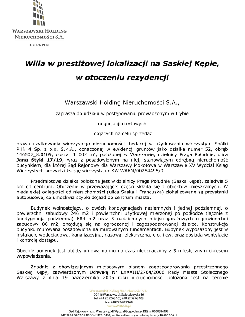 Willa w prestiŜowej lokalizacji na Saskiej Kępie, w otoczeniu rezydencji Warszawski Holding Nieruchomości S.A., zaprasza do udziału w postępowaniu prowadzonym w trybie negocjacji ofertowych mających na celu sprzedaŜ prawa uŜytkowania wieczystego nieruchomości, będącej w uŜytkowaniu wieczystym Spółki PHN 4 Sp. z o.o. S.K.A., oznaczonej w ewidencji gruntów jako działka numer 52, obręb 146507_8.0109, obszar 1 002 m2, połoŜonej w Warszawie, dzielnicy Praga Południe, ulica Jana Styki 17/19, wraz z posadowionym na niej, stanowiącym odrębną nieruchomość budynkiem, dla której Sąd Rejonowy dla Warszawy Mokotowa w Warszawie XV Wydział Ksiąg Wieczystych prowadzi księgę wieczystą nr KW WA6M/00284495/9. Przedmiotowa działka połoŜona jest w dzielnicy Praga Południe (Saska Kępa), zaledwie 5 km od centrum. Otoczenie w przewaŜającej części składa się z obiektów mieszkalnych. W niedalekiej odległości od nieruchomości (ulica Saska i Francuska) zlokalizowane są przystanki autobusowe, co umoŜliwia szybki dojazd do centrum miasta. Budynek wolnostojący, o dwóch kondygnacjach naziemnych i jednej podziemnej, o powierzchni zabudowy 246 m2 i powierzchni uŜytkowej mierzonej po podłodze (łącznie z kondygnacją podziemną) 684 m2 oraz 5 nadziemnych miejsc garaŜowych o powierzchni zabudowy 86 m2, znajdują się na ogrodzonej i zagospodarowanej działce. Konstrukcja budynku murowana posadowiona na murowanych fundamentach. Budynek wyposaŜony jest w instalację wodociągową, kanalizacyjną, gazową, elektryczną, c.o. i cw. oraz posiada wentylację i kontrolę dostępu. Obecnie budynek jest objęty umową najmu na czas nieoznaczony z 3 miesięcznym okresem wypowiedzenia. Zgodnie z obowiązującym miejscowym planem zagospodarowania przestrzennego Saskiej Kępy, zatwierdzonym Uchwałą Nr LXXXIII/2764/2006 Rady Miasta Stołecznego Warszawy z dnia 19 października 2006 roku nieruchomość połoŜona jest na terenie oznaczonym 33-KZ1-M, tj. terenie o przeznaczeniu podstawowym: przeznaczeniu towarzyszącym: usługi nieuciąŜliwe o charakterze lokalnym. mieszkalnictwo, Osoby zainteresowane nabyciem powyŜszej nieruchomości mogą składać oferty w kancelarii Spółki: Warszawski Holding Nieruchomości S. A., CBB Kaskada Al. Jana Pawła II 12, V piętro 00-124 WARSZAWA, z dopiskiem: Oferta na zakup nieruchomości, połoŜonej w Warszawie, przy ul. Jana Styki 17/19. Ofertę naleŜy złoŜyć w nieprzejrzystej, trwale zamkniętej kopercie w Kancelarii Spółki, do godz. 16,00 w nieprzekraczalnym terminie wskazanym poniŜej. W przypadku przesłania oferty pocztą pod uwagę będzie brana data nadania przesyłki. Termin składania ofert upływa 27 listopada 2014 roku Negocjacje rozpoczynają się po terminie składania ofert, o czym zostaną powiadomieni oferenci, którzy złoŜą oferty spełniające warunki formalne oraz proponowana przez nich cena nie będzie odbiegać istotnie od oczekiwań Spółki. Oferty, które wpłyną po terminie nie będą rozpatrywane. Oferta winna być sporządzona w języku polskim, z zachowaniem formy pisemnej pod rygorem niewaŜności i zawierać informacje o proponowanej cenie netto oraz termin związania ofertą, a takŜe iŜ oferta stanowi ofertę w rozumieniu art. 66 § 1 Kodeksu cywilnego. Osoby przystępujące do udziału w negocjacjach zobowiązane są dołączyć do składanej oferty następujące dokumenty, które w przypadku kopii, powinny być potwierdzone za zgodność z oryginałem przez oferenta, jego pełnomocnika lub notariusza: 1. Pisemne oświadczenie o obowiązku zachowania tajemnicy handlowej, co do informacji dotyczących Spółki uzyskanych w trakcie negocjacji; 2. Osoby fizyczne – dokument potwierdzający toŜsamość (kserokopia dowodu osobistego lub paszportu); 3. Przedsiębiorcy wpisani do Centralnej Ewidencji i Informacji o Działalności Gospodarczej – dokument potwierdzający toŜsamość oraz wydruk z Centralnej Ewidencji i Informacji o Działalności Gospodarczej; 4. Reprezentanci spółki prawa handlowego – aktualny odpis z Krajowego Rejestru Sądowego (wystawiony nie wcześniej niŜ 3 miesiące przed upływem terminu składania ofert) lub wydruk z Centralnej Informacji Krajowego Rejestru Sądowego wykazujący umocowanie do reprezentowania danej spółki; 5. Pełnomocnicy – dokument potwierdzający toŜsamość i pisemne pełnomocnictwo oraz: - w przypadku osoby prawnej – oryginał aktualnego odpisu z Krajowego Rejestru Sądowego (wystawiony nie wcześniej niŜ 3 miesiące przed upływem terminu składania ofert) lub wydruk z Centralnej Informacji Krajowego Rejestru Sądowego, wskazujący umocowanie do reprezentowania danej osoby prawnej, - w przypadku przedsiębiorcy wpisanego do Centralnej Ewidencji i Informacji o Działalności Gospodarczej – wydruk z Centralnej Ewidencji i Informacji o Działalności Gospodarczej aktualny w dacie wystawienia pełnomocnictwa, - w przypadku osób fizycznych – pełnomocnictwo w formie notarialnej; 6. Oświadczenie o zapoznaniu się ze stanem fizycznym i prawnym nieruchomości będącej przedmiotem postępowania; 7. Osoby fizyczne - oświadczenie o przetwarzaniu danych zawierające następującą klauzulę: [Imię i Nazwisko osoby biorącej udział w postępowaniu/reprezentującej Spółkę (firmę)] WyraŜam zgodę na przetwarzanie moich danych zawartych w ofercie w celach związanych z postępowaniem na sprzedaŜ nieruchomości w Warszawie, przy ul. Jana Styki 17/19, zgodnie z ustawą z dnia 29.08.1997 o Ochronie Danych Osobowych Cudzoziemcy mogą nabyć nieruchomość na zasadach określonych w ustawie z dnia 24 marca 1920 r. o nabywaniu nieruchomości przez cudzoziemców (Dz. U. z 2004 r. Nr 167 poz. 1758 z późn. zm.). Przed złoŜeniem oferty prosimy o zapoznanie się ze stanem fizycznym i prawnym nieruchomości. Informujemy, Ŝe granice nabywanej nieruchomości nie będą wznawiane na koszt Zbywcy. Koszt aktu notarialnego ponosi kupujący. Po zakończeni