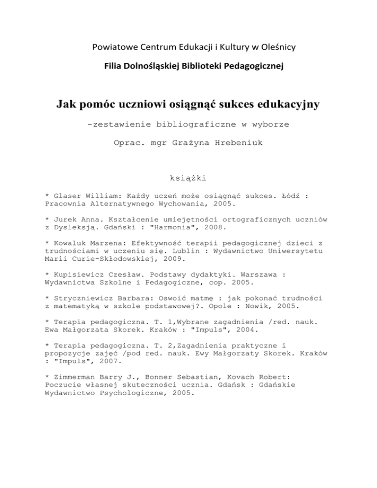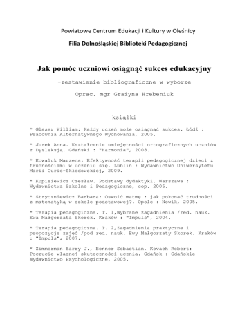 Powiatowe Centrum Edukacji i Kultury w Oleśnicy Filia Dolnośląskiej Biblioteki Pedagogicznej Jak pomóc uczniowi osiągnąć sukces edukacyjny -zestawienie bibliograficzne w wyborze Oprac. mgr Grażyna Hrebeniuk książki * Glaser William: Każdy uczeń może osiągnąć sukces. Łódź : Pracownia Alternatywnego Wychowania, 2005. * Jurek Anna. Kształcenie umiejętności ortograficznych uczniów z Dysleksją. Gdański : "Harmonia", 2008. * Kowaluk Marzena: Efektywność terapii pedagogicznej dzieci z trudnościami w uczeniu się. Lublin : Wydawnictwo Uniwersytetu Marii Curie-Skłodowskiej, 2009. * Kupisiewicz Czesław. Podstawy dydaktyki. Warszawa : Wydawnictwa Szkolne i Pedagogiczne, cop. 2005. * Stryczniewicz Barbara: Oswoić matmę : jak pokonać trudności z matematyką w szkole podstawowej?. Opole : Nowik, 2005. * Terapia pedagogiczna. T. 1,Wybrane zagadnienia /red. nauk. Ewa Małgorzata Skorek. Kraków : "Impuls", 2004. * Terapia pedagogiczna. T. 2,Zagadnienia praktyczne i propozycje zajęć /pod red. nauk. Ewy Małgorzaty Skorek. Kraków : "Impuls", 2007. * Zimmerman Barry J., Bonner Sebastian, Kovach Robert: Poczucie własnej skuteczności ucznia. Gdańsk : Gdańskie Wydawnictwo Psychologiczne, 2005. artykuły z czasopism * Gierszal Krzysztof: Jak ocalić Rolanda? : stare i modne zasady pracy z uczniem, który nie chce się uczyć /. Język Polski w Gimnazjum. R. 9, nr 3 (2007/2008), s. 44-59. * Grodzińska Agnieszka: Komputer na zajęciach wyrównawczych /. Życie Szkoły. 2004, nr 8, s. 46(558)-47(559). * Grzelak Barbara: Problem lateralizacji i leworęczności a niepowodzenia szkolne /. Lider. 2007, nr 5, s. 8-9. * Karpińska Anna: Renesans niepowodzeń edukacyjnych : kierunki i powody naukowej eksploracji /. Nowa Szkoła. 2008, nr 7, s. 4-13. * Kozak Ewa: Niepowodzenia szkolne : jak pracować z uczniami w obszarze dydaktyki? /. Nowa Szkoła. 2005, nr 3, s. 17-21. * Kozieł Beata: Niepowodzenia szkolne - jak im zapobiegać i przeciwdziałać? : (w opinii nauczycieli i rodziców z jastrzębskich szkół) /. Nowa Szkoła. 2008, nr 5, s. 20-33. * Kozieł Beata: Niepowodzenia szkolne - w opinii uczniów z jastrzębskich szkół podstawowych /. Edukacja. 2008, nr 2, s. 47-56. * Krauze-Sikorska Hanna: Jak pomóc dziecku /. Życie Szkoły. 2007, nr 3, s. 5-10. * Krawczyńska Elżbieta: Dla kogo trudna matematyka /. Życie Szkoły. 2004, nr 3, s. 49(177)- 52(180). * Pitala, Magdalena: Jak pomóc dziecku z dyskalkulią? /. Psychologia w Szkole. 2007, nr 4, s. 65-74. * Sarnecki, Robert: Niepowodzenia szkolne uczniów reformowanego gimnazjum /. Nowa Szkoła. 2008, nr 7, s. 32-38. * Sikora Renata: Bezradność, która może prowadzić do depresji /. Nowa Szkoła. 2004, nr 6, s. 52-53. * Stawiak-Ososińska Małgorzata: Jak pomóc dziecku zaadaptować się w szkole? /. Nauczanie Początkowe : kształcenie zintegrowane. R. 30(52), nr 1 (2006/2007), s. 16-20. * Szczekocka-Augustyn Aleksandra: Jak pomóc dziecku być dobrym uczniem /. Edukacja i Dialog. 2006, nr 6, s. 8-12.