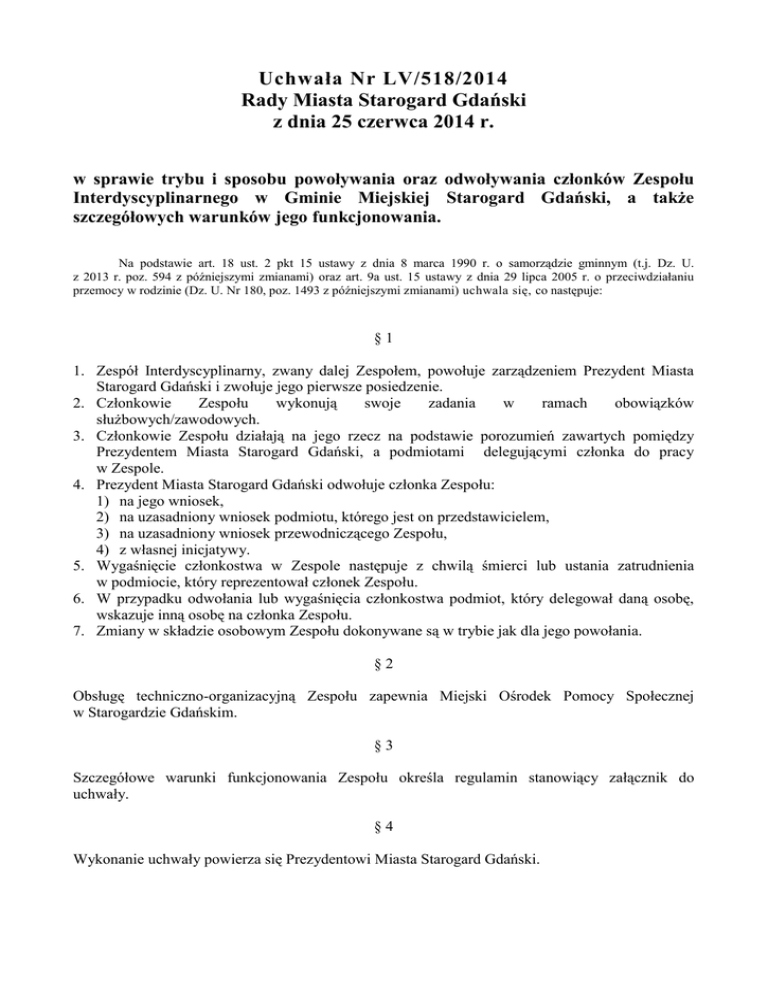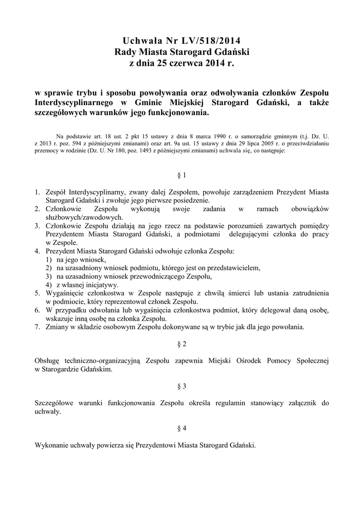Uchwała Nr LV/518/2014 Rady Miasta Starogard Gdański z dnia 25 czerwca 2014 r. w sprawie trybu i sposobu powoływania oraz odwoływania członków Zespołu Interdyscyplinarnego w Gminie Miejskiej Starogard Gdański, a także szczegółowych warunków jego funkcjonowania. Na podstawie art. 18 ust. 2 pkt 15 ustawy z dnia 8 marca 1990 r. o samorządzie gminnym (t.j. Dz. U. z 2013 r. poz. 594 z późniejszymi zmianami) oraz art. 9a ust. 15 ustawy z dnia 29 lipca 2005 r. o przeciwdziałaniu przemocy w rodzinie (Dz. U. Nr 180, poz. 1493 z późniejszymi zmianami) uchwala się, co następuje: §1 1. Zespół Interdyscyplinarny, zwany dalej Zespołem, powołuje zarządzeniem Prezydent Miasta Starogard Gdański i zwołuje jego pierwsze posiedzenie. 2. Członkowie Zespołu wykonują swoje zadania w ramach obowiązków służbowych/zawodowych. 3. Członkowie Zespołu działają na jego rzecz na podstawie porozumień zawartych pomiędzy Prezydentem Miasta Starogard Gdański, a podmiotami delegującymi członka do pracy w Zespole. 4. Prezydent Miasta Starogard Gdański odwołuje członka Zespołu: 1) na jego wniosek, 2) na uzasadniony wniosek podmiotu, którego jest on przedstawicielem, 3) na uzasadniony wniosek przewodniczącego Zespołu, 4) z własnej inicjatywy. 5. Wygaśnięcie członkostwa w Zespole następuje z chwilą śmierci lub ustania zatrudnienia w podmiocie, który reprezentował członek Zespołu. 6. W przypadku odwołania lub wygaśnięcia członkostwa podmiot, który delegował daną osobę, wskazuje inną osobę na członka Zespołu. 7. Zmiany w składzie osobowym Zespołu dokonywane są w trybie jak dla jego powołania. §2 Obsługę techniczno-organizacyjną Zespołu zapewnia Miejski Ośrodek Pomocy Społecznej w Starogardzie Gdańskim. §3 Szczegółowe warunki funkcjonowania Zespołu określa regulamin stanowiący załącznik do uchwały. §4 Wykonanie uchwały powierza się Prezydentowi Miasta Starogard Gdański. §5 Traci moc Uchwała Nr LXIII/551/2010 Rady Miasta Starogard Gdański z dnia 28 października 2010 r. w sprawie trybu i sposobu powoływania i odwoływania członków Zespołu Interdyscyplinarnego oraz szczegółowych warunków jego funkcjonowania w Gminie Miejskiej Starogard Gdański. §6 Uchwała wchodzi w życie po upływie 14 dni od dnia ogłoszenia w Dzienniku Urzędowym Województwa Pomorskiego. Przewodniczący Rady Miasta Starogard Gdański Sławomir Ruśniak UZASADNIENIE Na podstawie art. 6 ust. 2 pkt 4 ustawy z dnia 29 lipca 2005 r. o przeciwdziałaniu przemocy w rodzinie (Dz. U. Nr 180, poz. 1493 z późniejszymi zmianami) tworzenie gminnego systemu przeciwdziałania przemocy w rodzinie, w tym tworzenie zespołów interdyscyplinarnych należy do zadań własnych gminy. Zgodnie z art. 9a ust. 15 ustawy z dnia 29 lipca 2005 r. o przeciwdziałaniu przemocy w rodzinie (Dz. U. Nr 180, poz. 1493 z późniejszymi zmianami) rada gminy określa w drodze uchwały, tryb i powoływania i odwoływania członków zespołu interdyscyplinarnego oraz szczegółowe warunki jego funkcjonowania. Kilkuletni okres działalności Zespołu Interdyscyplinarnego ujawnił potrzebę zmiany w organizacji działania Zespołu Interdyscyplinarnego i grup roboczych z dostosowaniem do aktualnych potrzeb działania w środowisku. Skutki finansowe proponowanych rozwiązań obejmują wydatki związane z pracą Zespołu Interdyscyplinarnego w Gminie Miejskiej Starogard Gdański i grup roboczych (m.in. materiały biurowe, znaczki pocztowe, koszty rozmów telefonicznych). Środki na ten cel zabezpieczono w budżecie Miejskiego Ośrodka Pomocy Społecznej w Starogardzie Gdańskim. Szacunkowa kwota w 2014 r. to 26.000,00 zł. Starogard Gdański, czerwiec 2014 r. Załącznik d o U c h wa ł y N r LV / 5 1 8 / 2 0 1 4 Rady Miasta Starogard Gdański z dnia 25 czerwca 2014 r. Regulamin Zespołu Interdyscyplinarnego w Gminie Miejskiej Starogard Gdański §1 Ilekroć w regulaminie jest mowa o: 1) Zespole – oznacza to Zespół Interdyscyplinarny w Gminie Miejskiej Starogard Gdański, 2) przewodniczącym lub zastępcy przewodniczącego – oznacza to Przewodniczącego lub Zastępcę Przewodniczącego Zespołu Interdyscyplinarnego w Gminie Miejskiej Starogard Gdański, 3) grupie roboczej – oznacza to zespół osób powołanych przez przewodniczącego do pracy w celu rozwiązywania problemów związanych z wystąpieniem przemocy w rodzinie w indywidualnych przypadkach, 4) liderze – oznacza to lidera grupy roboczej, 5) ustawie – oznacza to ustawę z dnia 29 lipca 2005 roku o przeciwdziałaniu przemocy w rodzinie (Dz. U. Nr 180, poz. 1493 z późn. zm.), 6) rozporządzeniu – oznacza to rozporządzenie Rady Ministrów z dnia 13 września 2011 r. w sprawie procedury „Niebieskie Karty” oraz wzorów formularzy „Niebieska Karta” (Dz. U. 209, poz. 1245). §2 1. Na pierwszym posiedzeniu Zespołu, spośród jego członków, wybierany jest przewodniczący oraz zastępca przewodniczącego, przy obecności co najmniej 50% składu Zespołu, większością głosów, w głosowaniu jawnym. O wynikach wyborów przewodniczący informuje pisemnie Prezydenta Miasta Starogard Gdański. 2. Odwołanie przewodniczącego może nastąpić: 1) na uzasadniony pisemny wniosek: a) co najmniej 50% składu Zespołu, b) Prezydenta Miasta Starogard Gdański, 2) w związku ze złożeniem przez niego rezygnacji. 3. Odwołanie następuje w wyniku głosowania jawnego, większością głosów w obecności co najmniej 50% składu Zespołu. 4. W przypadku odwołania przewodniczącego, wybór nowego przewodniczącego następuje na tym samym posiedzeniu Zespołu. 5. Do zadań przewodniczącego należy m.in.: 1) reprezentowanie Zespołu na zewnątrz, 2) kierowanie i koordynowanie pracami Zespołu, 3) zwoływanie i prowadzenie posiedzeń Zespołu, 4) przygotowanie porządku posiedzenia, 5) powoływanie grup roboczych i zwoływanie ich posiedzeń, 6) nadzór nad pracą merytoryczną Zespołu, 7) podpisywanie protokołów, dokumentów i