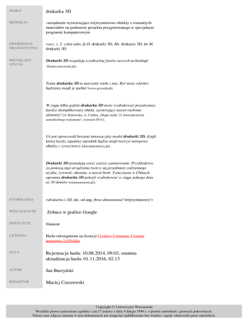 HASŁO drukarka 3D DEFINICJA «urządzenie wytwarzające trójwymiarowe obiekty z rozmaitych materiałów na podstawie projektu przygotowanego w specjalnym programie komputerowym» INFORMACJA GRAMATYCZNA rzecz. ż, 2. człon ndm, lp D. drukarki 3D, Ms. drukarce 3D, lm M. drukarki 3D PRZYKŁADY UŻYCIA Drukarki 3D rozpalają wyobraźnię fanów nowych technologii (biznes.newsweek.pl). Tania drukarka 3D to marzenie wielu z nas. Być może wkrótce będziemy mogli je spełnić (www.pcworld.pl). W ciągu kilku godzin drukarka 3D może wydrukować przestrzenny bardzo skomplikowany obiekt, zawierający nawet ruchome elementy! (A. Kutrowska, A. Czaban, „Magia nauki: 21 doświadczeń do samodzielnego wykonania”, wrzesień 2011). Uczeni opracowali bowiem innowacyjny model drukarki 3D, dzięki której każdy zapalony ogrodnik będzie mógł tworzyć nietypowe obiekty z żywej trawy (dziennikrolniczy.pl). Drukarki 3D posiadają coraz szersze zastosowanie. Przykładowo, za pomocą tego urządzenia tworzy się przedmioty codziennego użytku, żywność, ubrania, a nawet broń. Tymczasem w Chinach ogromna drukarka 3D potrafi wydrukować w ciągu jednego dnia aż 10 domów (zmianynaziemi.pl). ETYMOLOGIA WIZUALIZACJE <drukarka i 3D, skr. od ang. three-dimensional ‘trójwymiarowy’> Zobacz w grafice Google ODSYŁACZE filament LICENCJA Hasło udostępnione na licencji Creative Commons Uznanie autorstwa 3.0 Polska DATA Rejestracja hasła: 10.08.2014, 09.03, ostatnia aktualizacja hasła: 01.11.2016, 02.13 AUTOR Jan Burzyński REDAKTOR Maciej Czeszewski Copyright © Uniwersytet Warszawski Wszelkie prawa zastrzeżone zgodnie z art.17 ustawy z dnia 4 lutego 1994 r. o prawie autorskim i prawach pokrewnych. Teksty oraz zdjęcia zawarte w tym dokumencie nie mogą być publikowane bez wiedzy i zgody właściciela praw autorskich. Powered by TCPDF (www.tcpdf.org)