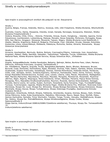 MultiFax - Wygodny i Bezpieczny Faks Internetowy Strefy w ruchu międzynarodowym Spis krajów w poszczególnych strefach dla połączeń na tel. Stacjonarne Strefa 1 Austria, Belgia, Francja, Holandia, Niemcy, Szwecja, USA, USA Freephone, Wielka Brytania, WłochyStrefa 2 Australia, Czechy, Dania, Hiszpania, Irlandia, Izrael, Kanada, Norwegia, Szwajcaria, Watykan, Wielka Brytania FreephoneStrefa 3 Andora, Brazylia, Chile, Chiny, , Estonia, Finlandia, Grecja, Guam, Hongkong, , Islandia, Japonia, Korea Południowa, Liechtenstein, Luksemburg, Malezja, Monako, Nowa Zelandia, Portoryko, Portugalia, Rosja, RPA, San Marino, Singapur, Słowacja, Słowenia, Tajwan, Węgry, Wielka Brytania Local RateStrefa 4 Alaska, Albania, Argentyna, Białoruś, Bułgaria, Chorwacja, Cypr, Gibraltar, Gruzja, Hawaje, Kolumbia, Kostaryka, Litwa, Łotwa,Meksyk, Mołdawia, Palestyna, Rumunia, Serbia, Ukraina, Wenezuela, Wyspy Dziewicze Amerykańskie Strefa 5 Armenia, Azerbejdżan, Bermudy, Bośnia, Boliwia, Czarnogóra,Filipiny, Indonezja, Iran, Kazachstan, Kirgistan, Malawi, Malta, Namibia, Salwador, Tadzykistan, Tajlandia, Turcja, Uzbekistan, Wielka Brytania National Rate, Wielka Brytania Special Service, Wyspy Dziewicze Bryt., Zimbabwe Strefa 6 Angola, Antigua&Barbuda, Arabia Saudyjska, Bahamy, Bahrajn, Belize, Burkina Faso, Liban, Mariany Północne, Polinezja Francuska, Urugwaj, ZambiaStrefa 7 Św. Kitts&Nevis, Algieria, Anguilla, Aruba, Bangladesz,Barbados, Benin, Bhutan, Botswana, Brunei, Burundi, Czad, Dominika, Dominikana, Egipt, Ekwador, Erytrea, Fidżi, Gabon, Gambia, Ghana, Grenada, Guatemala, Gujana Francuska, Gwadelupa, Gwinea, Gwinea Równikowa, Holandia Antyle, Honduras, Indie, Irak, Jamajka, Jemen, Jordania,Kajmany, Kamerun, Kamobodża, Katar, Kenia, Komory, Kongo, Kongo Republika Demokratyczna, Kuwejt, Laos, Lesoto, Liberia, Libia, Macao, Macedonia, Madagaskar, Mali, Maroko,Martynika, Mauretania, Mauritius, Mayotte, Mongolia, Montserrat, Mozambik, Myanmar (Birma), Niger, Nigeria, Nikaragua, Nowa Kaledonia, Oman, Pakistan, Panama, Papua Nowa Gwinea, Paragwaj, Peru, Republika Środkowoafrykańska, Reunion, Rwanda, Samoa Amerykańskie, Senegal, Seszele, Sierra Leone, Sri Lanka, Sudan, Surinam, Swaziland, Syria,Tanzania, Togo, Trynidad&Tobago, Tunezja, Turkmenistan, Uganda, Wielka Brytania Pager, Wielka Brytania Pns, Wietnam, Wybrzeże Kości Słoniowej, Wyspa Św. Łucji, Wyspa Św. Wincenta, Wyspy Bożego Narodzenia, Wyspy Kokosowe, Wyspy Marshalla, Wyspy Owcze, Wyspy Turks&Caicos, Wyspy Zielonego Przylądka, Zjednoczone Emiraty Arabskie Strefa 8 Afganistan, Antarktyda, Dżibuti, Etiopia, Falklandy, Grenlandia, Gujana, Gwinea, Bissau, Haiti, Kiribati, Korea Północna, Kuba, Kuba Guantanamo, Malediwy, Mikronezja, Nauru, Nepal, Niue, Norfolk, Palau, Samoa Zachodnie, Somalia, Timor Wschodni, Tokelau, Tonga, Tuvalu, Vanuatu, Wallis&Futuna, Wyspa Św. Heleny, Wyspa Św. Piotra&Mikelona, Wyspa Wniebowstąpienia, Wyspy Cooka, Wyspy SalomonaStrefa 9 Diego Garcia, Iridium/Emsat 008816/008817(telefonia satelitarna), Thuraya, Wyspy Św. TomaszaStrefa 10 Iridium(telefonia satelitarna) Spis krajów w poszczególnych strefach dla połączeń na tel. Komórkowe Strefa 3 Chiny, Hongkong, Polska, Singapur, http://test.multifax.pl Kreator PDF Utworzono 3-03-2017, 13:11 MultiFax - Wygodny i Bezpieczny Faks Internetowy Strefa 4 Albania, Argentyna, Austria, Belgia, Białoruś, Czechy, Dania, Francja, Grecja, Hiszpania, Irlandia, Izrael, Korea Południowa, Kostaryka, Litwa, Łotwa, Malezja, Meksyk, Niemcy, Norwegia, Palestyna, Słowacja, Szwecja, Tajwan, Ukraina, Wielka Brytania, Włochy, Strefa 5 Andora, Australia, Azerbejdżan, Bośnia, Boliwia, Chorwacja, Czarnogóra, Gruzja, Holandia, Japonia, Kazachstan, Kirgistan, Kolumbia, Luksemburg, Mołdawia, Salwador, Szwajcaria, Tadżykistan, Tajlandia, Uzbekistan, Zimbabwe, Strefa 6 Arabia Saudyjska, Aruba, Bahamy, Bahrajn, Kuwejt, Wybrzeże Kości Słoniowej, Strefa 7 Algieria, Angola, Armenia, Bangladesz, Benin, Botswana, Brazylia, Brunei, Bułgaria, Burundi, Chile, Cypr, Dominika, Dominikana, Egipt, Ekwador, Estonia, Filipiny, Finlandia, Gabon, Gambia, Ghana, Gibraltar, Grenada, Gwadelupa, Gwatemala, Gwinea Równikowa, Honduras, Indie, Indonezja, Iran, Islandia, Jamajka, Jordania, Kamerun, Kambodża, Katar, Kenia, Kongo Republika Demokratyczna, Liberia, Libia, Liechtenstein, Macedonia, Madagaskar, Makau, Malta, Maroko, Mauretania, Mayotte, Monako, Niger, Nigeria, Nikaragua, Nowa Kaledonia, Nowa Zelandia, Oman, Pakistan, Panama, Paragwaj, Portugalia, Reunion, Rosja, RPA, Rumunia, Rwanda, Senegal, Serbia, Sierra Leone, Słowenia, Sri Lanka, Surinam, Swaziland, Syria, Tanzania, Tunezja, Turcja, Uganda, Urugwaj, Węgry, Wietnam, Wyspa św. Łucji, Wyspa św. Wincenta, Zjednoczone Emiraty Arabskie, Strefa 8 Etiopia, Grenlandia, Gujana Francuska, Haiti, Liban, Martynika, Namibia, Wenezuela, http://test.multifax.pl Kreator PDF Utworzono 3-03-2017, 13:11