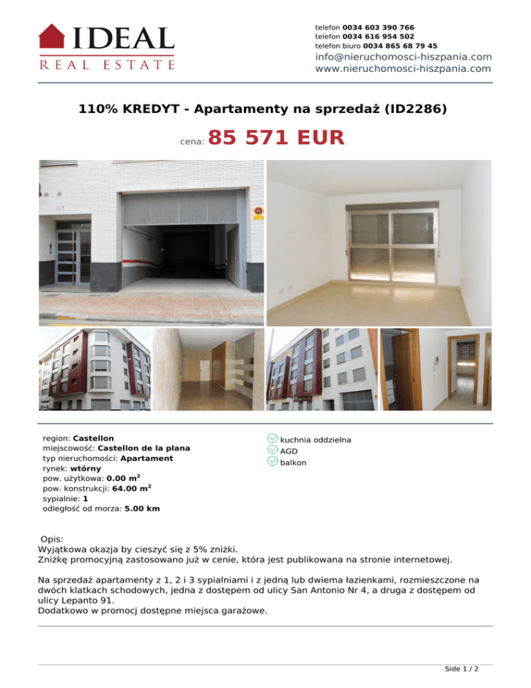 telefon 0034 603 390 766 telefon 0034 616 954 502 telefon biuro 0034 865 68 79 45 [email protected] www.nieruchomosci-hiszpania.com 110% KREDYT - Apartamenty na sprzedaż (ID2286) cena: region: Castellon miejscowość: Castellon de la plana typ nieruchomości: Apartament rynek: wtórny pow. użytkowa: 0.00 m2 pow. konstrukcji: 64.00 m2 sypialnie: 1 odległość od morza: 5.00 km 85 571 EUR kuchnia oddzielna AGD balkon Opis: Wyjątkowa okazja by cieszyć się z 5% zniżki. Zniżkę promocyjną zastosowano już w cenie, która jest publikowana na stronie internetowej. Na sprzedaż apartamenty z 1, 2 i 3 sypialniami i z jedną lub dwiema łazienkami, rozmieszczone na dwóch klatkach schodowych, jedna z dostępem od ulicy San Antonio Nr 4, a druga z dostępem od ulicy Lepanto 91. Dodatkowo w promocj dostępne miejsca garażowe. Side 1 / 2 www.nieruchomosci-hiszpania.com Side 2 / 2 Powered by TCPDF (www.tcpdf.org)