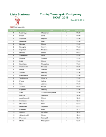 Lista Startowa Turniej Towarzyski Drużynowy SKAT 2016 Data: 2016-06-12 Drużyna Imię Nazwisko Nr dołka Godzina 1 Łazarczyk Waldemar 1 11:00 1 Leach Dave 1 11:00 1 Szpilman Bogdan 1 11:00 1 Ulatowski Piotr 1 11:00 3 Rewako Michał 1 11:12 3 Konopka Henryk 1 11:12 3 Szpilman Marzena 1 11:12 3 Rewako Emilia 1 11:12 5 Sokołowski Lech 1 11:24 5 Zieliński Tomasz 1 11:24 5 Babij Michał 1 11:24 5 Kamińska Magdalena 1 11:24 7 Czerkawski Mariusz 1 11:36 7 Wojak Tomasz 1 11:36 7 Syldatk Andrzej 1 11:36 7 Frankiewicz Bartosz 1 11:36 9 Wojtkiewicz Oksana 1 11:48 9 Piszcz Halina 1 11:48 9 Kłos Joanna 1 11:48 9 Zawisza Marcin 1 11:48 11 Bagiński Andrzej 1 12:00 11 Anna Judycka-Muszyńska 1 12:00 11 Bajczyk Sławomir 1 12:00 11 Andrószowski Michał 1 12:00 13 Svensson Carl 1 12:12 13 Mondalski Piotr 1 12:12 13 Niedziółka Zbigniew 1 12:12 13 Podlaski Karol 1 12:12 15 Szwarc Jarosław 1 12:24 15 Gniazdowski Marcin 1 12:24 15 Piskorski Krzysztof 1 12:24 15 Mydło Mieczysław 1 12:24 17 Koss Dariusz 1 12:36 17 Marszałek Sławomir 1 12:36 17 Alsin Johan 1 12:36 17 Lany Grzegorz 1 12:36 19 Ciesiołkiewicz Jacek 1 12:48 19 Ciesiołkiewicz Marta 1 12:48 19 Zbychorska Dominika 1 12:48 19 Szycik Jarosław 1 12:48 21 Orzech Jacek 1 13:00 21 Łabas Jan 1 13:00 21 Markiewicz Karolina 1 13:00 21 Muller Sebastian 1 13:00 Nr dołka Godzina Flight Imię Nazwisko 2 Sykut Leszek 10 11:00 2 Flont Maciej 10 11:00 2 Sykut Gabriela 10 11:00 2 Rumin Piotr 10 11:00 4 Łukasiński Maciej 10 11:12 4 Kiruja Ernest 10 11:12 4 Krool Robert 10 11:12 4 Hirt Marta 10 11:12 6 Brodowska Małgorzata 10 11:24 6 Piszcz Maciej 10 11:24 6 Podgórski Ryszard 10 11:24 6 Szpejna Krzysztof 10 11:24 8 Wolf Tomasz 10 11:36 8 Lis Zbigniew 10 11:36 8 Baranowski Lech 10 11:36 8 Mazuruk Bartłomiej 10 11:36 10 Bobiński Dariusz 10 11:48 10 Paszkowski Włodzimierz 10 11:48 10 Domosławska Beata 10 11:48 10 Łazarczyk Hanna 10 11:48 12 Bjork Peter 10 12:00 12 Krużyński Mariusz 10 12:00 12 Kamiński Marek 10 12:00 12 Trojan Damian 10 12:00 14 Jankowski Tymoteusz 10 12:12 14 Ute Kisielewski 10 12:12 14 Ciesiołkiewicz Katarzyna 10 12:12 14 Gułaś Agnieszka 10 12:12 16 Jankowski Krzysztof 10 12:24 16 Kisielewski Bogdan 10 12:24 16 Bobińska Barbara 10 12:24 16 Lejderman Richard 10 12:24 18 Gniadecki Sergiusz 10 12:36 18 Rydzkowska Anna 10 12:36 18 Bednarz Wiesław 10 12:36 18 Siemaszko Marek 10 12:36