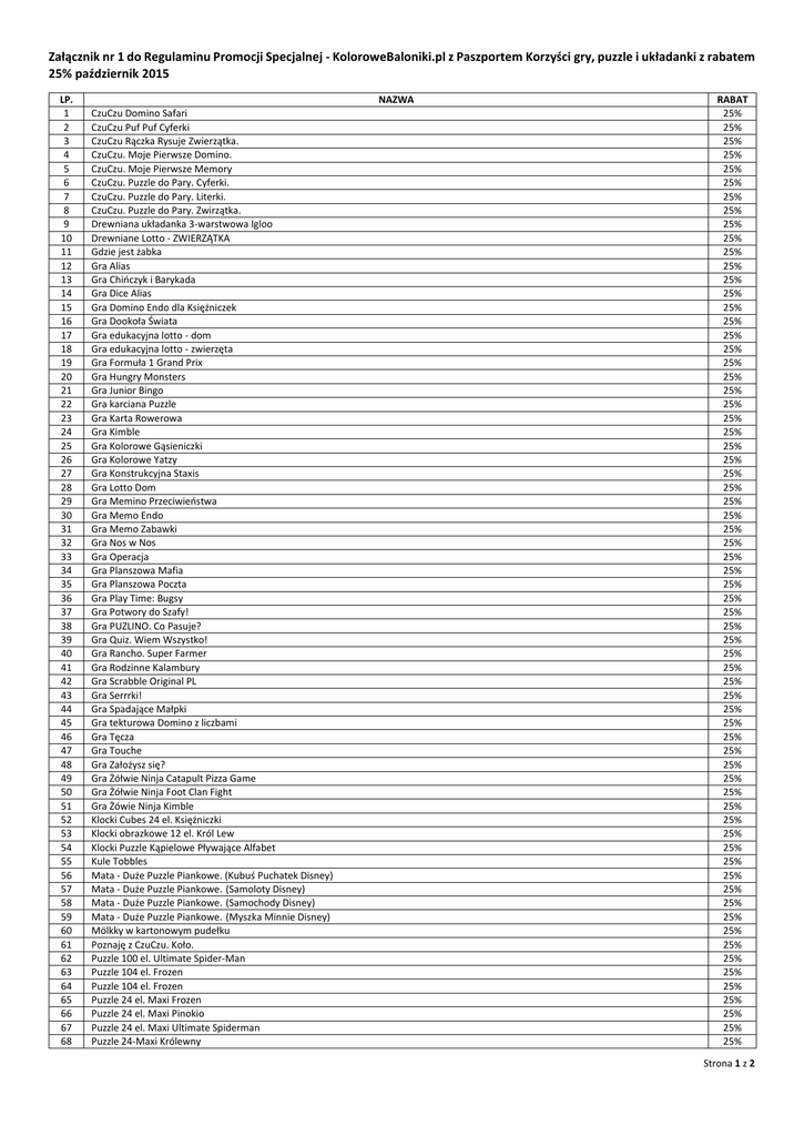 Załącznik nr 1 do Regulaminu Promocji Specjalnej - KoloroweBaloniki.pl z Paszportem Korzyści gry, puzzle i układanki z rabatem 25% październik 2015 LP. 1 2 3 4 5 6 7 8 9 10 11 12 13 14 15 16 17 18 19 20 21 22 23 24 25 26 27 28 29 30 31 32 33 34 35 36 37 38 39 40 41 42 43 44 45 46 47 48 49 50 51 52 53 54 55 56 57 58 59 60 61 62 63 64 65 66 67 68 NAZWA CzuCzu Domino Safari CzuCzu Puf Puf Cyferki CzuCzu Rączka Rysuje Zwierzątka. CzuCzu. Moje Pierwsze Domino. CzuCzu. Moje Pierwsze Memory CzuCzu. Puzzle do Pary. Cyferki. CzuCzu. Puzzle do Pary. Literki. CzuCzu. Puzzle do Pary. Zwirzątka. Drewniana układanka 3-warstwowa Igloo Drewniane Lotto - ZWIERZĄTKA Gdzie jest żabka Gra Alias Gra Chińczyk i Barykada Gra Dice Alias Gra Domino Endo dla Księżniczek Gra Dookoła Świata Gra edukacyjna lotto - dom Gra edukacyjna lotto - zwierzęta Gra Formuła 1 Grand Prix Gra Hungry Monsters Gra Junior Bingo Gra karciana Puzzle Gra Karta Rowerowa Gra Kimble Gra Kolorowe Gąsieniczki Gra Kolorowe Yatzy Gra Konstrukcyjna Staxis Gra Lotto Dom Gra Memino Przeciwieństwa Gra Memo Endo Gra Memo Zabawki Gra Nos w Nos Gra Operacja Gra Planszowa Mafia Gra Planszowa Poczta Gra Play Time: Bugsy Gra Potwory do Szafy! Gra PUZLINO. Co Pasuje? Gra Quiz. Wiem Wszystko! Gra Rancho. Super Farmer Gra Rodzinne Kalambury Gra Scrabble Original PL Gra Serrrki! Gra Spadające Małpki Gra tekturowa Domino z liczbami Gra Tęcza Gra Touche Gra Założysz się? Gra Żółwie Ninja Catapult Pizza Game Gra Żółwie Ninja Foot Clan Fight Gra Żówie Ninja Kimble Klocki Cubes 24 el. Księżniczki Klocki obrazkowe 12 el. Król Lew Klocki Puzzle Kąpielowe Pływające Alfabet Kule Tobbles Mata - Duże Puzzle Piankowe. (Kubuś Puchatek Disney) Mata - Duże Puzzle Piankowe. (Samoloty Disney) Mata - Duże Puzzle Piankowe. (Samochody Disney) Mata - Duże Puzzle Piankowe. (Myszka Minnie Disney) Mölkky w kartonowym pudełku Poznaję z CzuCzu. Koło. Puzzle 100 el. Ultimate Spider-Man Puzzle 104 el. Frozen Puzzle 104 el. Frozen Puzzle 24 el. Maxi Frozen Puzzle 24 el. Maxi Pinokio Puzzle 24 el. Maxi Ultimate Spiderman Puzzle 24-Maxi Królewny RABAT 25% 25% 25% 25% 25% 25% 25% 25% 25% 25% 25% 25% 25% 25% 25% 25% 25% 25% 25% 25% 25% 25% 25% 25% 25% 25% 25% 25% 25% 25% 25% 25% 25% 25% 25% 25% 25% 25% 25% 25% 25% 25% 25% 25% 25% 25% 25% 25% 25% 25% 25% 25% 25% 25% 25% 25% 25% 25% 25% 25% 25% 25% 25% 25% 25% 25% 25% 25% Strona 1 z 2 69 70 71 72 73 74 75 76 77 78 79 80 81 82 83 84 85 86 87 88 89 90 91 92 93 94 95 96 97 98 99 100 101 102 103 104 105 106 107 108 109 110 111 112 113 114 115 116 117 Puzzle 24-Maxi Nemo i przyjaciele Puzzle 2x20 + 2x60 el. Rycerz Mike Puzzle 30el. Miarka Disney Classic Puzzle 3D Big Ben Puzzle 3d Domek Wiktoriański Puzzle 3D Empire State Building Puzzle 3D Opera w Sydney Puzzle 3x Story Klub Przyjaciół Myszki Miki Puzzle 3x Story Księżniczki Puzzle 3x Story Kubuś Puchatek Puzzle Auta 2 160 elementów Puzzle Auta 2 Latający Złomek, 100 elementów Puzzle Chuggington 2x20 elementów Puzzle dla najmłodszych 3 plansze - Króliczki Puzzle Dr McStuffin Mały lekarz 2x12 elementów Puzzle drewniane 24-częściowe ZWIERZAKI Puzzle drewniane 9-częściowe ZWIERZAKI Puzzle Drewniane Dżungla Puzzle drewniane Zwierzęta z łąki Puzzle Księżniczka Sofia 2x12 elementów Puzzle Księżniczki "Letni poranek”, 30 elementów Puzzle Lalaloopsy Chearleaderka, 60 elementów Puzzle Maxi Mermaid 60 el. Puzzle Maxi Minnie's Friends 60 el. Puzzle Maxi: Kubuś Puchatek - Urodziny, 24 elementy Puzzle Maxi: Na boisku, 24 elementy Puzzle My Little Pony Wesołe Miasteczko Puzzle Pałac Księżniczek Puzzle podłogowe Myszka Miki, 60 elementów Puzzle Podłogowe Śnieżka 40 el. Puzzle Smerfy Pod Wodą Puzzle Świat pirata Jake 2x12 elementów Puzzle Wiosenne Oczekiwanie Puzzle XXL Epoka dinozaurów, 100 elementów Puzzle XXL Kopciuszek, 100 elementów Układanka drewniana z bohaterami cyrku Układanka drewniana z bohaterami dżunglia Układanka drewniana z bohaterami podwodnego świata Układanka drewniana z bohaterami podwodnego świata, 25 elementów Układanka drewniana z bohaterami podwodnego świata, 7 elementów Układanka drewniana z bohaterami podwodnego świata, 9 elementów Układanka drewniana z bohaterami wiejskiego podwórka Układanka drewniana z dinozaurami, 7 elemetów Układanka drewniana z dionzaurami, 25 elemetów Układanka drewniana z piłkarzem Układanka drewniana ze słoniem Układanka drewniana ze zwierzątkami, 5 elementów Układanka drewniana ze zwierzątkami, 7 elementów Układanka drewniana zegar 25% 25% 25% 25% 25% 25% 25% 25% 25% 25% 25% 25% 25% 25% 25% 25% 25% 25% 25% 25% 25% 25% 25% 25% 25% 25% 25% 25% 25% 25% 25% 25% 25% 25% 25% 25% 25% 25% 25% 25% 25% 25% 25% 25% 25% 25% 25% 25% 25% Strona 2 z 2