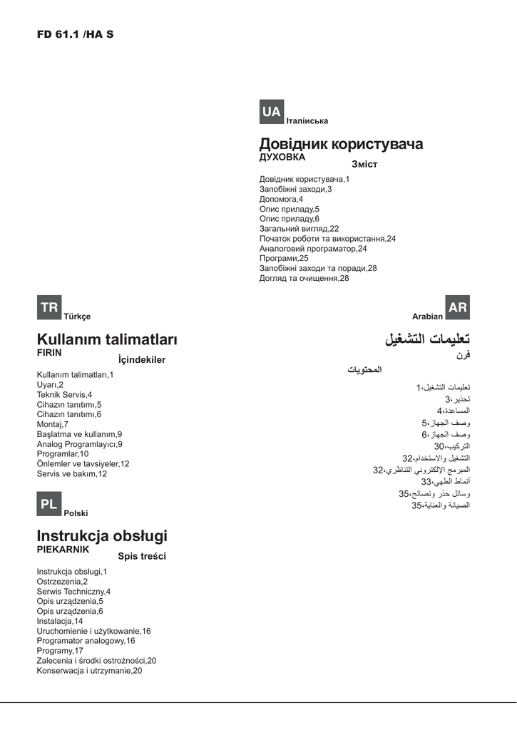 FD 61.1 /HA S Iталiиська Довідник користувача ДУХОВКА Зміст Довідник користувача,1 Запобіжні заходи,3 Допомога,4 Опис приладу,5 Опис приладу,6 Загальний вигляд,22 Початок роботи та використання,24 Аналоговий програматор,24 Програми,25 Запобіжні заходи та поради,28 Догляд та очищення,28 Arabian Türkçe تعليمات التشغيل Kullanım talimatları FIRIN İçindekiler Kullanım talimatları,1 Uyarı,2 Teknik Servis,4 Cihazın tanıtımı,5 Cihazın tanıtımı,6 Montaj,7 Başlatma ve kullanım,9 Analog Programlayıcı,9 Programlar,10 Önlemler ve tavsiyeler,12 Servis ve bakım,12 Polski Instrukcja obsługi PIEKARNIK Spis treści Instrukcja obsługi,1 Ostrzezenia,2 Serwis Techniczny,4 Opis urządzenia,5 Opis urządzenia,6 Instalacja,14 Uruchomienie i użytkowanie,16 Programator analogowy,16 Programy,17 Zalecenia i środki ostrożności,20 Konserwacja i utrzymanie,20 فرن المحتويات 1،تعليمات التشغيل 3،تحذير 4،المساعدة 5،وصف الجهاز 6،وصف الجهاز 30،التركيب 32،التشغيل وااستخدام 32،المبرمج اإلكتروني التناظري 33،أنماط الطهي 35،وسائل حذر ونصائح 35،الصيانة والعناية Uyarı Ostrzezenia DİKKAT: Bu cihaz ve erişilebilen bölümleri, kullanım sırasında çok sıcak olur. Dikkat etmek ve ısıtılan parçalara dokunmaktan kaçınmak gerekir. Eğer sürekli olarak gözetim altında değiller ise, 8 yaşından küçük çocukları uzak tutunuz. Bu cihaz, eğer uygun şekilde gözetim altında bulunuyorlar ise veya güvenli şekilde cihazın kullanımı hakkında eğitim almışlar ise ve ilişkin tehlikeler göz önünde bulundurulur ise, 8 yaşından itibaren çocuklar ve fiziksel, duyusal veya mental kapasitelerden yoksun veya tecrübe ve bilgi sahibi olmayan kişiler tarafından kullanılabilir. Çocuklar, cihaz ile oynamamalıdır. Temizlik ve bakım işlemleri, denetimsiz olarak çocuklar tarafından gerçekleştirilmemelidir. UWAGA: To urządzenie oraz jego dostępne części silnie się rozgrzewają podczas użytkowania. Należy uważać, aby nie dotknąć elementów grzejnych. Nie pozwalać, aby dzieci poniżej 8 roku życia zbliżały się do urządzenia, jeśli nie są pod stałym nadzorem dorosłych. Z niniejszego urządzenia mogą korzystać dzieci powyżej 8 roku życia i osoby o ograniczonych zdolnościach izycznych, zmysłowych bądź umysłowych, jak również osoby nieposiadające doświadczenia lub znajomości urządzenia, jeśli znajdują się one pod nadzorem innych osób lub jeśli zostały pouczone na temat bezpiecznego sposobu użycia urządzenia oraz zdają sobie sprawę ze związanych z nim zagrożeń. Dzieci nie powinny bawić się urządzeniem. Prace związane z czyszczeniem i konserwacją nie mogą być wykonywane przez dzieci, jeśli nie są one nadzorowane. Camın parçalanmasına neden olarak yüzeyi çizebileceğinden, fırının cam kapağını temizlemek için aşındırıcı ürünler ve kesici metal spatulalar kullanmayınız. Cihazı temizlerken asla buharlı yada yüksek basınçlı temizleyiciler kullanmayınız. DİKKAT: Muhtemel elektrik çarpmalarının önüne geçmek için lambayı yenisi ile değiştirmeden önce, cihazın sönük olduğundan emin olunuz. ! Izgara takıldığı zaman, kilidin yukarı doğru dönük ve yuvanın arka tarafında olduğundan emin olunuz. Nie stosować środków ściernych ani ostrych łopatek metalowych do czyszczenia szklanych drzwiczek piekarnika, ponieważ mogłyby porysować powierzchnię i spowodować pęknięcie szyby. Nie stosować nigdy oczyszczaczy parowych lub ciśnieniowych do czyszczenia urządzenia. UWAGA: Przed wymianą żarówki, należy się upewnić, że urządzenie jest wyłączone, aby uniknąć ryzyka porażenia prądem. ! Wsuwając ruszt, należy się upewnić, że ogranicznik jest skierowany ku górze i znajduje się on w tylnej części komory. 2 Запобіжні заходи УВАГА! Під час роботи цей прилад, а так ож його дост упні частини нагріваються до високих температур. Слід бути особливо обережними, щоб не торкатися нагрівальних елементів. Діти віком до 8 років мають знаходитися на небезпечній відстані від приладу, якщо неможливо забезпечити постійний контроль над ними. Дозволяється користування цим приладом дітьми віком від 8 років, а також особами з обмеженими фізичними, сенсорними або розумовими можливостями або особами без належного досвіду і знань, якщо вони перебувають під постійним контролем або проінструктовані щодо правил з небезпечного користування приладу і усвідомлюють ступені ризику. Не дозволяйте дітям гратися з приладом. Операції з очищення і догляду не повинні виконуватися дітьми без належного контролю. تحذيرات يصبح الجهاز واأجزاء المكشوفة ساخنة:تحذير يجب التزام الحرص لتجنب مامسة.أثناء ااستخدام 8 يجب أن يظل اأطفال اأقل من.العناصر التسخين .أعوام بعيدين ما لم تكن هناك ماحظة مستمرة لهم 8 يمكن استخدام هذا الجهاز بوسطة