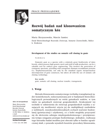 PRACE PRZEGL¥DOWE Rozwój badañ nad klonowaniem somatycznym kóz Maria Skrzyszowska, Marcin Samiec Dzia³ Biotechnologii Rozrodu Zwierz¹t, Instytut Zootechniki, Balice k. Krakowa Development of the studies on somatic cell cloning in goats Summary Domestic goat as a species with a relatively great biodiversity of dairy breeds, which possess high genetic merit and yield of milk production, can be a valuable tool for embryo gene engineering. This involves the generation of transgenic specients, providing with xenogeneic (human) recombinant proteins (i.e. biopharmaceuticals), not only by the standard zygote intrapronuclear microinjection of gene constructs, but above all with the use of somatic cell cloning technology. Key words: goat, somatic cell cloning, nuclear transfer, transgenesis. 1. Wstêp Adres do korespondencji Maria Skrzyszowska, Dzia³ Biotechnologii Rozrodu Zwierz¹t, Instytut Zootechniki, 32-083 Balice k. Krakowa; e-mail: [email protected] 1 (72) 133–150 2006 Metoda klonowania somatycznego technik¹ transplantacji j¹der komórkowych, wykorzystywana jest w badaniach biotechnologicznych prowadzonych na wielu gatunkach ssaków, w tym tak¿e na gatunkach zwierz¹t gospodarskich. Atrakcyjnoœæ tej techniki w odniesieniu do zwierz¹t gospodarskich wynika z rysuj¹cych siê mo¿liwoœci u¿ycia jej do multiplikacji osobników o wybitnych, wysokoodziedziczalnych cechach wartoœci hodowlanej (genetycznej) i u¿ytkowej, co z kolei mog³oby przyczyniæ siê do skrócenia odstêpu miêdzypokoleniowego i przyœpieszenia tempa osi¹gania postêpu hodowlanego. Jednak¿e, realizacja tego kierunku badañ mo¿liwa jest obecnie tylko w bardzo ograniczonej skali, z powodu wysokich kosztów procedury klonowania, Maria Skrzyszowska, Marcin Samiec przy wci¹¿, relatywnie niskiej skutecznoœci metody. Upowszechnienie tej technologii mo¿liwe bêdzie dopiero po osi¹gniêciu wysokiej i stabilnej, tzn. gwarantuj¹cej powtarzalnoœæ wyników, efektywnoœci. Najwiêksze jednak oczekiwania zwi¹zane z praktyczn¹ aplikacj¹ techniki klonowania somatycznego, dotycz¹ mo¿liwoœci wykorzystania jej do produkcji zwierz¹t transgenicznych, cennych ze wzglêdu na produkt ekspresji zmodyfikowanych genów, alternatywnie w stosunku do standardowej techniki uzyskiwania transgenicznych zwierz¹t na drodze mikroiniekcji egzogennych konstrukcji genetycznych do jednego z przedj¹drzy zygot. Klonowanie somatyczne mo¿e byæ tak¿e sposobem multiplikacji ju¿ wyprodukowanych osobników transgenicznych (1-4). 2. Znaczenie gatunkowospecyficznych cech kozy dla genetycznej in¿ynierii embrionalnej Koza (Capra hircus L.) jako gatunek o du¿ej bioró¿norodnoœci ras wykazuj¹cych stosunkowo wysok¹ wydajnoœæ mleczn¹ mo¿e byæ dobrym obiektem dla transgenicznej produkcji rekombinowanych ludzkich bia³ek terapeutycznych. Znaczna efektywnoœæ produkcji oczyszczonych (podlegaj¹cych procesowi puryfikacji) obcogatunkowych biopreparatów przez kozy u³atwi³aby zatem ich stopniowe uzdatnianie w przemyœle farmaceutycznym. Innymi wymiernymi korzyœciami uzyskiwania zmodyfikowanych genetycznie kóz klonalnych, cennych ze wzglêdu na ksenogeniczny produkt ukierunkowanej na gruczo³ mlekowy ekspresji egzogennego DNA s¹: stosunkowo krótki odstêp miêdzypokoleniowy daj¹cy mo¿liwoœæ przyœpieszania tempa osi¹gania postêpu genetycznego w zakresie hodowli tzw. maciorek i koz³ów-za³o¿ycieli rodzicielskich linii transgenicznych (ang. founder animals), a tak¿e niska podatnoœæ ras kóz nale¿¹cych do mlecznego typu u¿ytkowego na infekcje patologicznymi prionami (PrpSc) wywo³uj¹cymi chorobê scrapie (trzêsawkê) u owiec (5). Transgeniczne kozy mog³yby byæ optymalnymi bioreaktorami równie¿ z innego, agroekonomicznego powodu. W porównaniu z chowem krów transgenicznych, zwierzêta te mo¿na ³atwiej hodowaæ, szybciej kierowaæ ich naturalnym i wspomaganym metodami biotechnologicznymi rozrodem, a ich utrzymanie jest znacznie tañsze ni¿ du¿ych prze¿uwaczy. Posiadaj¹ one bowiem doœæ du¿e w stosunku do rozmiarów ich cia³a wymiona o przewadze tkanki gruczo³owej nad w³óknist¹ tkank¹ mi¹¿szow¹ (parenchymaln¹), co ju¿ genetycznie predestynuje ten gatunek ma³ych prze¿uwaczy do wysokiego potencja³u produkcyjnego siary i mleka. Konsekwencj¹ tych anatomiczno-fizjologicznych zalet kóz mo¿e byæ tak¿e wysoka wydajnoœæ stada transgenicznych maciorek w zakresie syntezy i sekrecji rekombinowanych bia³ek terapeutycznych przez komórki pêcherzyków mlekotwórczych, wytwarzaj¹cych wydzielinê o zmodyfikowanym genetycznie sk³adzie jakoœciowym i iloœciowym. Pierwsze transgeniczne koŸlêta klonalne uzyskano po transplantacji zarodków zrekonstruowanych z j¹der komórek somatycznych, transfekowanych in vitro sto134 PRACE PRZEGL¥DOWE Rozwój badañ nad klonowaniem somatycznym kóz sunkowo prostymi konstrukcjami genowymi nie zawieraj¹cymi genomowych sekwencji regionów koduj¹cych transgeny struktury, lecz z³o¿onymi jedynie z segmentów eksonowych genów koduj¹cych markerowe bia³ka selekcyjne, np. fosfotransferazê glicerolow¹/kinazê fosfoglicerolow¹ neomycyny (PGKneo), warunkuj¹c¹ opornoœæ na genetycynê (G418) i/lub reporterowe bia³ko intensywnej zieleni fluorescencyjnej meduzy Aequorea victoria (Egip., ang. enhanced green fluorerescent protein). W doœwiadczeniach Zou i wsp. (6) przeprowadzonych nad klonowaniem somatycznym kóz z wykorzystaniem hodowanych in vitro fibroblastów p³odowych, transfekowanych przy u¿yciu konstruktu genetycznego zawieraj¹cego jedynie gen opornoœci na pochodn¹ neomycyny (neor) wyprodukowano 5 zmodyfikowanych genetycznie koŸl¹t. Z kolei, Keefer i wsp. (3) oraz Baldassarre i wsp. (7,8) zastosowali do zabiegu transfekcji (lipofekcji) in vitro fibroblastów p³odowych bardziej z³o¿on¹ plazmidow¹ konstrukcjê genow¹ (CEeGFP) zawieraj¹c¹: 1) rozbudowan¹ sekwencjê genomow¹ tzw. ludzkiego wariantu genu bia³ka eGFP pod kontrol¹ promotora ludz