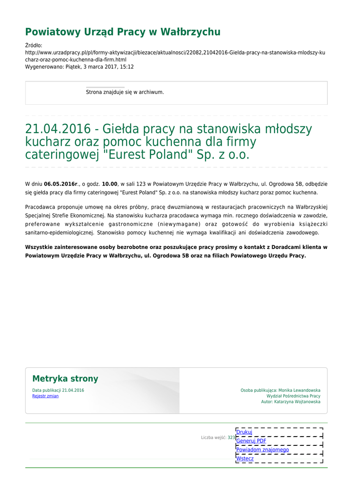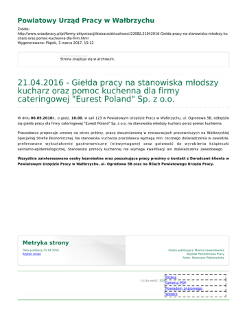 Powiatowy Urząd Pracy w Wałbrzychu Źródło: http://www.urzadpracy.pl/pl/formy-aktywizacji/biezace/aktualnosci/22082,21042016-Gielda-pracy-na-stanowiska-mlodszy-ku charz-oraz-pomoc-kuchenna-dla-firm.html Wygenerowano: Piątek, 3 marca 2017, 15:12 Strona znajduje się w archiwum. 21.04.2016 - Giełda pracy na stanowiska młodszy kucharz oraz pomoc kuchenna dla firmy cateringowej "Eurest Poland" Sp. z o.o. W dniu 06.05.2016r., o godz. 10.00, w sali 123 w Powiatowym Urzędzie Pracy w Wałbrzychu, ul. Ogrodowa 5B, odbędzie się giełda pracy dla firmy cateringowej "Eurest Poland" Sp. z o.o. na stanowiska młodszy kucharz poraz pomoc kuchenna. Pracodawca proponuje umowę na okres próbny, pracę dwuzmianową w restauracjach pracowniczych na Wałbrzyskiej Specjalnej Strefie Ekonomicznej. Na stanowisku kucharza pracodawca wymaga min. rocznego doświadczenia w zawodzie, preferowane wykształcenie gastronomiczne (niewymagane) oraz gotowość do wyrobienia książeczki sanitarno-epidemiologicznej. Stanowisko pomocy kuchennej nie wymaga kwalifikacji ani doświadczenia zawodowego. Wszystkie zainteresowane osoby bezrobotne oraz poszukujące pracy prosimy o kontakt z Doradcami klienta w Powiatowym Urzędzie Pracy w Wałbrzychu, ul. Ogrodowa 5B oraz na filiach Powiatowego Urzędu Pracy. Metryka strony Data publikacji 21.04.2016 Rejestr zmian Osoba publikująca: Monika Lewandowska Wydział Pośrednictwa Pracy Autor: Katarzyna Wojtanowska Liczba wejść: 323 Drukuj Generuj PDF Powiadom znajomego Wstecz