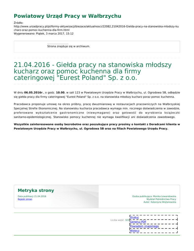 21.04.2016 - Giełda pracy na stanowiska młodszy kucharz oraz