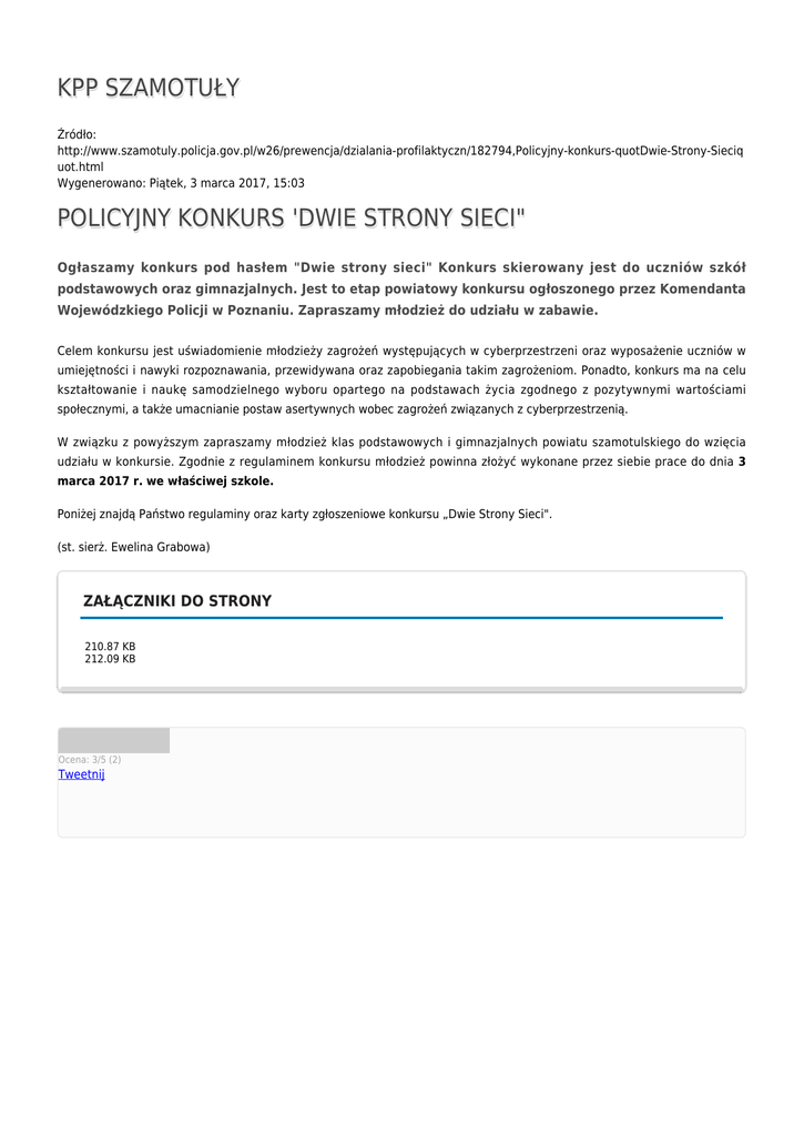 KPP SZAMOTUŁY Źródło: http://www.szamotuly.policja.gov.pl/w26/prewencja/dzialania-profilaktyczn/182794,Policyjny-konkurs-quotDwie-Strony-Sieciq uot.html Wygenerowano: Piątek, 3 marca 2017, 15:03 POLICYJNY KONKURS 'DWIE STRONY SIECI" Ogłaszamy konkurs pod hasłem "Dwie strony sieci" Konkurs skierowany jest do uczniów szkół podstawowych oraz gimnazjalnych. Jest to etap powiatowy konkursu ogłoszonego przez Komendanta Wojewódzkiego Policji w Poznaniu. Zapraszamy młodzież do udziału w zabawie. Celem konkursu jest uświadomienie młodzieży zagrożeń występujących w cyberprzestrzeni oraz wyposażenie uczniów w umiejętności i nawyki rozpoznawania, przewidywana oraz zapobiegania takim zagrożeniom. Ponadto, konkurs ma na celu kształtowanie i naukę samodzielnego wyboru opartego na podstawach życia zgodnego z pozytywnymi wartościami społecznymi, a także umacnianie postaw asertywnych wobec zagrożeń związanych z cyberprzestrzenią. W związku z powyższym zapraszamy młodzież klas podstawowych i gimnazjalnych powiatu szamotulskiego do wzięcia udziału w konkursie. Zgodnie z regulaminem konkursu młodzież powinna złożyć wykonane przez siebie prace do dnia 3 marca 2017 r. we właściwej szkole. Poniżej znajdą Państwo regulaminy oraz karty zgłoszeniowe konkursu „Dwie Strony Sieci". (st. sierż. Ewelina Grabowa) ZAŁĄCZNIKI DO STRONY 210.87 KB 212.09 KB Ocena: 3/5 (2) Tweetnij