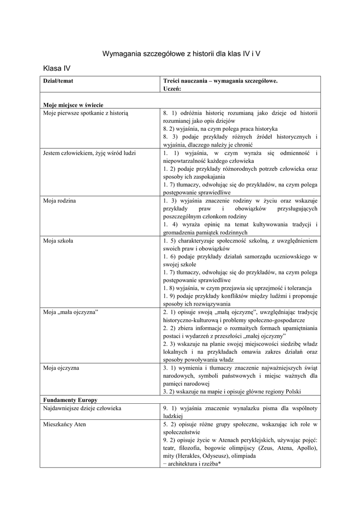 Wymagania szczegółowe z historii dla klas IV i V Klasa IV Dział/temat Moje miejsce w świecie Moje pierwsze spotkanie z historią Jestem człowiekiem, żyję wśród ludzi Moja rodzina Moja szkoła Moja „mała ojczyzna” Moja ojczyzna Fundamenty Europy Najdawniejsze dzieje człowieka Mieszkańcy Aten Treści nauczania – wymagania szczegółowe. Uczeń: 8. 1) odróżnia historię rozumianą jako dzieje od historii rozumianej jako opis dziejów 8. 2) wyjaśnia, na czym polega praca historyka 8. 3) podaje przykłady różnych źródeł historycznych i wyjaśnia, dlaczego należy je chronić 1. 1) wyjaśnia, w czym wyraża się odmienność i niepowtarzalność każdego człowieka 1. 2) podaje przykłady różnorodnych potrzeb człowieka oraz sposoby ich zaspokajania 1. 7) tłumaczy, odwołując się do przykładów, na czym polega postępowanie sprawiedliwe 1. 3) wyjaśnia znaczenie rodziny w życiu oraz wskazuje przykłady praw i obowiązków przysługujących poszczególnym członkom rodziny 1. 4) wyraża opinię na temat kultywowania tradycji i gromadzenia pamiątek rodzinnych 1. 5) charakteryzuje społeczność szkolną, z uwzględnieniem swoich praw i obowiązków 1. 6) podaje przykłady działań samorządu uczniowskiego w swojej szkole 1. 7) tłumaczy, odwołując się do przykładów, na czym polega postępowanie sprawiedliwe 1. 8) wyjaśnia, w czym przejawia się uprzejmość i tolerancja 1. 9) podaje przykłady konfliktów między ludźmi i proponuje sposoby ich rozwiązywania 2. 1) opisuje swoją „małą ojczyznę”, uwzględniając tradycję historyczno-kulturową i problemy społeczno-gospodarcze 2. 2) zbiera informacje o rozmaitych formach upamiętniania postaci i wydarzeń z przeszłości „małej ojczyzny” 2. 3) wskazuje na planie swojej miejscowości siedzibę władz lokalnych i na przykładach omawia zakres działań oraz sposoby powoływania władz 3. 1) wymienia i tłumaczy znaczenie najważniejszych świąt narodowych, symboli państwowych i miejsc ważnych dla pamięci narodowej 3. 2) wskazuje na mapie i opisuje główne regiony Polski 9. 1) wyjaśnia znaczenie wynalazku pisma dla wspólnoty ludzkiej 5. 2) opisuje różne grupy społeczne, wskazując ich role w społeczeństwie 9. 2) opisuje życie w Atenach peryklejskich, używając pojęć: teatr, filozofia, bogowie olimpijscy (Zeus, Atena, Apollo), mity (Herakles, Odyseusz), olimpiada − architektura i rzeźba* Kultura starożytnych Greków Mieszkańcy Rzymu Kultura Rzymu Sztuka wojenna Greków i Rzymian* Narodziny chrześcijaństwa Społeczeństwo średniowiecza Europa średniowieczna W klasztornych murach Na rycerskim zamku W średniowiecznym mieście W średniowiecznej wsi W średniowiecznej Polsce Zanim powstała Polska Mieszko I i jego państwo Panowanie Bolesława Chrobrego Polska w okresie rozbicia dzielnicowego* Kazimierz Wielki i jego państwo − demokracja ateńska* 9. 2) opisuje życie w Atenach peryklejskich, używając pojęć: teatr, filozofia, bogowie olimpijscy (Zeus, Atena, Apollo), mity (Herakles, Odyseusz), olimpiada − rzeźba* 5. 2) opisuje różne grupy społeczne, wskazując ich role w społeczeństwie 9. 3) charakteryzuje osiągnięcia Rzymu, używając pojęć i terminów: prawo rzymskie, drogi, wodociągi 9. 4) opisuje narodziny i rozwój chrześcijaństwa w czasach starożytnych 11. 1) opisuje klasztor średniowieczny i tryb życia mnichów, używając pojęć: zakon, reguła, ubóstwo 11. 2) charakteryzuje postawę św. Franciszka z Asyżu 5. 2) opisuje różne grupy społeczne, wskazując ich role w społeczeństwie 12. 1) charakteryzuje zamek średniowieczny i jego mieszkańców 12. 2) opisuje charakterystyczne cechy wzoru osobowego średniowiecznego rycerza 5. 2) opisuje różne grupy społeczne, wskazując ich role w społeczeństwie 13. 1) opisuje miasto średniowieczne, używając pojęć: kupiec, rzemieślnik, cech, burmistrz, samorząd miejski, rynek, mury miejskie 13. 2) porównuje warunki życia w mieście średniowiecznym i współczesnym 5. 2) opisuje różne grupy społeczne, wskazując ich role w społeczeństwie 14. 1) opisuje warunki życia na wsi średniowiecznej; 14. 2) porównuje życie chłopa z życiem rycerza i mieszczanina 5. 2) opisuje różne grupy społeczne, wskazując ich role w społeczeństwie 10. 1) opowiada legendy o Piaście i Popielu oraz Lechu, Czechu i Rusie, a także rozpoznaje cechy charakterystyczne legendy 10. 1) opowiada legendy o Piaście i Popielu oraz Lechu, Czechu i Rusie, a także rozpoznaje cechy charakterystyczne legendy 10. 2) wskazuje na mapie Gniezno i państwo Mieszka I; 10. 3) opisuje panowanie Mieszka I, umiejscawiając je w czasie i używając pojęć: plemię, gród, drużyna, książę 10. 4) opowiada historię zjazdu gnieźnieńskiego, uwzględniając postacie: św. Wojciecha, Bolesława Chrobrego i Ottona III 10. 5) wskazuje na mapie Kraków i państwo Kazimierza Wielkiego, umiejscawiając je w czasie 10. 6) opowiada o panowaniu Kazimierza Wielkiego, z uwzględnieniem powstania Akademii Krakowskiej i uczty u Wierzynka Klasa V Dział/temat Treści nauczania – wymagania szczegółowe. Uczeń: Czasy nowożytne Odkrycie Nowego Świata 15. 1) przyporządkowuje Krzysztofa Kolumba i jego pierwszą odkrywczą wyprawę właściwej epoce oraz przestrzeni historycznej 15. 2) opisuje odkrycie Krzysztofa Kolumba, używając pojęć: karawela, Nowy Świat, Indianie, broń palna 15. 3) wymienia następstwa wypraw odkrywczych dla Europy i dla Ameryki Narodziny unii polsko-litewskiej 17. 1) wskazuje na mapie Wielkie Księstwo Litewskie 17. 2) wyjaśnia przyczyny unii polsko-litewskiej 17. 3) charakteryzuje Jadwigę i wymienia jej zasługi dla kultury polskiej Wielkie zwycięstwo pod Grunwaldem 17. 4) opowiada o przyczynach i skutkach bitwy pod Grunwaldem Odkrycie Mikołaja Kopernika 16. Mikołaj Kopernik i jego odkrycie16. 1) opowiada o życiu Mikołaja Kopernika, używając pojęć: uczony, astronom, odkrycie naukowe 16. 2) opi