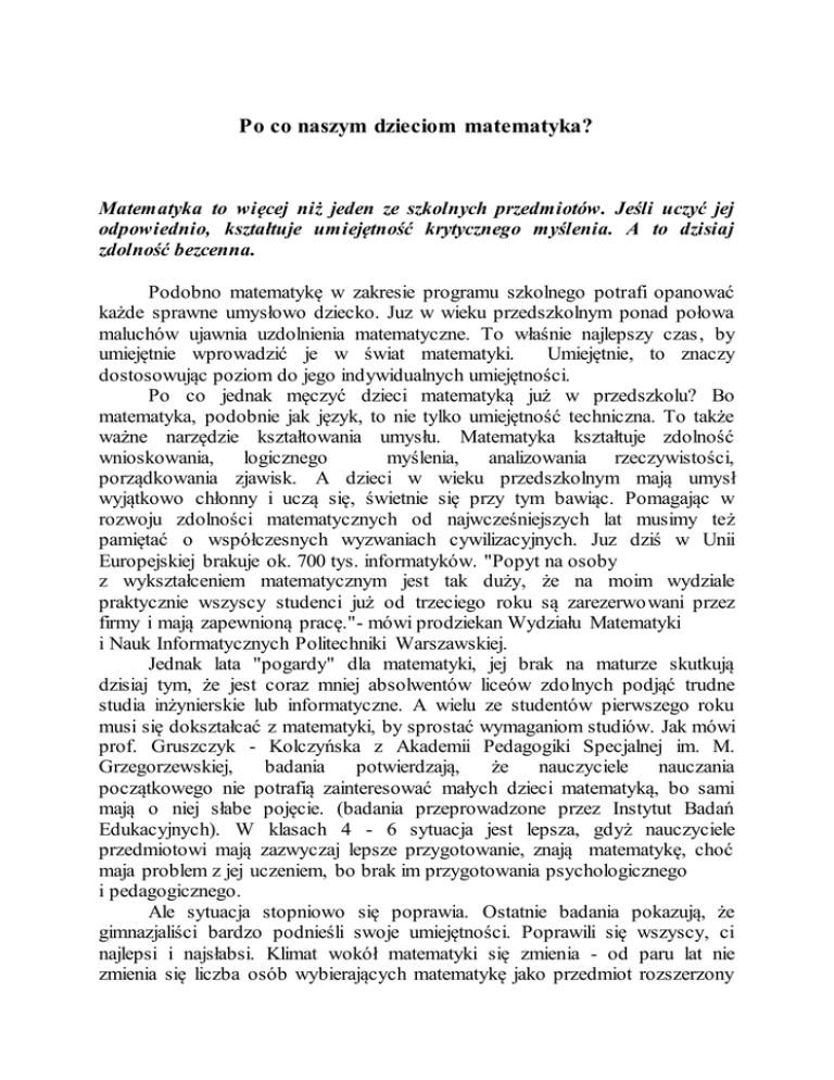 Po co naszym dzieciom matematyka? Matematyka to więcej niż jeden ze szkolnych przedmiotów. Jeśli uczyć jej odpowiednio, kształtuje umiejętność krytycznego myślenia. A to dzisiaj zdolność bezcenna. Podobno matematykę w zakresie programu szkolnego potrafi opanować każde sprawne umysłowo dziecko. Juz w wieku przedszkolnym ponad połowa maluchów ujawnia uzdolnienia matematyczne. To właśnie najlepszy czas, by umiejętnie wprowadzić je w świat matematyki. Umiejętnie, to znaczy dostosowując poziom do jego indywidualnych umiejętności. Po co jednak męczyć dzieci matematyką już w przedszkolu? Bo matematyka, podobnie jak język, to nie tylko umiejętność techniczna. To także ważne narzędzie kształtowania umysłu. Matematyka kształtuje zdolność wnioskowania, logicznego myślenia, analizowania rzeczywistości, porządkowania zjawisk. A dzieci w wieku przedszkolnym mają umysł wyjątkowo chłonny i uczą się, świetnie się przy tym bawiąc. Pomagając w rozwoju zdolności matematycznych od najwcześniejszych lat musimy też pamiętać o współczesnych wyzwaniach cywilizacyjnych. Juz dziś w Unii Europejskiej brakuje ok. 700 tys. informatyków. "Popyt na osoby z wykształceniem matematycznym jest tak duży, że na moim wydziale praktycznie wszyscy studenci już od trzeciego roku są zarezerwowani przez firmy i mają zapewnioną pracę."- mówi prodziekan Wydziału Matematyki i Nauk Informatycznych Politechniki Warszawskiej. Jednak lata "pogardy" dla matematyki, jej brak na maturze skutkują dzisiaj tym, że jest coraz mniej absolwentów liceów zdolnych podjąć trudne studia inżynierskie lub informatyczne. A wielu ze studentów pierwszego roku musi się dokształcać z matematyki, by sprostać wymaganiom studiów. Jak mówi prof. Gruszczyk - Kolczyńska z Akademii Pedagogiki Specjalnej im. M. Grzegorzewskiej, badania potwierdzają, że nauczyciele nauczania początkowego nie potrafią zainteresować małych dzieci matematyką, bo sami mają o niej słabe pojęcie. (badania przeprowadzone przez Instytut Badań Edukacyjnych). W klasach 4 - 6 sytuacja jest lepsza, gdyż nauczyciele przedmiotowi mają zazwyczaj lepsze przygotowanie, znają matematykę, choć maja problem z jej uczeniem, bo brak im przygotowania psychologicznego i pedagogicznego. Ale sytuacja stopniowo się poprawia. Ostatnie badania pokazują, że gimnazjaliści bardzo podnieśli swoje umiejętności. Poprawili się wszyscy, ci najlepsi i najsłabsi. Klimat wokół matematyki się zmienia - od paru lat nie zmienia się liczba osób wybierających matematykę jako przedmiot rozszerzony na maturze, mimo, że z przyczyn demograficznych maleje liczba uczniów podchodzących do matury. Rośnie liczba uczniów startujących w olimpiadach matematycznych. Powstają takie programy jak Uniwersytet Dzieci, ruch olimpijski, autorskie programy dydaktyczne. Ale wciąż podstawą są nauczyciele. Wydział Matematyki i Nauk Informatycznych PW prowadzi internetowy konkurs informatyczny, a najlepsze wyniki osiągają uczniowie z tych szkół, gdzie dyrektorem jest matematyk traktujący ten przedmiot priorytetowo. Wówczas nie ma znaczenia, czy szkoła jest zlokalizowana w Warszawie czy na prowincji. Ważne jest też, by nauczyciele byli nie tylko dobrze przygotowani, ale by zatrudnianiu towarzyszyła pozytywna selekcja promująca najlepszych. Matematyka, podobnie jak język, jest ważnym narzędziem służącym do świadomego bycia w świecie, jego zrozumienia i zmieniania. Dlatego trudno znaleźć racjonalne argumenty przeciwko jej nauczaniu, którego zwieńczeniem jest egzamin maturalny. Nikt juz dzisiaj nie ma chyba wątpliwości, czy uczyć matematyki. Dzisiaj ważniejsze jest pytanie "Jak jej uczyć?". Opracowała Agnieszka Kołątaj, psycholog szkolny, na podstawie artykułu "Ratować talenty przed rzezią" Polityka, nr 43