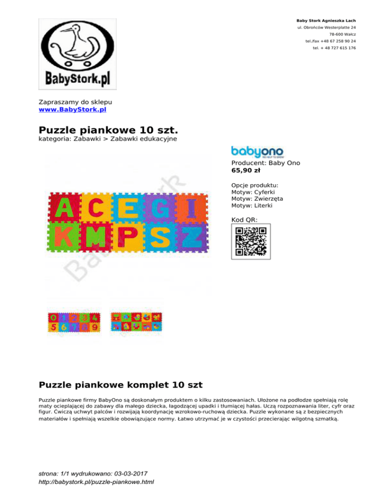 Baby Stork Agnieszka Lach ul. Obrońców Westerplatte 24 78-600 Wałcz tel./fax +48 67 258 90 24 tel. + 48 727 615 176 Zapraszamy do sklepu www.BabyStork.pl Puzzle piankowe 10 szt. kategoria: Zabawki > Zabawki edukacyjne Producent: Baby Ono 65,90 zł Opcje produktu: Motyw: Cyferki Motyw: Zwierzęta Motyw: Literki Kod QR: Puzzle piankowe komplet 10 szt Puzzle piankowe firmy BabyOno są doskonałym produktem o kilku zastosowaniach. Ułożone na podłodze spełniają rolę maty ocieplającej do zabawy dla małego dziecka, łagodzącej upadki i tłumiącej hałas. Uczą rozpoznawania liter, cyfr oraz figur. Ćwiczą uchwyt palców i rozwijają koordynację wzrokowo-ruchową dziecka. Puzzle wykonane są z bezpiecznych materiałów i spełniają wszelkie obowiązujące normy. Łatwo utrzymać je w czystości przecierając wilgotną szmatką. strona: 1/1 wydrukowano: 03-03-2017 http://babystork.pl/puzzle-piankowe.html