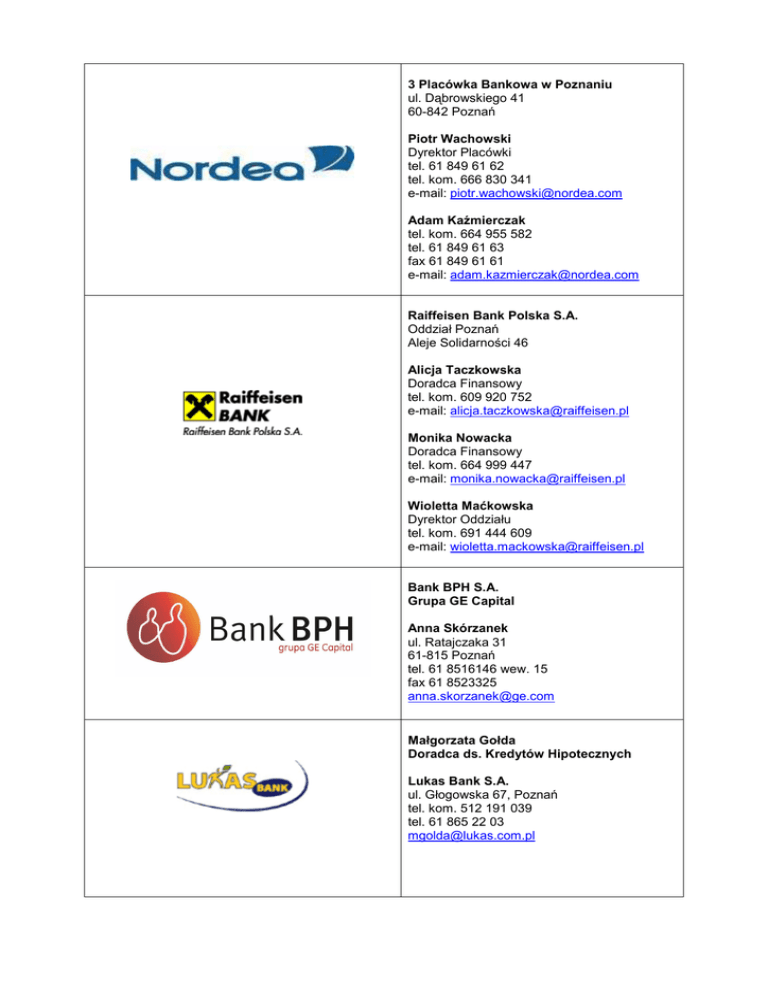3 Placówka Bankowa w Poznaniu ul. Dąbrowskiego 41 60-842 Poznań Piotr Wachowski Dyrektor Placówki tel. 61 849 61 62 tel. kom. 666 830 341 e-mail: [email protected] Adam Kaźmierczak tel. kom. 664 955 582 tel. 61 849 61 63 fax 61 849 61 61 e-mail: [email protected] Raiffeisen Bank Polska S.A. Oddział Poznań Aleje Solidarności 46 Alicja Taczkowska Doradca Finansowy tel. kom. 609 920 752 e-mail: [email protected] Monika Nowacka Doradca Finansowy tel. kom. 664 999 447 e-mail: [email protected] Wioletta Maćkowska Dyrektor Oddziału tel. kom. 691 444 609 e-mail: [email protected] Bank BPH S.A. Grupa GE Capital Anna Skórzanek ul. Ratajczaka 31 61-815 Poznań tel. 61 8516146 wew. 15 fax 61 8523325 [email protected] Małgorzata Gołda Doradca ds. Kredytów Hipotecznych Lukas Bank S.A. ul. Głogowska 67, Poznań tel. kom. 512 191 039 tel. 61 865 22 03 [email protected] Paweł Dubert Doradca Kredytowy Bank Millennium S.A. 61-756 Poznan ul. Małe Garbary 9 tel. kom. 691 86 86 57 [email protected] Marcin Kapciński Specjalista ds. Rynku Mieszkaniowego Bank Zachodni WBK S.A. Pion Bankowości Detalicznej Pl. Wolności 15, 60-967 Poznań tel. kom. 603 974 103 tel. 61 856 59 16 fax 61 852 87 71 e-mail: [email protected] Katarzyna Kasprzak Doradca Bankowy BNP Paribas Fortis Fortis Bank Polska S.A. Oddział w Poznaniu ul. Wierzbięcice 1 61-569 Poznań tel. 61 834 41 25 fax:61 834 41 10 [email protected] Michał Muszyński ul. Towarowa 35,biurowiec "Delta" parter tel. 61 843 52 03 fax. 61 843 51 25 tel. kom. 512-366-035 e-mail: [email protected] Magdalena BłaŜejczyk Doradca Finansowy Dom Kredytowy NOTUS S.A. Poznań, ul. Podgórna 5a tel. 667 965 154 e-mail: [email protected]