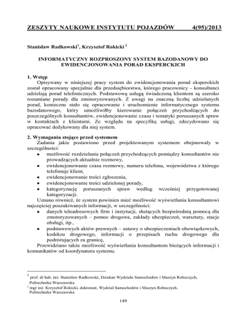 ZESZYTY NAUKOWE INSTYTUTU POJAZDÓW 4(95)/2013 Stanisław Radkowski1, Krzysztof Rokicki 2 INFORMATYCZNY ROZPROSZONY SYSTEM BAZODANOWY DO EWIDENCJONOWANIA PORAD EKSPERCKICH 1. Wstęp Opisywany w niniejszej pracy system do ewidencjonowania porad eksperckich został opracowany specjalnie dla przedsiębiorstwa, którego pracownicy - konsultanci udzielają porad telefonicznych. Podstawową usługą świadczoną klientom są szeroko rozumiane porady dla zmotoryzowanych. Z uwagi na znaczną liczbę udzielanych porad, konieczne stało się opracowanie i uruchomienie informatycznego systemu bazodanowego, który umożliwiłby kierowanie połączeń przychodzących do poszczególnych konsultantów, ewidencjonowanie czasu i tematyki poruszanych spraw w kontaktach z klientami. Ze względu na specyfikę usługi, zdecydowano się opracować dedykowany dla niej system. 2. Wymagania stojące przed systemem Zadania jakie postawiono przed projektowanym systemem obejmowały w szczególności: możliwość rozdzielania połączeń przychodzących pomiędzy konsultantów nie prowadzących aktualnie rozmowy, ewidencjonowanie czasu rozmowy, numeru telefonu, województwa z którego telefonuje klient, ewidencjonowanie treści zgłoszenia, ewidencjonowanie treści udzielonej porady, kategoryzację poruszanych spraw według wcześniej przygotowanej kategoryzacji. Uznano również, że system powinien mieć możliwość wyświetlania konsultantowi najczęściej poszukiwanych informacji, w szczególności: danych teleadresowych firm i instytucji, służących bezpośrednią pomocą dla zmotoryzowanych – pomoc drogowa, zakłady ubezpieczeń, warsztaty, stacje obsługi, itp., podstawowych aktów prawnych – ustawy o ubezpieczeniach obowiązkowych, kodeksu drogowego, informacji o przepisach ruchu drogowego dla podróżujących za granicę, Przewidziano także możliwość wyświetlania konsultantom bieżących informacji i komunikatów od koordynatora systemu. 1 prof. dr hab. inż. Stanisław Radkowski, Dziekan Wydziału Samochodów i Maszyn Roboczych, Politechnika Warszawska 2 mgr inż. Krzysztof Rokicki, doktorant, Wydział Samochodów i Maszyn Roboczych, Politechnika Warszawska 149 3. Architektura systemu Analiza zadań stojących przed systemem pozwoliła dokonać wyboru platformy sprzętowej i programistycznej. Wewnętrzna centrala telefoniczna PBX została przyłączona do sieci telefonicznej za pośrednictwem linii ISDN, z możliwością przełączenia na VoIP. Każdy z aparatów telefonicznych konsultantów został podłączony do centrali, natomiast aplikacja sterująca pracą centrali została zainstalowana na lokalnym Serwerze, działającym pod kontrolą systemu Microsoft Windows. Na Serwerze tym zainstalowano również aplikację rejestrującą rozmowy telefoniczne w formacie plików *.wav. Do ewidencjonowania pracy całego systemu zdecydowano się zbudować rozproszoną, sieciową aplikację bazodanową, działającą w środowisku Microsoft Access 2007. Główny plik bazy danych umieszczono na Serwerze, natomiast na komputerach konsultantów zainstalowano formularze programu Access 2007, korzystające z bazy danych umieszczonej na serwerze za pomocą mechanizmu tabel połączonych [1] w sieci TCP/IP. W tej samej sieci umieszczone zostało stanowisko koordynatora systemu, którego podstawowym zadaniem jest monitorowanie pracy konsultantów oraz systemu – ma on więc możliwość sporządzania raportów dotyczących tematyki poruszanych spraw, wydajności pracy konsultantów, a także dokonywania oceny merytorycznej udzielanych porad – poprzez system monitorowania losowo wybranych nagrań rozmów telefonicznych. Schemat struktury systemu został pokazany na Rysunku 1. Rozproszone bazodanowe rozproszone systemy znajdują obecnie bardzo szerokie zastosowanie w wielu gałęziach usług i przemysłu. Przykładowe wykorzystanie takich systemów opisano w pracach [2], [3]. Rys. 1. Schemat struktury systemu 150 Rys. 2. Główne okno systemu Jedną z podstawowych części systemu są rozproszone aplikacje, zainstalowane na komputerach konsultantów. Przykładowy wygląd okienka z formatką dla konsultanta przedstawiono na Rysunku 2. Posiada ona m. in. przycisk pozwalający odebrać połączenie przychodzące, pola do wpisania słów kluczowych tematyki zgłoszenia oraz dokładnej kategorii poruszanej sprawy. W głównym oknie dostępne są również przyciski otwierające bazę odpowiedzi na najczęściej poruszane sprawy. 4. Szkielet bazy danych Najważniejszym elementem systemu jest baza danych. Główny plik bazy danych znajduje się w udostępnionym konsultantom katalogu na lokalnym serwerze. Szkielet bazy tworzy 29 tabel połączonych relacjami. Schemat relacji przedstawiono na Rysunkach 3 i 4. Główną tabelą jest tabela „Porady”. Posiada ona pola z podstawowymi danymi dotyczącymi udzielonej porady – m. in. unikalny identyfikator porady, data i godzina, identyfikator konsultanta, słowa kluczowe, numer telefonu i województwo z którego dzwonił klient. W bazie zapisywane są również informacje o wybranej kategoryzacji sprawy, instytucji lub firmy do której odesłano klienta. Jeżeli udzielana porada jest z wiązana z wcześniej poruszaną inną sprawą, istnieje możliwość powiązania nowej porady z identyfikatorem porady powiązanej. System zapewnia również możliwość przesyłania krótkich komunikatów tekstowych między koordynatorem i konsultantami. 151 Rys. 3. Relacje między tabelami bazy danych – część 1 152 Rys. 4. Relacje między tabelami bazy danych – część 2 5. Podsumowanie Przedsiębiorca od momentu wdrożenia systemu uzyskał możliwość lepszego zarządzania czasem pracy konsultantów, a także monitorowania jakości udzielanych przez nich porad. Rozbudowany system statystyk i raportowania, a także bezpośredni dostęp konsultantów do odpowiedzi na najczęściej poruszane sprawy, pozwolił również zoptymalizować koszty prowadzenia usługi. Od czasu uruch