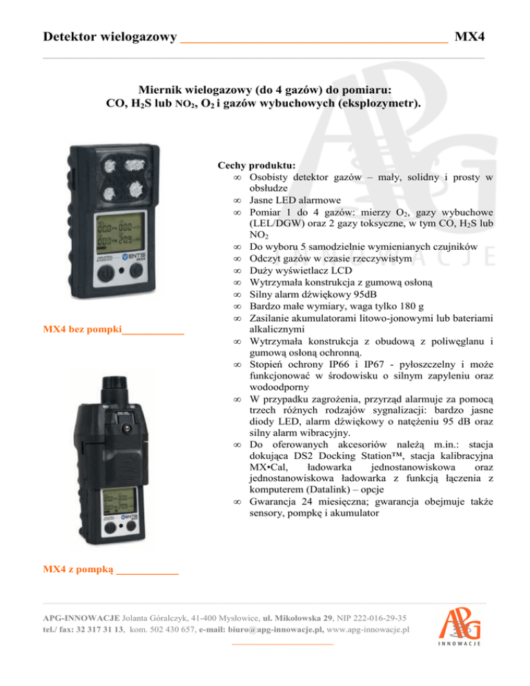 Detektor wielogazowy ___________________________________________ MX4 ______________________________________________________________ Miernik wielogazowy (do 4 gazów) do pomiaru: CO, H2S lub NO2, O2 i gazów wybuchowych (eksplozymetr). MX4 bez pompki__________ Cechy produktu: • Osobisty detektor gazów – mały, solidny i prosty w obsłudze • Jasne LED alarmowe • Pomiar 1 do 4 gazów: mierzy O2, gazy wybuchowe (LEL/DGW) oraz 2 gazy toksyczne, w tym CO, H2S lub NO2 • Do wyboru 5 samodzielnie wymienianych czujników • Odczyt gazów w czasie rzeczywistym • Duży wyświetlacz LCD • Wytrzymała konstrukcja z gumową osłoną • Silny alarm dźwiękowy 95dB • Bardzo małe wymiary, waga tylko 180 g • Zasilanie akumulatorami litowo-jonowymi lub bateriami alkalicznymi • Wytrzymała konstrukcja z obudową z poliwęglanu i gumową osłoną ochronną. • Stopień ochrony IP66 i IP67 - pyłoszczelny i może funkcjonować w środowisku o silnym zapyleniu oraz wodoodporny • W przypadku zagrożenia, przyrząd alarmuje za pomocą trzech różnych rodzajów sygnalizacji: bardzo jasne diody LED, alarm dźwiękowy o natężeniu 95 dB oraz silny alarm wibracyjny. • Do oferowanych akcesoriów należą m.in.: stacja dokująca DS2 Docking Station™, stacja kalibracyjna MX•Cal, ładowarka jednostanowiskowa oraz jednostanowiskowa ładowarka z funkcją łączenia z komputerem (Datalink) – opcje • Gwarancja 24 miesięczna; gwarancja obejmuje także sensory, pompkę i akumulator MX4 z pompką __________ ___________________________________________________________________________________ APG-INNOWACJE Jolanta Góralczyk, 41-400 Mysłowice, ul. Mikołowska 29, NIP 222-016-29-35 tel./ fax: 32 317 31 13, kom. 502 430 657, e-mail: [email protected], www.apg-innowacje.pl ___________________ Detektor wielogazowy ___________________________________________ MX4 ______________________________________________________________ Dane techniczne: • • • • Materiał obudowy: poliwęglan z gumową osłonką ochronną Wymiary: 103 x 68 x 30 mm Waga: z akumulatorami litowo-jonowymi – 180g; z bateriami alkalicznymi – 193g Czujniki: gazy wybuchowe / Metan – sensor katalityczny, dyfuzyjny; O2, CO, H2S lub NO2 – sensor elektrochemiczny • Zakres pomiarowy: gazy wybuchowe: 0-100 % LEL (DGW), co 1 % metan (CH4): 0-5% objętości co 0,1% tlen (O2)–0-30 % obj., co 0,1 % tlenek węgla (CO) – 0-1000 ppm, co 1 ppm siarkowodór (H2S) – 0-500 ppm, co 0,1 ppm dwutlenek azotu (NO2) – 0-150 ppm, co 0,1 ppm • • • Wyświetlacz/ odczyt: ciekłokrystaliczny (LCD) z podświetleniem Zasilanie/ czas pracy: Li-ion – 12 godzin, standardowo, przy 20°C; baterie alkaliczne AAA – 8 godzin, standardowo, przy 20°C Alarmy: bardzo jasne LED, głośny alarm dźwiękowy (95dB w odległości 30cm) i alarm wibracyjny Zakres temperatur pracy: –20°C… +50°C, standardowo Zakres wilgotności pracy: 15 do 95 % RH bez kondensacji (praca ciągła), standardowo Certyfikaty: • • • UL: Klasa I, Dział 1, Grupy A B C D, T4; Klasa II, Grupy F G (pył węglowy i zbożowy); AEx d ia IIC T4; IP66, IP67 ATEX zgodnie z informacjami na stronie przedstawiciela handlowego: Ex d ia I/IIC T4; Grupa i kategoria urządzeń II 2G oraz I M2; IP66, IP67 ATEX zgodnie z informacjami w karcie katalogowej przedstawiciela handlowego: Ex d ia I/IIC T4 Grupa i kategoria urządzeń: II 1G oraz IM1; IP: 66/67 IECEx: Ex d ia IIC T4; IP66, IP67 CSA: Klasa I, Dział 1, Grupy A B C D, T4; C22.2 No. 152 tylko dla odczytów %LEL; Ex d ia IIC T4 ___________________________________________________________________________________ APG-INNOWACJE Jolanta Góralczyk, 41-400 Mysłowice, ul. Mikołowska 29, NIP 222-016-29-35 tel./ fax: 32 317 31 13, kom. 502 430 657, e-mail: [email protected], www.apg-innowacje.pl ___________________