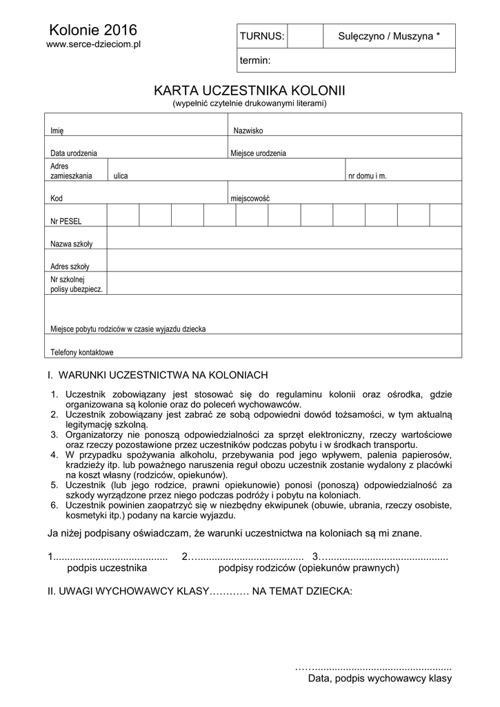 Kolonie 2016 Sulęczyno / Muszyna * TURNUS: www.serce-dzieciom.pl termin: KARTA UCZESTNIKA KOLONII (wypełnić czytelnie drukowanymi literami) Imię Nazwisko Data urodzenia Adres zamieszkania Miejsce urodzenia ulica nr domu i m. Kod miejscowość Nr PESEL Nazwa szkoły Adres szkoły Nr szkolnej polisy ubezpiecz. Miejsce pobytu rodziców w czasie wyjazdu dziecka Telefony kontaktowe I. WARUNKI UCZESTNICTWA NA KOLONIACH 1. Uczestnik zobowiązany jest stosować się do regulaminu kolonii oraz ośrodka, gdzie organizowana są kolonie oraz do poleceń wychowawców. 2. Uczestnik zobowiązany jest zabrać ze sobą odpowiedni dowód tożsamości, w tym aktualną legitymację szkolną. 3. Organizatorzy nie ponoszą odpowiedzialności za sprzęt elektroniczny, rzeczy wartościowe oraz rzeczy pozostawione przez uczestników podczas pobytu i w środkach transportu. 4. W przypadku spożywania alkoholu, przebywania pod jego wpływem, palenia papierosów, kradzieży itp. lub poważnego naruszenia reguł obozu uczestnik zostanie wydalony z placówki na koszt własny (rodziców, opiekunów). 5. Uczestnik (lub jego rodzice, prawni opiekunowie) ponosi (ponoszą) odpowiedzialność za szkody wyrządzone przez niego podczas podróży i pobytu na koloniach. 6. Uczestnik powinien zaopatrzyć się w niezbędny ekwipunek (obuwie, ubrania, rzeczy osobiste, kosmetyki itp.) podany na karcie wyjazdu. Ja niżej podpisany oświadczam, że warunki uczestnictwa na koloniach są mi znane. 1......................................... podpis uczestnika 2…...................................... 3…........................................... podpisy rodziców (opiekunów prawnych) II. UWAGI WYCHOWAWCY KLASY………… NA TEMAT DZIECKA: ……................................................. Data, podpis wychowawcy klasy III. KARTA ZDROWIA UCZESTNIKA KOLONI - wypełniają rodzice (*niepotrzebne skreślić) Imię wiek Nazwisko waga wzrost 1. Moje dziecko: - jest stale leczone z powodu…………………………………..………………………tak / nie* - jest pod stałą opieką poradni (jakich)………………………..………………………tak / nie* - przyjmuje stale leki (proszę podać dawki i częstotliwość) ……………..…………tak / nie* …………………………………………………………………………………………………..... - nosi okulary, aparat ortodontyczny, wkładki ortopedyczne, inne aparaty ............................................................................................................................. tak / nie* - jazdę samochodem/ autobusem znosi dobrze / źle * 2. Moje dziecko często skarży się na: - bóle głowy…………………………..tak / nie* - zawroty głowy………………………tak / nie* - bóle brzucha…………………..……tak / nie* - bóle kręgosłupa…………….………tak / nie* - inne dolegliwości (jakie)………………………………………………………………………… …………………………………………………………………………………………… tak / nie* 3. W ciągu ostatniego roku moje dziecko przebywało w szpitalu…………………. tak / nie* z powodu ……………………………………….………………………………………………. 4. Czy kiedykolwiek zdarzały się dziecku: - omdlenia …………..…………..….tak / nie* - napady drgawkowe……………....tak / nie* - utrata przytomności………..……..tak / nie* - moczenie nocne……………….…tak / nie* - duszności……………….………...tak / nie* - reakcja alergiczna (jeżeli tak, to na co jest uczulone i jak reaguje na daną substancję lub pokarm) ……………………………………………………………………………………………..……… …………………………………………………………………………………………………….. 5. Wyrażam zgodę, aby moje dziecko uczestniczyło w koloniach w Sulęczynie / Muszynie* w dniach ……….…..………………………….. Jednocześnie własnym podpisem zaświadczam, że podałem (am) pełne informacje o stanie zdrowia dziecka. W razie zaistniałej potrzeby zgadzam się na leczenie szpitalne dziecka, zabiegi diagnostyczne, operacje. Stwierdzam, że ze względów zdrowotnych nie ma przeciwskazań do udziału mojego dziecka w aktywnym wypoczynku charakterze taneczno-sportowym oraz, że podałem (am) wszystkie znane mi informacje o dziecku, które mogą pomóc w zapewnieniu mu właściwej opieki w czasie jego pobytu na koloniach. ……………………………………………… czytelny podpis matki lub prawnej opiekunki ………………………………………… czytelny podpis ojca lub prawnego opiekuna 6. Inne uwagi rodziców na temat dziecka (dla potrzeb opiekunów):