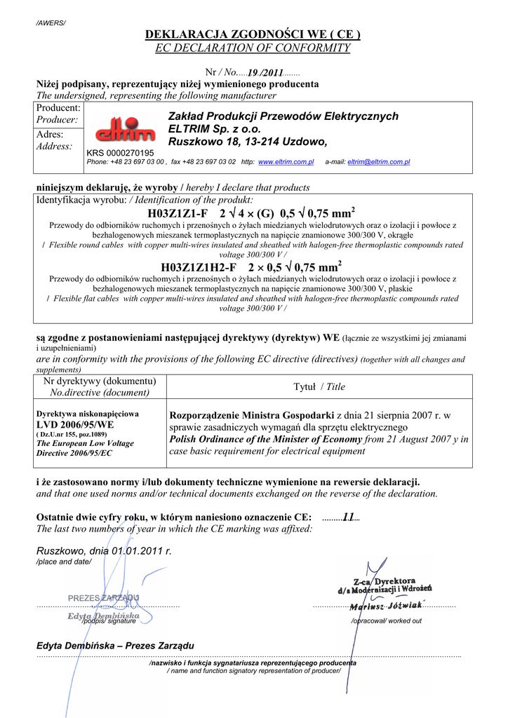 /AWERS/ DEKLARACJA ZGODNOŚCI WE ( CE ) EC DECLARATION OF CONFORMITY Nr / No.……………………… 19 /2011 Niżej podpisany, reprezentujący niżej wymienionego producenta The undersigned, representing the following manufacturer Producent: Zakład Produkcji Przewodów Elektrycznych Producer: ELTRIM Sp. z o.o. Adres: Ruszkowo 18, 13-214 Uzdowo, Address: KRS 0000270195 Phone: +48 23 697 03 00 , fax +48 23 697 03 02 http: www.eltrim.com.pl a-mail: [email protected] niniejszym deklaruję, że wyroby / hereby I declare that products Identyfikacja wyrobu: / Identification of the produkt: H03Z1Z1-F 2 ÷ 4 × (G) 0,5 ÷ 0,75 mm2 Przewody do odbiorników ruchomych i przenośnych o żyłach miedzianych wielodrutowych oraz o izolacji i powłoce z bezhalogenowych mieszanek termoplastycznych na napięcie znamionowe 300/300 V, okrągłe / Flexible round cables with copper multi-wires insulated and sheathed with halogen-free thermoplastic compounds rated voltage 300/300 V / H03Z1Z1H2-F 2 × 0,5 ÷ 0,75 mm2 Przewody do odbiorników ruchomych i przenośnych o żyłach miedzianych wielodrutowych oraz o izolacji i powłoce z bezhalogenowych mieszanek termoplastycznych na napięcie znamionowe 300/300 V, płaskie / Flexible flat cables with copper multi-wires insulated and sheathed with halogen-free thermoplastic compounds rated voltage 300/300 V / są zgodne z postanowieniami następującej dyrektywy (dyrektyw) WE (łącznie ze wszystkimi jej zmianami i uzupełnieniami) are in conformity with the provisions of the following EC directive (directives) (together with all changes and supplements) Nr dyrektywy (dokumentu) No.directive (document) Dyrektywa niskonapięciowa LVD 2006/95/WE ( Dz.U.nr 155, poz.1089) The European Low Voltage Directive 2006/95/EC Tytuł / Title Rozporządzenie Ministra Gospodarki z dnia 21 sierpnia 2007 r. w sprawie zasadniczych wymagań dla sprzętu elektrycznego Polish Ordinance of the Minister of Economy from 21 August 2007 y in case basic requirement for electrical equipment i że zastosowano normy i/lub dokumenty techniczne wymienione na rewersie deklaracji. and that one used norms and/or technical documents exchanged on the reverse of the declaration. Ostatnie dwie cyfry roku, w którym naniesiono oznaczenie CE: The last two numbers of year in which the CE marking was affixed: 11 …………….. Ruszkowo, dnia 01.01.2011 r. /place and date/ ……………………………………………………… /podpis/ signature ……………………………………………………… /opracował/ worked out Edyta Dembińska – Prezes Zarządu ……………………………………………………………………………………………………………………………………………………………………. /nazwisko i funkcja sygnatariusza reprezentującego producenta / name and function signatory representation of producer/ /REWERS/ DEKLARACJA ZGODNOŚCI WE EC DECLARATION OF CONFORMITY Nr ……………………… 19 /2011 Normy i/lub dokumentacje techniczne, lub ich części, zastosowane do wyrobu, którego dotyczy niniejsza deklaracja zgodności: Standards and/or technical documentation, or their parts, used to product whose refers the present declaration of conformity: - normy zharmonizowane: / Harmonized standards: / Numer Wydanie Tytuł / Title / / Number / / Edition / PN-HD 21.14 / HD 21.14/ S1.2003 Przewody o izolacji termoplastycznej na napięcie znamionowe nie przekraczające 450/750 V. Część 14: Przewody do odbiorników ruchomych i przenośnych (sznury) o izolacji i powłoce z bezhalogenowych mieszanek termoplastycznych. / Cables of rated voltage up to and including 450/750 V and having thermoplastic insulation. Part 14: Flexible cables (cords,) insulated and sheathed with halogen-free thermoplastic compounds / PN-HD 516 / HD 516 / S2.2003 Wytyczne stosowania niskonapięciowych przewodów zharmonizowanych / Guide to use of low voltage harmonized cables/ Część /Unit/ - inne normy i/lub dokumentacje techniczne: / other standards and/or technical documentation: / Numer Wydanie Część Tytuł / Title / / Number / / Edition / /Unit/ PN-EN ISO 9001 / EN ISO 9001:2008/ 2009 PN-EN 60332-1-2 2005 Systemy zarządzania jakością / Quality management systems – Requirements/ Badania palności kabli i przewodów elektrycznych oraz światłowodowych Część 1-2: Sprawdzanie odporności pojedynczego izolowanego przewodu lub kabla na pionowe rozprzestrzenianie się płomienia - Metoda badania palnikiem z płomieniem mieszankowym 1 kW / EN 60332-1-2:2004 Tests on electric and optical fibre cables under fire conditions -Part 1-2: Test for vertical flame propagation for a single insulated wire or cable - Procedure for 1 kW pre-mixed flame / - inne rozwiązania techniczne, szczegóły, które zostały włączone do dokumentacji technicznej - other technical solutions, details, which get included to technical documentation Inne dokumenty lub informacje wymagane przez dyrektywę(-y) WE: Other documents or informations demand by EC directives: - Certyfikat Systemu Zarządzania Jakością wg PN-EN ISO 9001:2009, nr certyfikatu 325/5/2009, wydany przez Polskie Centrum Badań i Certyfikacji S.A. - PCBC / the certificate Quality Management Systems according to EN ISO 9001:2008, No. of certificate325/5/2009 signum by Polish Center of Research and Certification – PCBC/
