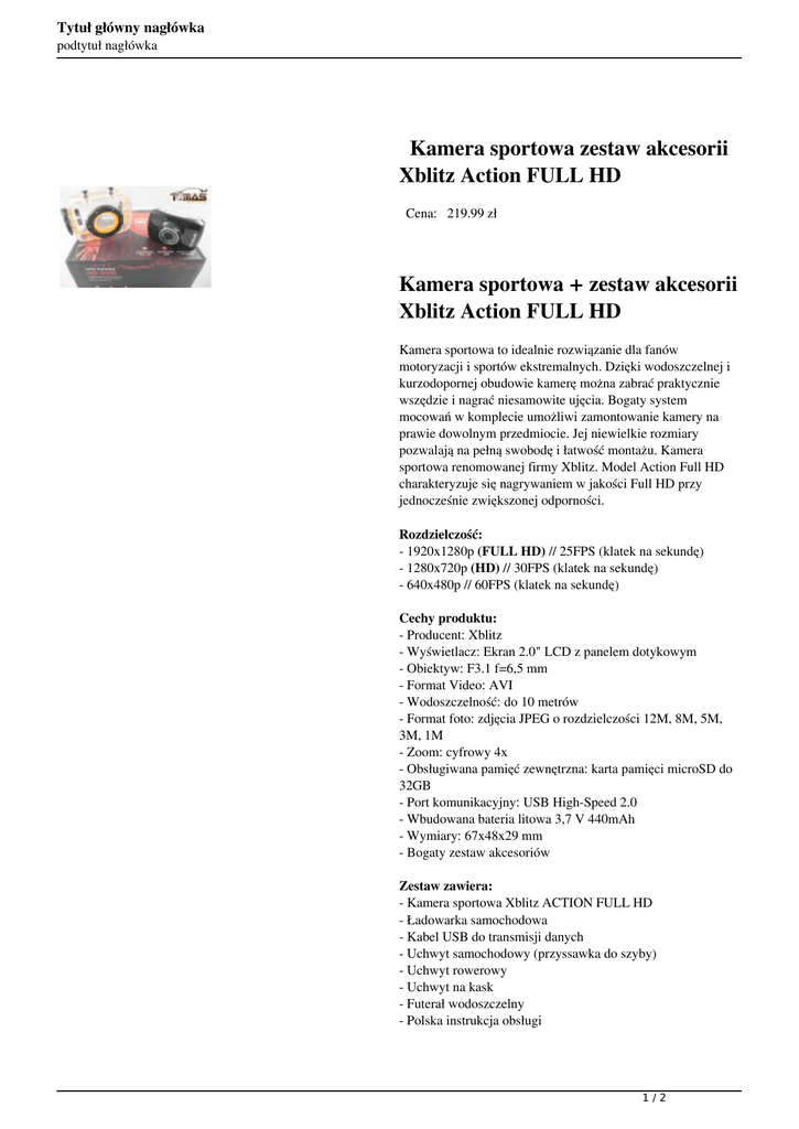 Tytuł główny nagłówka podtytuł nagłówka Kamera sportowa zestaw akcesorii Xblitz Action FULL HD Cena: 219.99 zł Kamera sportowa + zestaw akcesorii Xblitz Action FULL HD Kamera sportowa to idealnie rozwiązanie dla fanów motoryzacji i sportów ekstremalnych. Dzięki wodoszczelnej i kurzodopornej obudowie kamerę można zabrać praktycznie wszędzie i nagrać niesamowite ujęcia. Bogaty system mocowań w komplecie umożliwi zamontowanie kamery na prawie dowolnym przedmiocie. Jej niewielkie rozmiary pozwalają na pełną swobodę i łatwość montażu. Kamera sportowa renomowanej firmy Xblitz. Model Action Full HD charakteryzuje się nagrywaniem w jakości Full HD przy jednocześnie zwiększonej odporności. Rozdzielczość: - 1920x1280p (FULL HD) // 25FPS (klatek na sekundę) - 1280x720p (HD) // 30FPS (klatek na sekundę) - 640x480p // 60FPS (klatek na sekundę) Cechy produktu: - Producent: Xblitz - Wyświetlacz: Ekran 2.0" LCD z panelem dotykowym - Obiektyw: F3.1 f=6,5 mm - Format Video: AVI - Wodoszczelność: do 10 metrów - Format foto: zdjęcia JPEG o rozdzielczości 12M, 8M, 5M, 3M, 1M - Zoom: cyfrowy 4x - Obsługiwana pamięć zewnętrzna: karta pamięci microSD do 32GB - Port komunikacyjny: USB High-Speed 2.0 - Wbudowana bateria litowa 3,7 V 440mAh - Wymiary: 67x48x29 mm - Bogaty zestaw akcesoriów Zestaw zawiera: - Kamera sportowa Xblitz ACTION FULL HD - Ładowarka samochodowa - Kabel USB do transmisji danych - Uchwyt samochodowy (przyssawka do szyby) - Uchwyt rowerowy - Uchwyt na kask - Futerał wodoszczelny - Polska instrukcja obsługi 1/2 Tytuł główny nagłówka podtytuł nagłówka Zobacz film nagrany tą kamerą: 2/2 Powered by TCPDF (www.tcpdf.org)