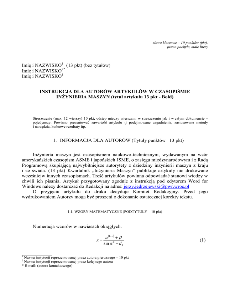 słowa kluczowe – 10 punktów (pkt), pismo pochyłe, małe litery Imię i NAZWISKO1 (13 pkt) (bez tytułów) Imię i NAZWISKO2* Imię i NAZWISKO1 INSTRUKCJA DLA AUTORÓW ARTYKUŁÓW W CZASOPIŚMIE INŻYNIERIA MASZYN (tytuł artykułu 13 pkt - Bold) Streszczenie (max. 12 wierszy) 10 pkt, odstęp między wierszami w streszczeniu jak i w całym dokumencie – pojedynczy. Powinno prezentować zawartość artykułu tj podejmowane zagadnienia, zastosowane metody i narzędzia, końcowe rezultaty itp. 1. INFORMACJA DLA AUTORÓW (Tytuły punktów 13 pkt) Inżynieria maszyn jest czasopismem naukowo-technicznym, wydawanym na wzór amerykańskich czasopism ASME i japońskich JSME, o zasięgu międzynarodowym i z Radą Programową skupiającą najwybitniejsze autorytety z dziedziny inżynierii maszyn z kraju i ze świata. (13 pkt) Kwartalnik „Inżynieria Maszyn” publikuje artykuły nie drukowane wcześniejw innych czasopismach. Treść artykułów powinna odpowiadać stanowi wiedzy w chwili ich pisania. Artykuł przygotowany zgodnie z instrukcją pod edytorem Word for Windows należy dostarczać do Redakcji na adres: [email protected] O przyjęciu artykułu do druku decyduje Komitet Redakcyjny. Przed jego wydrukowaniem Autorzy mogą być proszeni o dokonanie ostatecznej korekty tekstu. 1.1. WZORY MATEMATYCZNE (PODTYTUŁY 10 pkt) Numeracja wzorów w nawiasach okrągłych. x a 1 z sin 2 d 2 ____________ 1 Nazwa instytucji reprezentowanej przez autora pierwszego – 10 pkt Nazwa instytucji reprezentowanej przez kolejnego autora * E-mail: (autora kontaktowego) 2 (1) gdzie: a- amplituda, d2. TABELE / ILUSTRACJE Tytuły tabel i podpisy pod rysunkami wyśrodkowane, w języku polskim i angielskim (10 pkt). Tabela 1. Tytuł tabeli Table 1. Title of table A 12 B 5 C 8,9 Odległość rysunku od tekstu jak i od podpisu rysunku 0,5cm. Liczby dziesiętne należy pisać w tekście, w tabelach i na rysunkach z przecinkiem. ILUSTRACJA Rys. 1. Podpis do rysunku Fig. 1. Figure caption Ważne jest, aby wielkość fontów w opisach na rysunkach była nie mniejsza niż w podpisach pod rysunkami tj. nie mniej niż 10 pkt. 3. PODSUMOWANIE/WNIOSKI/WNIOSKI KOŃCOWE Każdy artykuł powinien zawierać pewne zakończenie w formie podsumowania lub wniosków itp. Przy formatowaniu tekstu można korzystać z odpowiednich stylów o nazwach rozpoczynających się od IM. (opcjonalnie – np.) Badania wykonano w ramach w projektu …………….….. współfinansowanego przez …… …….. w ramach działania …….. LITERATURA (10 pkt.) [1] [2] AKMEASE R., EASTHAM J., 1992, Design of permanent magnet at linear motors, IEEE Trans Magn, 28/5, 302-306. ZIENKIEWICZ O.C., 1971, The Finite Element Method in engineering science, McGraw-Hill Companies, London. [3] [4] http://www.heidenhain.com/site.html Powołania na literaturę w tekście podawać w nawiasach kwadratowych [2], [4-6]. Opis bibliograficzny zamieścić w kolejności alfabetycznej nazwisk autorów (10 pkt.), należy unikać grupowych powołań. TYTUŁ ARTYKUŁU W JĘZYKU ANGIELSKIM (10 pkt) Streszczenie referatu w języku angielskim pisane na całą szerokość strony bez wcięcia akapitowego (10 pkt). Keywords: słowa kluczowe w języku angielskim
