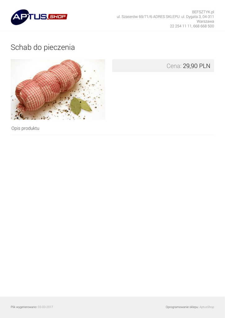 BEFSZTYK.pl ul. Szaserów 69/71/6 ADRES SKLEPU: ul. Dygata 3, 04-311 Warszawa 22 254 11 11, 668 668 500 Schab do pieczenia Cena: 29,90 PLN Opis produktu Plik wygenerowano: 03-03-2017 Powered by TCPDF (www.tcpdf.org) Oprogramowanie sklepu: AptusShop