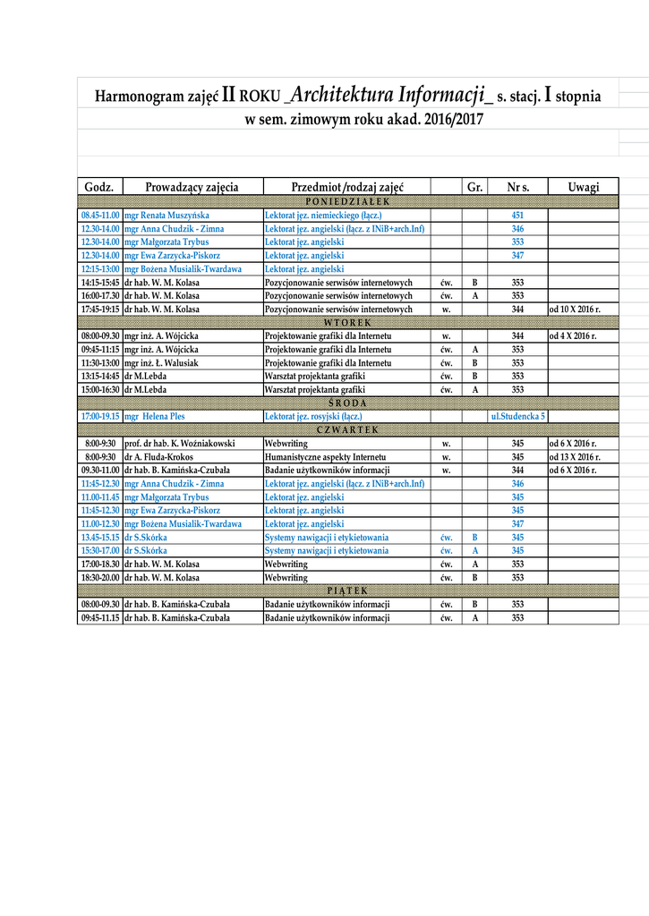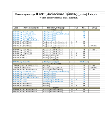 Harmonogram zajęć II ROKU _Architektura Informacji_ s. stacj. I stopnia w sem. zimowym roku akad. 2016/2017 Godz. Prowadzący zajęcia 08.45-11.00 12.30-14.00 12.30-14.00 12.30-14.00 12:15-13:00 14:15-15:45 16:00-17.30 17:45-19:15 mgr Renata Muszyńska mgr Anna Chudzik - Zimna mgr Małgorzata Trybus mgr Ewa Zarzycka-Piskorz mgr Bożena Musialik-Twardawa dr hab. W. M. Kolasa dr hab. W. M. Kolasa dr hab. W. M. Kolasa 08:00-09.30 09:45-11:15 11:30-13:00 13:15-14:45 15:00-16:30 mgr inż. A. Wójcicka mgr inż. A. Wójcicka mgr inż. Ł. Walusiak dr M.Lebda dr M.Lebda 17:00-19.15 mgr Helena Ples 8:00-9:30 8:00-9:30 09.30-11.00 11:45-12.30 11.00-11.45 11:45-12.30 11.00-12.30 13.45-15.15 15:30-17.00 17:00-18.30 18:30-20.00 prof. dr hab. K. Woźniakowski dr A. Fluda-Krokos dr hab. B. Kamińska-Czubała mgr Anna Chudzik - Zimna mgr Małgorzata Trybus mgr Ewa Zarzycka-Piskorz mgr Bożena Musialik-Twardawa dr S.Skórka dr S.Skórka dr hab. W. M. Kolasa dr hab. W. M. Kolasa 08:00-09.30 dr hab. B. Kamińska-Czubała 09:45-11.15 dr hab. B. Kamińska-Czubała Przedmiot /rodzaj zajęć PONIEDZIAŁEK Lektorat jęz. niemieckiego (łącz.) Lektorat jęz. angielski (łącz. z INiB+arch.Inf) Lektorat jęz. angielski Lektorat jęz. angielski Lektorat jęz. angielski Pozycjonowanie serwisów internetowych Pozycjonowanie serwisów internetowych Pozycjonowanie serwisów internetowych WTOREK Projektowanie grafiki dla Internetu Projektowanie grafiki dla Internetu Projektowanie grafiki dla Internetu Warsztat projektanta grafiki Warsztat projektanta grafiki ŚRODA Lektorat jęz. rosyjski (łącz.) CZWARTEK Webwriting Humanistyczne aspekty Internetu Badanie użytkowników informacji Lektorat jęz. angielski (łącz. z INiB+arch.Inf) Lektorat jęz. angielski Lektorat jęz. angielski Lektorat jęz. angielski Systemy nawigacji i etykietowania Systemy nawigacji i etykietowania Webwriting Webwriting PIĄTEK Badanie użytkowników informacji Badanie użytkowników informacji Gr. Nr s. Uwagi 451 346 353 347 ćw. ćw. w. w. ćw. ćw. ćw. ćw. B A A B B A 353 353 344 344 353 353 353 353 od 10 X 2016 r. od 4 X 2016 r. ul.Studencka 5 w. w. w. ćw. ćw. ćw. ćw. B A A B 345 345 344 346 345 345 347 345 345 353 353 ćw. ćw. B A 353 353 od 6 X 2016 r. od 13 X 2016 r. od 6 X 2016 r.