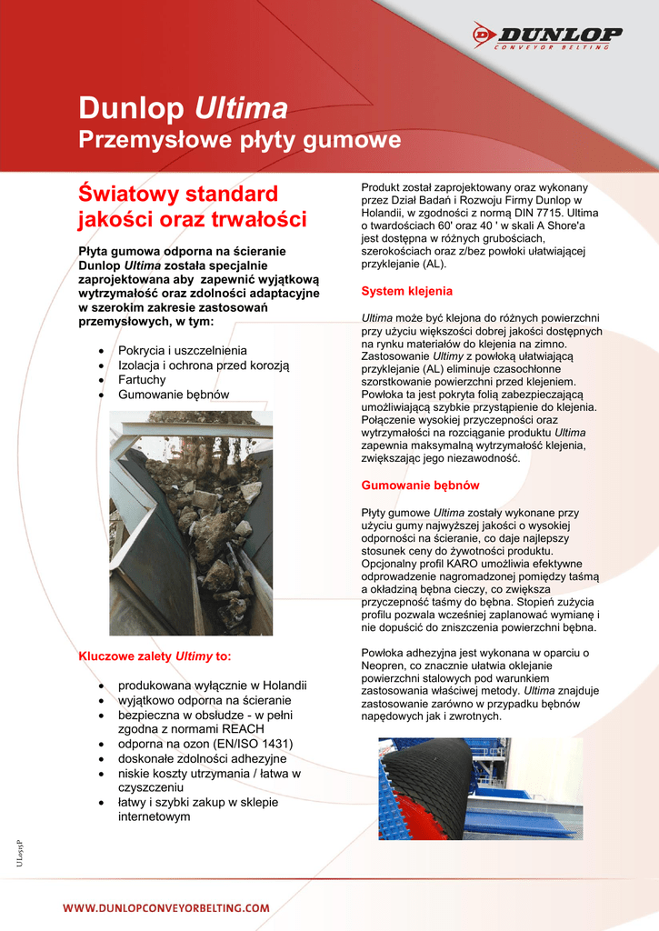 Dunlop Ultima Przemysłowe płyty gumowe Światowy standard jakości oraz trwałości Płyta gumowa odporna na ścieranie Dunlop Ultima została specjalnie zaprojektowana aby zapewnić wyjątkową wytrzymałość oraz zdolności adaptacyjne w szerokim zakresie zastosowań przemysłowych, w tym: Pokrycia i uszczelnienia Izolacja i ochrona przed korozją Fartuchy Gumowanie bębnów Produkt został zaprojektowany oraz wykonany przez Dział Badań i Rozwoju Firmy Dunlop w Holandii, w zgodności z normą DIN 7715. Ultima o twardościach 60' oraz 40 ' w skali A Shore'a jest dostępna w różnych grubościach, szerokościach oraz z/bez powłoki ułatwiającej przyklejanie (AL). System klejenia Ultima może być klejona do różnych powierzchni przy użyciu większości dobrej jakości dostępnych na rynku materiałów do klejenia na zimno. Zastosowanie Ultimy z powłoką ułatwiającą przyklejanie (AL) eliminuje czasochłonne szorstkowanie powierzchni przed klejeniem. Powłoka ta jest pokryta folią zabezpieczającą umożliwiającą szybkie przystąpienie do klejenia. Połączenie wysokiej przyczepności oraz wytrzymałości na rozciąganie produktu Ultima zapewnia maksymalną wytrzymałość klejenia, zwiększając jego niezawodność. Gumowanie bębnów Płyty gumowe Ultima zostały wykonane przy użyciu gumy najwyższej jakości o wysokiej odporności na ścieranie, co daje najlepszy stosunek ceny do żywotności produktu. Opcjonalny profil KARO umożliwia efektywne odprowadzenie nagromadzonej pomiędzy taśmą a okładziną bębna cieczy, co zwiększa przyczepność taśmy do bębna. Stopień zużycia profilu pozwala wcześniej zaplanować wymianę i nie dopuścić do zniszczenia powierzchni bębna. Kluczowe zalety Ultimy to: UL0515P produkowana wyłącznie w Holandii wyjątkowo odporna na ścieranie bezpieczna w obsłudze - w pełni zgodna z normami REACH odporna na ozon (EN/ISO 1431) doskonałe zdolności adhezyjne niskie koszty utrzymania / łatwa w czyszczeniu łatwy i szybki zakup w sklepie internetowym Powłoka adhezyjna jest wykonana w oparciu o Neopren, co znacznie ułatwia oklejanie powierzchni stalowych pod warunkiem zastosowania właściwej metody. Ultima znajduje zastosowanie zarówno w przypadku bębnów napędowych jak i zwrotnych. Karta Charakterystki Technicznej Gęstość (g/cm3) Twardość (°Shore A) Wytrzymałość na rozciąganie (mm3) Wydłużenie (MPa) Odporność na ozon (%) Ozone resistance >% Kolor Ultima 40 Ultima 60 Ultima 60 PL 0.98 ± 0.03 1.13 ± 0.03 1.17 ± 0.03 DIN 53479 40 ± 5 60 ± 5 62 ± 5 DIN 53505 130 120 130 DIN 53516 18 700 100% Czerwony 15 420 100% Czarny 14 350 100% Czarny DIN 53504 DIN 53504 ISO 1431 - Gama produktów Ultima Grubość (mm) Szerokość (mm) Ultima 40 2000 6 2000 8 2000 10 Ultima 60 2000 6 2000 8 2000 10 2000 12 Ultima 60 Pulley Lagging 1500 8 1500 10 Długość (m) Numer produktu bez powłoki ułatwiającej klejenie Numer prduktu z powłoką ułatwiającą klejenie 10 10 10 9540U06 9540U08 9540U10 N/A N/A 10 10 10 10 9560U06 9560U08 9560U10 9560U12 9560UA10 9560UA12 10 10 N/A N/A 9560PL08 9560PL10 Produkty niestandardowe dla wymagających klientów Wszystkie produkty firmy Dunlop wytwarzane są we własnych zakładach w Holandii. Ta samowystarczalność umożliwia pełną kontrolę jakości podczas procesu produkcyjnego, oraz elastyczność w tworzeniu niestandardowych produktów w odpowiedzi na potrzeby klientów. Istnieje możliwość wyprodukowania płyt gumowych Ultima o grubości od 3mm do 40mm w rolkach do 100 m długości. 9540UA10 N/A N/A Wsparcie techniczne Zakup produktów z logo Dunlop to nie tylko gwarancja najwyższej jakości. To również zapewnienie niezrównanego poziomu usług przez jeden z najbardziej doświadczonych i wysoko wykwalifikowanych zespołów specjalistów i inżynierów w branży, a co za tym idzie niezwrównane doradztwo techniczne, wskazówki i praktyczne wsparcie. Kliknij aby sprawdzić ceny i złożyć zamówienie: www.dunlopcbdirect.com Wszelkie informacje i zalecenia w tym biuletynie zostały przygotowane w oparciu o naszą najlepszą wiedzę wraz z uwzględnieniem najnowszych osiągnięć technologicznych firmy Dunlop. Nie przyjmujemy odpowiedzialności za zalecenia oparte tylko i wyłącznie na tym dokumencie. DUNLOP CONVEYOR BELTING (HEAD OFFICE) • Oliemolenstraat 2 • PO Box 14 • 9200 AA Drachten • The Netherlands • Tel.: +31 (0) 512 585 555 • Fax: +31 (0) 512 524 599 WWW.DUNLOPCONVEYORBELTING.COM POLAND • Tel.: +48 (0) 32 218 5070 • FRANCE • Tel.: +33 (0) 130555419 • SPAIN • Tel.: +34 (0) 93 770 45 97• RUSSIA • Tel.: +7 495 780 88 64 • GERMANY • Tel.: +49 (0) 1729 72 93 02 • ITALY • Tel.: +39 (0) 363 906266 • UNITED ARAB EMIRATES Tel: +971 (0) 4 880 6337 • WEST AFRICA Tel: +233 (0) 302 797531• MOROCCO Tel: +212 (0) 522 34 65 80/85 WWW.DUNLOPCONVEYORBELTING.COM
