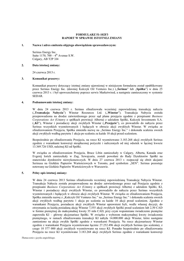 FORMULARZ 51-102F3 RAPORT W SPRAWIE ISTOTNEJ ZMIANY 1. Nazwa i adres emitenta objętego obowiązkiem sprawozdawczym: Serinus Energy Inc. Suite 1170, 700 – 4th Avenue S.W. Calgary, AB T2P 3J4 2. Data istotnej zmiany: 24 czerwca 2013 r. 3. Komunikat prasowy: Komunikat prasowy dotyczący istotnej zmiany ujawnionej w niniejszym formularzu został opublikowany przez Serinus Energy Inc. (dawniej Kulczyk Oil Ventures Inc.) („Serinus” lub „Spółka”) w dniu 25 czerwca 2013 r. i był upowszechniony poprzez serwis Marketwired, a następnie zamieszczony w systemie SEDAR. 4. Podsumowanie istotnej zmiany: W dniu 24 czerwca 2013 r. Serinus sfinalizowała wcześniej zapowiedzianą transakcję nabycia („Transakcja Nabycia”) Winstar Resources Ltd. („Winstar”). Transakcja Nabycia została przeprowadzona na drodze zatwierdzonego przez sąd planu przejęcia zgodnie z przepisami Business Corporations Act (Ustawy o spółkach prowincji Alberta) z udziałem Spółki, Kulczyk Investments S.A. („KI”), Winstar i posiadaczy akcji zwykłych Winstar („Przejęcie”), co prowadziło do nabycia przez Serinus wszystkich wyemitowanych i będących w obrocie akcji zwykłych Winstar. W związku ze sfinalizowaniem Przejęcia, Spółka zmieniła nazwę na „Serinus Energy Inc.” i dokonała scalenia swoich akcji zwykłych według parytetu 1 akcja po scaleniu za każde 10 akcji przed scaleniem. Bezpośrednio po sfinalizowaniu Przejęcia, na rzecz KI wyemitowano 3.183.268 akcji zwykłych Serinus zgodnie z warunkami konwersji niespłaconej pożyczki i naliczonych od niej odsetek w łącznej kwocie 13.369.726 USD, należnej KI od Spółki. W związku ze sfinalizowaniem Przejęcia, Bruce Libin zamieszkały w Calgary, Alberta, Kanada oraz Evgenij Iorich zamieszkały w Zug, Szwajcaria, zostali powołani do Rady Dyrektorów Spółki na stanowisko dyrektorów niewykonawczych. W dniu 27 czerwca 2013 r. rozpoczął się obrót akcjami Serinusa na Giełdzie Papierów Wartościowych w Toronto, pod symbolem „SEN”. Serinus pozostaje notowany na Giełdzie Papierów Wartościowych w Warszawie. 5. Pełny opis istotnej zmiany: W dniu 24 czerwca 2013 Serinus sfinalizowała wcześniej zapowiedzianą Transakcję Nabycia Winstar. Transakcja Nabycia została przeprowadzona na drodze zatwierdzonego przez sąd Przejęcia zgodnie z przepisami Business Corporations Act (Ustawy o spółkach prowincji Alberta) z udziałem Spółki, KI, Winstar i posiadaczy akcji zwykłych Winstar, co prowadziło do nabycia przez Serinus wszystkich wyemitowanych i będących w obrocie akcji zwykłych Winstar. W związku ze sfinalizowaniem Przejęcia, Spółka zmieniła nazwę z „Kulczyk Oil Ventures Inc.” na „Serinus Energy Inc.” i dokonała scalenia swoich akcji zwykłych według parytetu 1 akcja po scaleniu za każde 10 akcji przed scaleniem. Zgodnie z warunkami Przejęcia, posiadacze akcji zwykłych Winstar uprawnieni byli, wedle własnej decyzji, do otrzymania za każdą posiadaną akcję Winstar 7,555 akcji zwykłych Spółki przed scaleniem lub 2,50 CAD w formie pieniężnej do maksymalnej kwoty 35 mln CAD, przy czym wspomniane świadczenie pieniężne zapewniła KI – główny akcjonariusz Spółki. W związku z wyborem maksymalnej kwoty świadczenia pieniężnego, w ramach sfinalizowania transakcji KI nabyła 14.000.000 akcji Winstar, które następnie zamieniono na akcje zwykłe Spółki zgodnie z warunkami Przejęcia. Na rzecz akcjonariuszy Winstar zgodnie z warunkami Przejęcia wyemitowano łącznie 27.252.496 akcji zwykłych Serinus (po scaleniu), z czego 10 577 000 akcji zwykłych wyemitowano na rzecz KI. Ponadto bezpośrednio po sfinalizowaniu Przejęcia na rzecz KI wyemitowano 3.183.268 akcji zwykłych Serinus zgodnie z warunkami konwersji Tłumaczenie z języka angielskiego. niespłaconej pożyczki i naliczonych od niej odsetek w łącznej kwocie 13.369.726 USD, należnej KI od Spółki, o czym wcześniej Spółka informowała w komunikacie prasowym z dnia 9 maja 2013 r. Po wejściu w życie Przejęcia oraz konwersji wyżej wspomnianej pożyczki obecnie istnieje 78.611.437 wyemitowanych i będących w obrocie akcji zwykłych Serinus, z czego KI posiada 37.840.987 akcji zwykłych (48,1%).1 Ponadto w związku ze sfinalizowaniem Przejęcia Bruce Libin zamieszkały w Calgary, Alberta, Kanada oraz Evgenij Iorich zamieszkały w Zug, Szwajcaria, zostali powołani do Rady Dyrektorów Spółki na stanowisko dyrektorów niewykonawczych. Pan Libin był Przewodniczącym Rady Dyrektorów Winstar, a pan Iorich był członkiem Rady Dyrektorów Winstar. W dniu 27 czerwca 2013 r. rozpoczął się obrót akcjami Serinusa na Giełdzie Papierów Wartościowych w Toronto, pod symbolem „SEN”. Serinus pozostaje notowany na Giełdzie Papierów Wartościowych w Warszawie. 6. Zastosowanie przepisów art. 7 ust. 1 punkt 2) lub 3) Zarządzenia Krajowego nr 51-102 Nie ma zastosowania. 7. Informacje pominięte Nie ma zastosowania. 8. Dyrektor Wykonawczy Norman H. Holton Wiceprzewodniczący Rady Dyrektorów Tel: 403.264.8877 Fax: 403.264.8861 9. Data sporządzenia raportu 28 czerwca 2013 r. 1 KI – główny akcjonariusz Serinus – to międzynarodowy dom inwestycyjny założony przez polskiego biznesmena dra Jana Kluczyka, byłego Przewodniczącego Rady Dyrektorów Serinus. Dariusz Mioduski, obecny Przewodniczący Rady Dyrektorów Serinus, jest Dyrektorem Generalnym KI, a Manoj Madnani, członek Rady Dyrektorów Serinus, jest członkiem Zarządu KI. KI posiada obecnie 37.840.987 akcji Serinus, czyli ok. 48,1% wyemitowanych i będących w obrocie akcji Serinus. Ponadto Radwan Investments GmbH („Radwan”) posiada 2.662.836 akcji Serinus, czyli ok. 3,4% wyemitowanych i będących w obrocie akcji Serinus. Można uznać, że Radwan jest podmiotem działającym wspólnie z KI wskutek umowy datowanej na 15 września 2010 r. zawartej pomiędzy Radwan i KI, która uprawnia Radwan do udziału w określonej części inwestycji KI oraz stanowi, że Ra