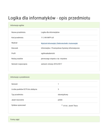 Logika dla informatyków - opis przedmiotu Informacje ogólne Nazwa przedmiotu Logika dla informatyków Kod przedmiotu 11.3-WI-INFP-LdI Wydział Wydział Informatyki, Elektrotechniki i Automatyki Kierunek Informatyka / Przemysłowe Systemy Informatyczne Profil ogólnoakademicki Rodzaj studiów pierwszego stopnia z tyt. inżyniera Semestr rozpoczęcia semestr zimowy 2016/2017 Informacje o przedmiocie Semestr 1 Liczba punktów ECTS do zdobycia 3 Typ przedmiotu obowiązkowy Język nauczania polski Sylabus opracował Formy zajęć dr inż. Jacek Tkacz Forma Liczba godzin w Liczba godzin w Liczba godzin w Liczba godzin w Forma zajęć semestrze tygodniu semestrze tygodniu zaliczenia (stacjonarne) (stacjonarne) (niestacjonarne) (niestacjonarne) 15 1 9 ,6 Wykład Zaliczenie na ocenę Ćwiczenia 30 2 18 1,2 Zaliczenie na ocenę Cel przedmiotu zapoznanie studentów z podstawami algebry Boole’a i rachunku zdań, zapoznanie studentów z metodami dowodzenie tautologii, zapoznanie studentów z wykorzystaniem logiki i teorii mnogości w informatyce. Wymagania wstępne Brak wymagań. Zakres tematyczny Rachunek zdań. Składnia i semantyka. Pojęcie tautologii. Metody dowodzenia tautologii. Prawa rachunku zadań. Zbiór i elementy zbioru. Definiowanie zbiorów. Podzbiory. Równość zbiorów. Operacje na zbiorach. Prawa teorii zbiorów i sposoby ich dowodzenia. Produkt kartezjański. Relacje. Rodzaje relacji. Operacje na relacjach i sposoby ich sprawdzania. Zastosowanie pojęcia relacji w informatyce. Algebra Boole’a. Funkcje logiczne. Minimalizacja funkcji logicznych. Metody reprezentacji funkcji logicznych (BDD). Badanie spełnialności funkcji logicznych. Logika i teoria mnogości w informatyce Elementy logiki symbolicznej i rachunku sekwentów. Metody kształcenia Wykład: wykład konwencjonalny/tradycyjny. Ćwiczenia: ćwiczenia praktyczne Efekty kształcenia i metody weryfikacji osiągania efektów kształcenia Opis efektu Symbole efektów Potrafi praktycznie wykorzystać logikę oraz K_W01 teorię mnogości w informatyce K_U01 Metody weryfikacji Forma zajęć sprawdzian Ćwiczenia Wykład K_U05 K_K01 Zna i potrafi interpretować pojęcia z zakresu K_W01 sprawdzian logiki i teorii mnogości oraz potrafi je K_U05 test zastosować w problemach informatycznych. K_K01 Potrafi stosować aparat logiki, dowodzenia K_W01 sprawdzian twierdzeń oraz teorii grafów i rekurencji do K_U05 test świadomego rozwiązywania problemów o K_K01 Wykład charakterze informatycznym. Warunki zaliczenia Wykład - warunkiem zaliczenia jest uzyskanie pozytywnych ocen z kolokwiów pisemnych lub ustnych przeprowadzonych co najmniej raz w semestrze. Ćwiczenia – warunkiem zaliczenia jest uzyskanie pozytywnych ocen z pisemnych sprawdzianów tematycznych. Składowe oceny końcowej = wykład: 50% + ćwiczenia: 50% Obciążenie pracą Obciążenie pracą Studia Studia niestacjonarne stacjonarne (w godz.) (w godz.) Godziny kontaktowe (udział w zajęciach; konsultacjach; egzaminie, itp.) 45 27 Samodzielna praca studenta (przygotowanie do: zajęć, kolokwium, 30 48 Łącznie 75 75 Punkty ECTS Studia Studia niestacjonarne egzaminu; studiowanie literatury przygotowanie: pracy pisemnej, projektu, prezentacji, raportu, wystąpienia; itp.) stacjonarne Zajęcia z udziałem nauczyciela akademickiego 2 1 Zajęcia bez udziału nauczyciela akademickiego 1 2 Łącznie 3 3 Literatura podstawowa 1. Huzar Z.: Elementy logiki i teorii mnogości dla informatyków, Wydawnictwa Politechniki Wrocławskiej, Wrocław, 2007. 2. Ross K.A., Wright Ch.R.B.: Matematyka dyskretna, Wydawnictwo Naukowe PWN, Warszawa, 2006 (rozdz. 1, 2, 3,10). 3. Ławrow I.A, Maksimowa Ł.R: Zadania z teorii mnogości, logiki matematycznej i teorii algorytmów, Wydawnictwo Naukowe PWN, Warszawa, 2004. 4. Ben Ari M.: Logika matematyczna w informatyce, WNT, Warszawa, 2005. Literatura uzupełniająca 1. Papadimitriou H.: Złożoność obliczeniowa, WNT, Warszawa, 2002 (cz. 2 Logika). 2. Tiuryn J.: Wstęp do teorii mnogości i logiki, Wydział Matematyki, Informatyki i Mechaniki, Uniwersytet Warszawski, 1998 (podręcznik internetowy). 3. Majewski W.: Układy logiczne, Wydawnictwa Komunikacji i Łączności, 2000. Uwagi Zmodyfikowane przez dr hab. inż. Krzysztof Patan, prof. UZ (ostatnia modyfikacja: 22-09-2016 21:21)