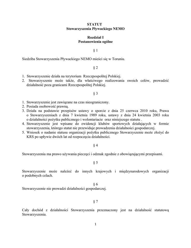 STATUT Stowarzyszenia Pływackiego NEMO Rozdział I