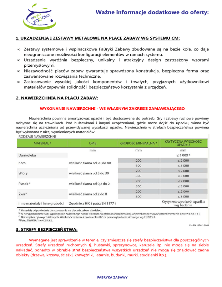 Ważne informacje dodatkowe do oferty: oferty 1. URZĄDZENIA I ZESTAWY METALOWE NA PLACE ZABAW WG SYSTEMU CM: • • • • Zestawy systemowe i wspinaczkowe FaBryki Zabawy zbudowane są na bazie koła, co daje nieograniczone możliwości konfiguracji elementów w ramach systemu. Urządzenia wyróżnia bezpieczny, unikalny i atrakcyjny design zastrzeżony wzorami przemysłowymi. Niezawodność placów zabaw gwarantuje sprawdzona sprawdzona konstrukcja, bezpieczna forma oraz zaawansowane rozwiązania techniczne. Zastosowanie wysokiej jakości komponentów i trwałych, przyjaznych użytkownikowi materiałów zapewnia solidność i bezpieczeństwo korzystania z urządzeń. 2. NAWIERZCHNIA NA PLACU ZABAW: ZABAW WYKONANIE NAWIERZCHNI - WE WŁASNYM ZAKRESIE ZAMAWIAJĄCEGO Nawierzchnia powinna amortyzować upadki i być dostosowana do potrzeb. Gry i zabawy ruchowe powinny odbywać się na trawnikach. Pod huśtawkami i innymi urządzeniami, gdzie może dojść do upadku, winna być nawierzchnia uzależniona od przewidywanej wysokości upadku. Nawierzchnia w strefach bezpieczeństwa powinna być wykonana z niżej wymienionych materiałów: PN-EN 1176-1:2009 3. STREFY BEZPIECZEŃSTWA: Wymagane jest sprawdzenie w terenie, czy zmieszczą się strefy bezpieczeństwa dla poszczególnych urządzeń. Strefy urządzeń ruchomych tj. huśtawki, sprężynowce, karuzele itp. nie mogą się na siebie nakładać, ponadto w obrębie stref bezpieczeństwa wszystkich urządzeń nie mogą się znajdować żadne obiekty (drzewa, krzewy, ścieżki, krawężniki, latarnie, budynki, murki, studzienki itp.). itp.) FABRYKA ZABAWY
