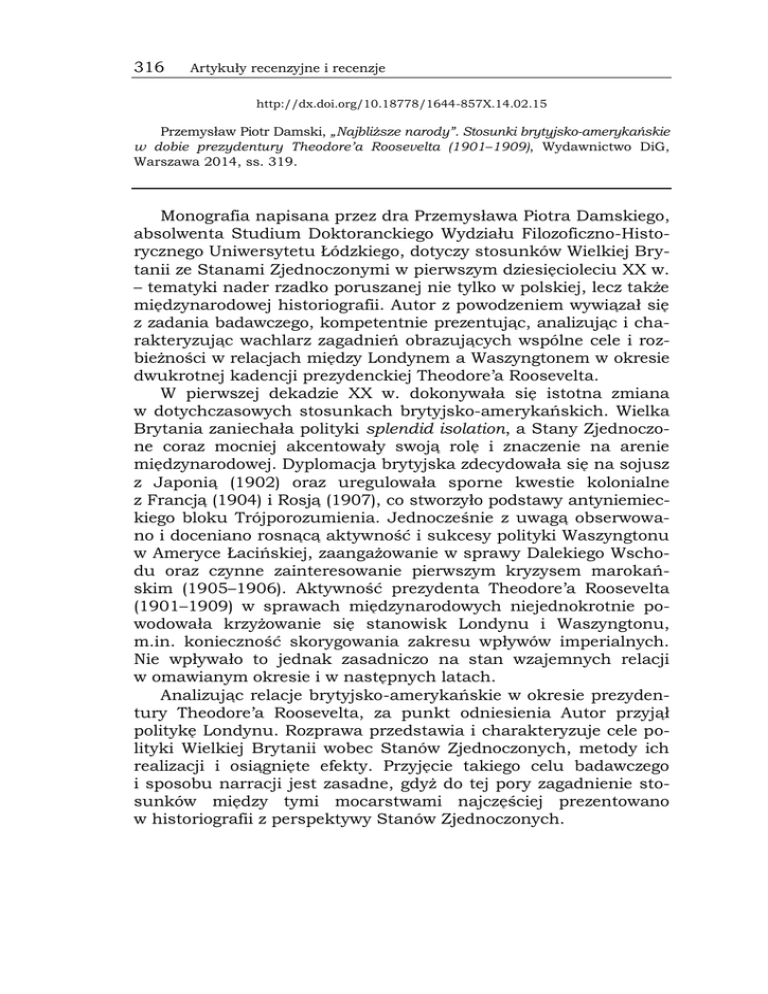 316 Artykuły recenzyjne i recenzje http://dx.doi.org/10.18778/1644-857X.14.02.15 Przemysław Piotr Damski, „Najbliższe narody”. Stosunki brytyjsko-amerykańskie w dobie prezydentury Theodore’a Roosevelta (1901–1909), Wydawnictwo DiG, Warszawa 2014, ss. 319. Monografia napisana przez dra Przemysława Piotra Damskiego, absolwenta Studium Doktoranckiego Wydziału Filozoficzno-Historycznego Uniwersytetu Łódzkiego, dotyczy stosunków Wielkiej Brytanii ze Stanami Zjednoczonymi w pierwszym dziesięcioleciu XX w. – tematyki nader rzadko poruszanej nie tylko w polskiej, lecz także międzynarodowej historiografii. Autor z powodzeniem wywiązał się z zadania badawczego, kompetentnie prezentując, analizując i charakteryzując wachlarz zagadnień obrazujących wspólne cele i rozbieżności w relacjach między Londynem a Waszyngtonem w okresie dwukrotnej kadencji prezydenckiej Theodore’a Roosevelta. W pierwszej dekadzie XX w. dokonywała się istotna zmiana w dotychczasowych stosunkach brytyjsko-amerykańskich. Wielka Brytania zaniechała polityki splendid isolation, a Stany Zjednoczone coraz mocniej akcentowały swoją rolę i znaczenie na arenie międzynarodowej. Dyplomacja brytyjska zdecydowała się na sojusz z Japonią (1902) oraz uregulowała sporne kwestie kolonialne z Francją (1904) i Rosją (1907), co stworzyło podstawy antyniemieckiego bloku Trójporozumienia. Jednocześnie z uwagą obserwowano i doceniano rosnącą aktywność i sukcesy polityki Waszyngtonu w Ameryce Łacińskiej, zaangażowanie w sprawy Dalekiego Wschodu oraz czynne zainteresowanie pierwszym kryzysem marokańskim (1905–1906). Aktywność prezydenta Theodore’a Roosevelta (1901–1909) w sprawach międzynarodowych niejednokrotnie powodowała krzyżowanie się stanowisk Londynu i Waszyngtonu, m.in. konieczność skorygowania zakresu wpływów imperialnych. Nie wpływało to jednak zasadniczo na stan wzajemnych relacji w omawianym okresie i w następnych latach. Analizując relacje brytyjsko-amerykańskie w okresie prezydentury Theodore’a Roosevelta, za punkt odniesienia Autor przyjął politykę Londynu. Rozprawa przedstawia i charakteryzuje cele polityki Wielkiej Brytanii wobec Stanów Zjednoczonych, metody ich realizacji i osiągnięte efekty. Przyjęcie takiego celu badawczego i sposobu narracji jest zasadne, gdyż do tej pory zagadnienie stosunków między tymi mocarstwami najczęściej prezentowano w historiografii z perspektywy Stanów Zjednoczonych. Artykuły recenzyjne i recenzje 317 Podane w tytule książki określenie „najbliższe narody” wskazuje na występujący wśród niektórych polityków brytyjskich pogląd o szczególnym charakterze relacji między Brytyjczykami i Amerykanami jako narodami anglojęzycznymi. Autor zaznaczył we Wstępie, że w najnowszej historiografii „szczególny związek” obu narodów jest postrzegany raczej jako mit. Słusznie jednak zauważył, że niezależnie od czynników przemawiających za realnością takiej koncepcji lub przeciw niej, musiały zaistnieć podstawy do jej sformułowania. W latach trzydziestych XX w. Austen Chamberlain, konserwatysta, szef Foreign Office (1924–1929), uważał, że współpraca Wielkiej Brytanii ze Stanami Zjednoczonymi na arenie międzynarodowej ma charakter naturalny, wynikający z bliskości obu narodów. Jeszcze wyraźniej zaznaczył to Winston Churchill, przemawiając w Westminster College w Fulton (Missouri) 5 marca 1946 r. Jego wystąpienie, w którym użył metafory o żelaznej kurtynie dzielącej świat na dwa wrogie obozy, podkreślało znaczenie współpracy brytyjsko-amerykańskiej dla utrzymania powszechnego pokoju. Churchill powiedział wtedy, że „związek braterstwa narodów anglojęzycznych” stanowi o „szczególnym związku” Wielkiej Brytanii ze Stanami Zjednoczonymi. Przemysław Piotr Damski oparł rozprawę na bardzo bogatym i różnorodnym materiale źródłowym, głównie brytyjskim i amerykańskim. Szczególnie ważna okazała się kwerenda w The National Archives w Kew (dawniej Public Record Office), głównym państwowym archiwum Wielkiej Brytanii, oraz w Oddziale Rękopisów The British Library w Londynie. Szczegółowe zapoznanie się z dokumentami i korespondencją premierów (Arthur Balfour, Henry Campbell-Bennerman) i szefów Foreign Office (Henry Petty-Fitzmaurice, markiz Lansdowne, Edward Grey) pozwoliło Autorowi prześledzić proces podejmowania decyzji w dyplomacji brytyjskiej i innych strukturach władzy w Londynie. Istotna była też kwerenda w Roosevelt Study Center w Middelburgu w Holandii, gdzie dr P.P. Damski skorzystał z mikrofilmów prywatnych papierów prezydentów Theodore’a Roosevelta i Williama Tafta. Wartościowym uzupełnieniem badań w zasobach archiwalnych było sięgnięcie do wydawnictw dokumentów dyplomatycznych brytyjskich (British Documents on the Origins of the War, British Documents on Foreign Affairs) i amerykańskich (Papers Relating to the Foreign Relations of the United States) oraz – w mniejszym zakresie – niemieckich, francuskich i japońskich. Kolejną grupę wykorzystanych przez Autora źródeł stanowiła opublikowana korespondencja, pamiętniki i dzien- 318 Artykuły recenzyjne i recenzje niki polityków i dyplomatów brytyjskich i amerykańskich, a także niemieckich, rosyjskich, francuskich i japońskich. Bazę źródłową rozprawy dopełniają stenogramy posiedzeń parlamentu brytyjskiego i amerykańskiego oraz prasa, zwłaszcza „The New York Times” i „The Times”. Autor wykazał się dogłębną znajomością literatury na temat brytyjskiej i amerykańskiej polityki zagranicznej oraz wzajemnych relacji między Londynem a Waszyngtonem w pierwszej dekadzie XX w. We Wstępie monografii dokonał kompetentnej charakterystyki prac, które ukazały się na ten temat w Stanach Zjednoczonych, Wielkiej Brytanii i w innych krajach. Omówił również biografie polityków i dyplomatów obu mocarstw, zwracając uwagę na ogromną 