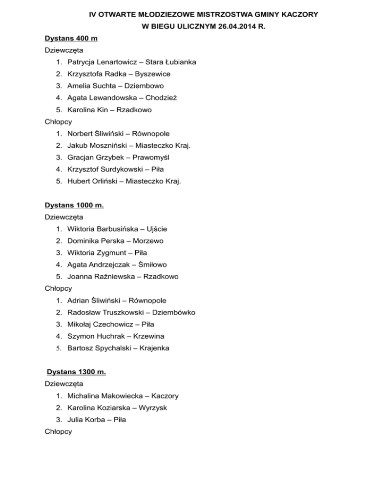 IV OTWARTE MŁODZIEZOWE MISTRZOSTWA GMINY KACZORY W BIEGU ULICZNYM 26.04.2014 R. Dystans 400 m Dziewczęta 1. Patrycja Lenartowicz – Stara Łubianka 2. Krzysztofa Radka – Byszewice 3. Amelia Suchta – Dziembowo 4. Agata Lewandowska – Chodzież 5. Karolina Kin – Rzadkowo Chłopcy 1. Norbert Śliwiński – Równopole 2. Jakub Moszniński – Miasteczko Kraj. 3. Gracjan Grzybek – Prawomyśl 4. Krzysztof Surdykowski – Piła 5. Hubert Orliński – Miasteczko Kraj. Dystans 1000 m. Dziewczęta 1. Wiktoria Barbusińska – Ujście 2. Dominika Perska – Morzewo 3. Wiktoria Zygmunt – Piła 4. Agata Andrzejczak – Śmiłowo 5. Joanna Raźniewska – Rzadkowo Chłopcy 1. Adrian Śliwiński – Równopole 2. Radosław Truszkowski – Dziembówko 3. Mikołaj Czechowicz – Piła 4. Szymon Huchrak – Krzewina 5. Bartosz Spychalski – Krajenka Dystans 1300 m. Dziewczęta 1. Michalina Makowiecka – Kaczory 2. Karolina Koziarska – Wyrzysk 3. Julia Korba – Piła Chłopcy 1. Kacper Pazdej – Dziembowo 2. Maciej Lisek – Morzewo 3. Patryk Perski – Morzewo 4. Wojciech Kończak – Kaczory 5. Łukasz Sikora – Stara Łubianka