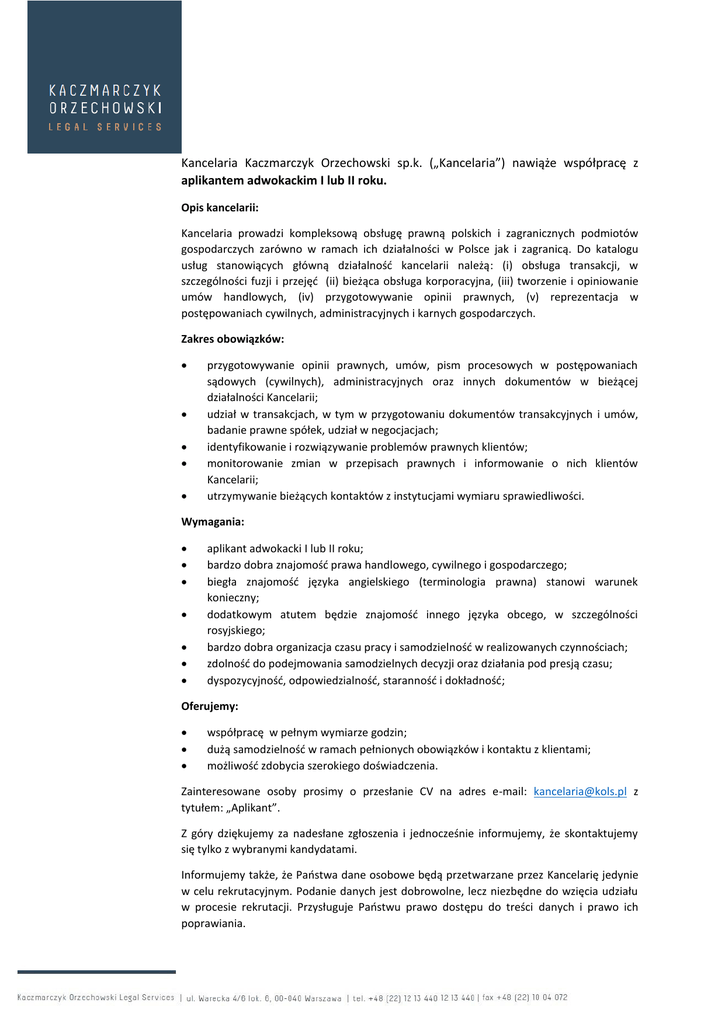 Kancelaria Kaczmarczyk Orzechowski sp.k. („Kancelaria”) nawiąże współpracę z aplikantem adwokackim I lub II roku. Opis kancelarii: Kancelaria prowadzi kompleksową obsługę prawną polskich i zagranicznych podmiotów gospodarczych zarówno w ramach ich działalności w Polsce jak i zagranicą. Do katalogu usług stanowiących główną działalność kancelarii należą: (i) obsługa transakcji, w szczególności fuzji i przejęć (ii) bieżąca obsługa korporacyjna, (iii) tworzenie i opiniowanie umów handlowych, (iv) przygotowywanie opinii prawnych, (v) reprezentacja w postępowaniach cywilnych, administracyjnych i karnych gospodarczych. Zakres obowiązków: przygotowywanie opinii prawnych, umów, pism procesowych w postępowaniach sądowych (cywilnych), administracyjnych oraz innych dokumentów w bieżącej działalności Kancelarii; udział w transakcjach, w tym w przygotowaniu dokumentów transakcyjnych i umów, badanie prawne spółek, udział w negocjacjach; identyfikowanie i rozwiązywanie problemów prawnych klientów; monitorowanie zmian w przepisach prawnych i informowanie o nich klientów Kancelarii; utrzymywanie bieżących kontaktów z instytucjami wymiaru sprawiedliwości. Wymagania: aplikant adwokacki I lub II roku; bardzo dobra znajomość prawa handlowego, cywilnego i gospodarczego; biegła znajomość języka angielskiego (terminologia prawna) stanowi warunek konieczny; dodatkowym atutem będzie znajomość innego języka obcego, w szczególności rosyjskiego; bardzo dobra organizacja czasu pracy i samodzielność w realizowanych czynnościach; zdolność do podejmowania samodzielnych decyzji oraz działania pod presją czasu; dyspozycyjność, odpowiedzialność, staranność i dokładność; Oferujemy: współpracę w pełnym wymiarze godzin; dużą samodzielność w ramach pełnionych obowiązków i kontaktu z klientami; możliwość zdobycia szerokiego doświadczenia. Zainteresowane osoby prosimy o przesłanie CV na adres e-mail: [email protected] z tytułem: „Aplikant”. Z góry dziękujemy za nadesłane zgłoszenia i jednocześnie informujemy, że skontaktujemy się tylko z wybranymi kandydatami. Informujemy także, że Państwa dane osobowe będą przetwarzane przez Kancelarię jedynie w celu rekrutacyjnym. Podanie danych jest dobrowolne, lecz niezbędne do wzięcia udziału w procesie rekrutacji. Przysługuje Państwu prawo dostępu do treści danych i prawo ich poprawiania.